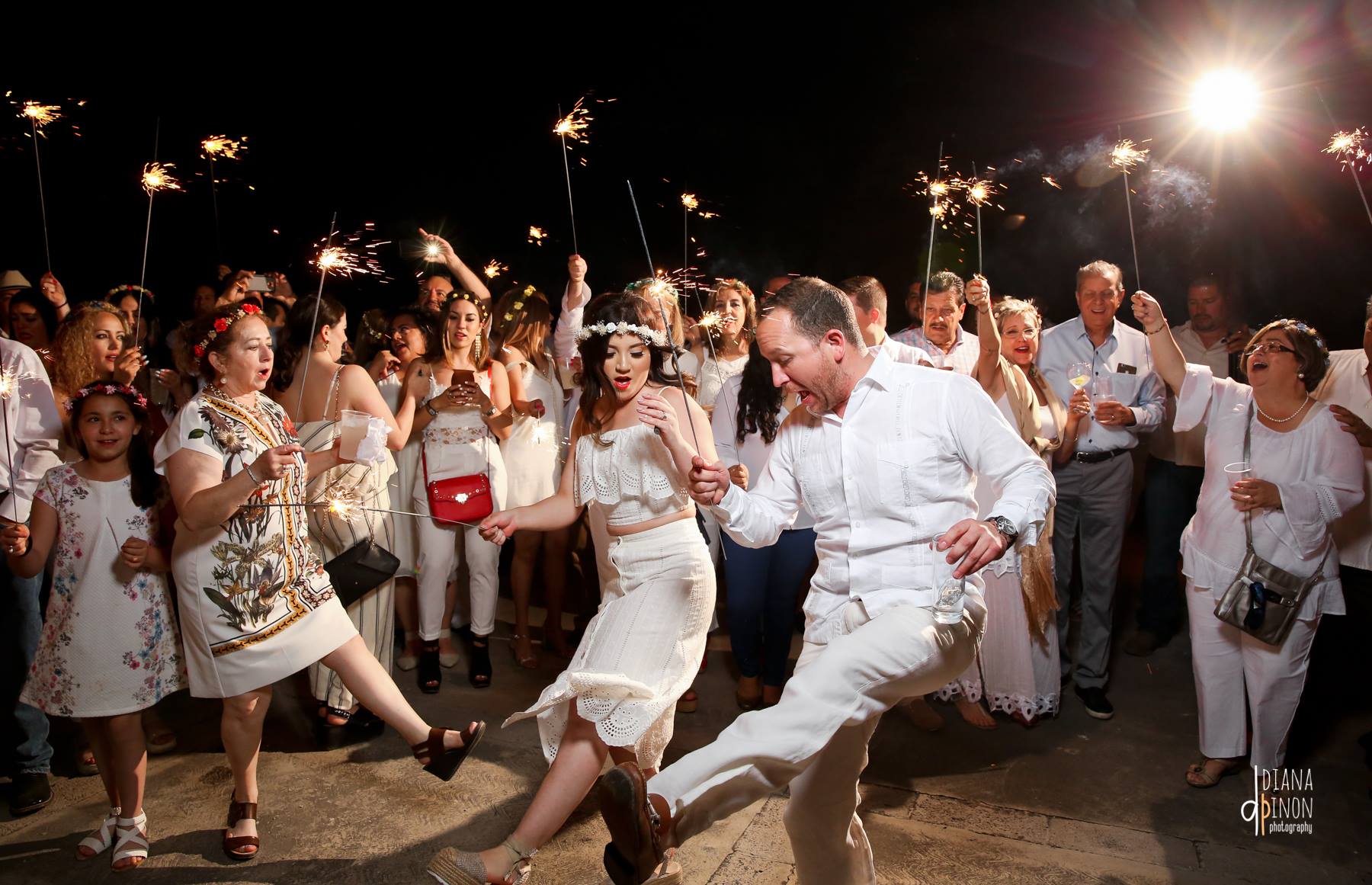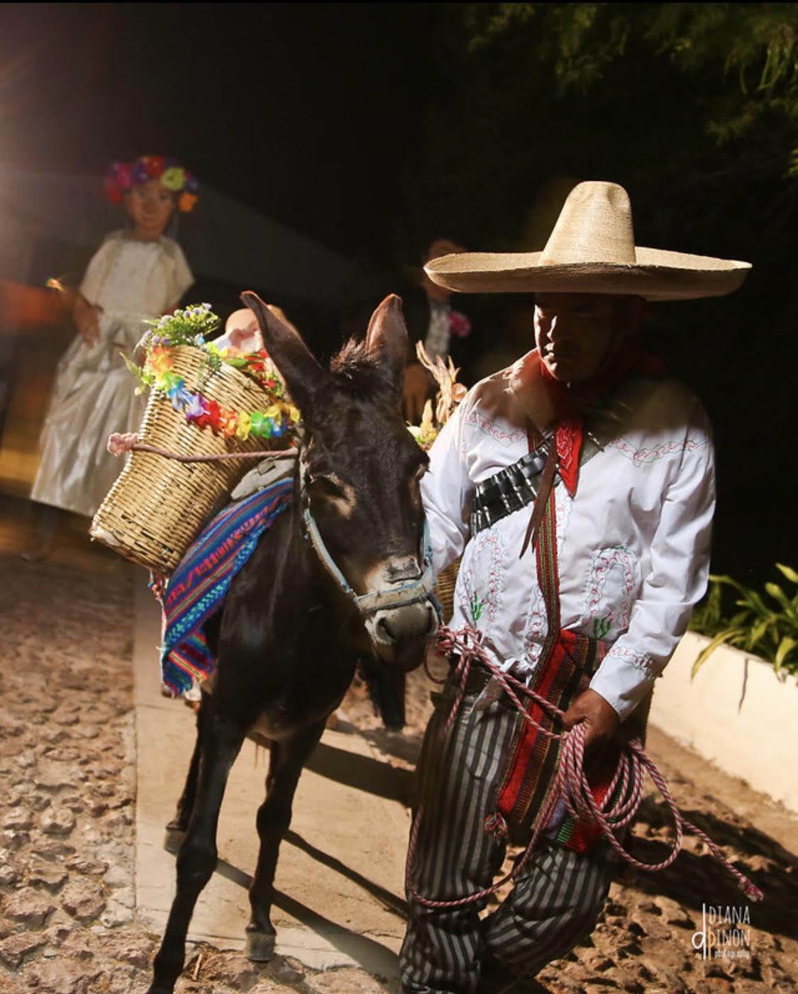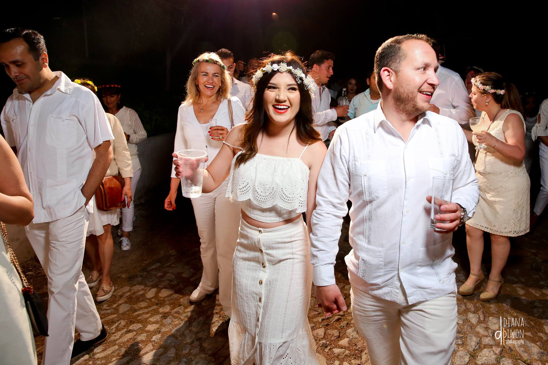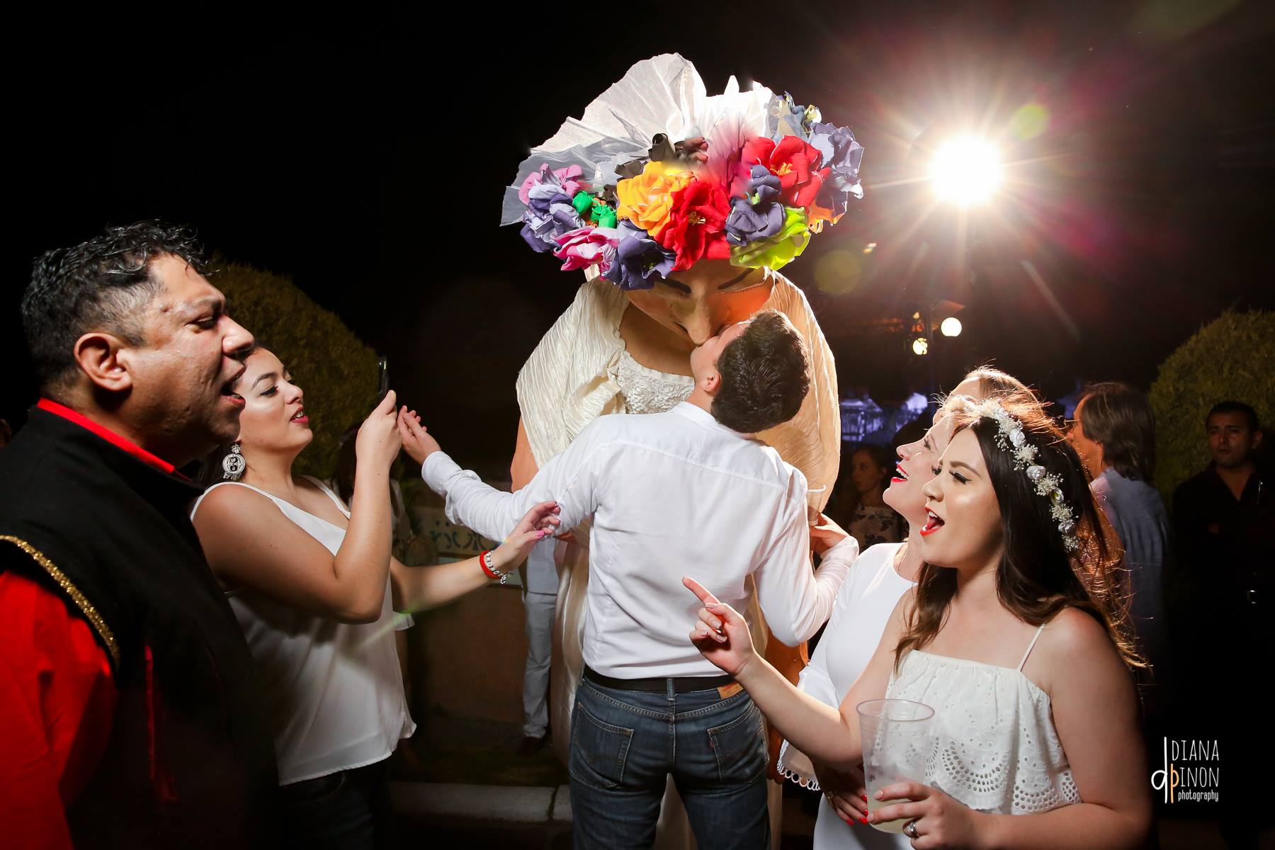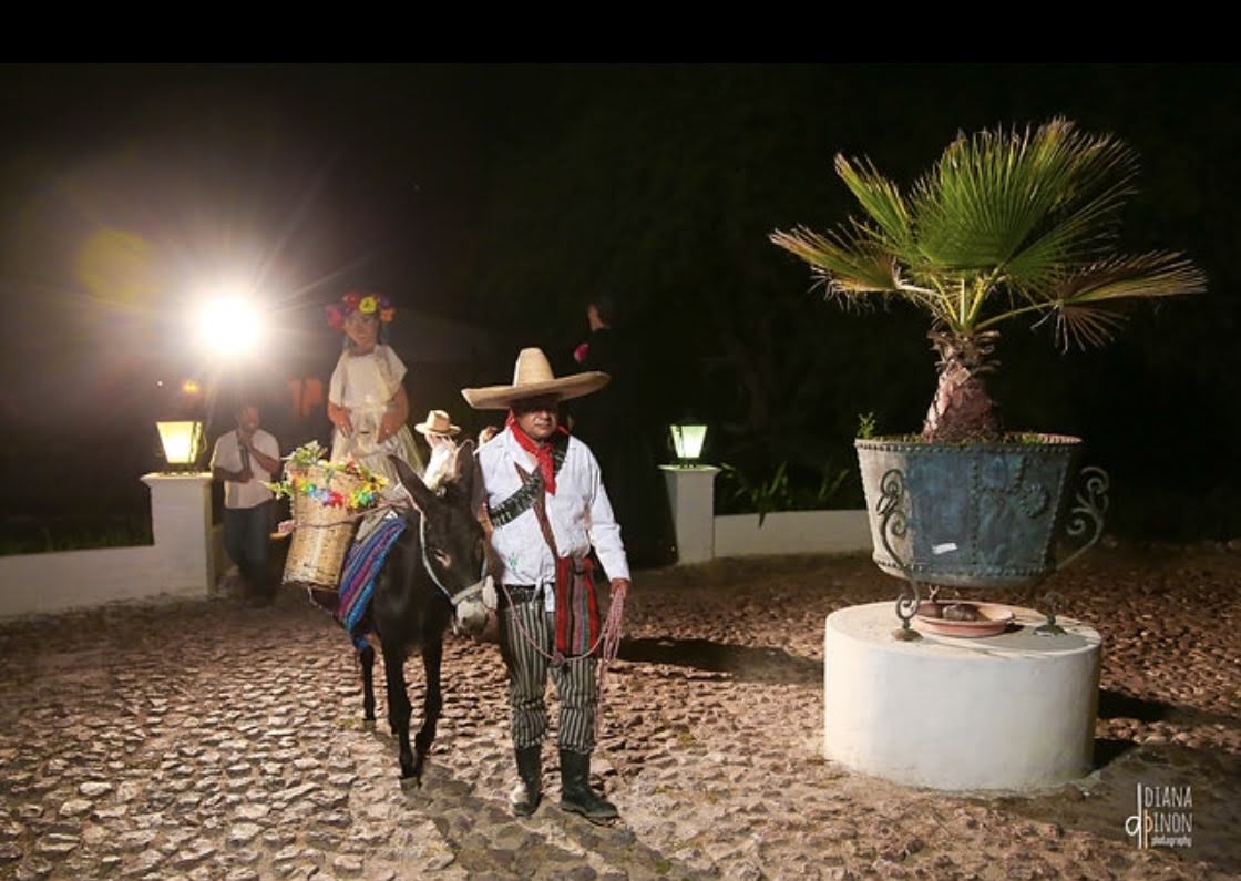 El viernes organizamos un rompe hielo con toque mexicano en un pequeño quiosco de la hacienda, mesas periqueras arriba y alrededor, una callejoneada al atardecer desde el quiosco hasta la plazuela por un caminito colonial, guiados por un burrito tequilero, una alegre estudiantina y cuatro novios que no dejaron de bailar todo el camino: Laura y Eduardo y dos mojigangas representándolos. Al llegar (y ya a punto de oscurecer) encendimos bengalas para que siguiera la fiesta, todos alrededor de los novios bailando, saltando y cantando de alegría. ¡WOW!