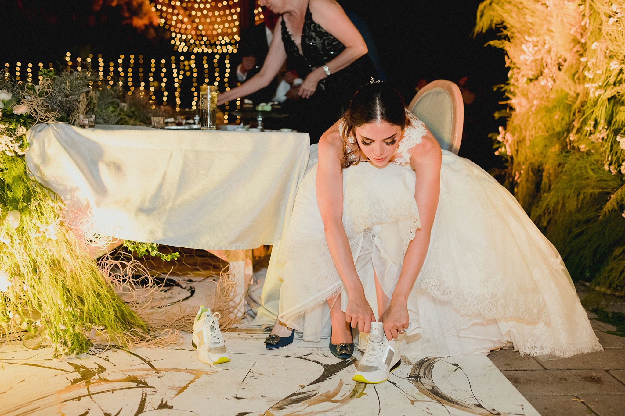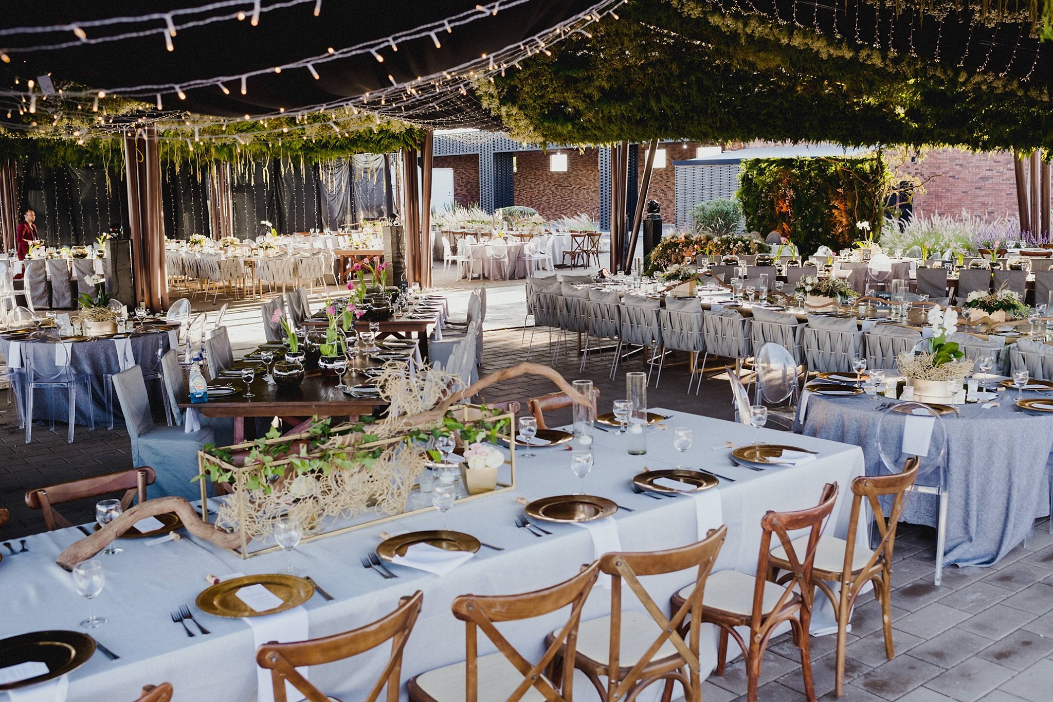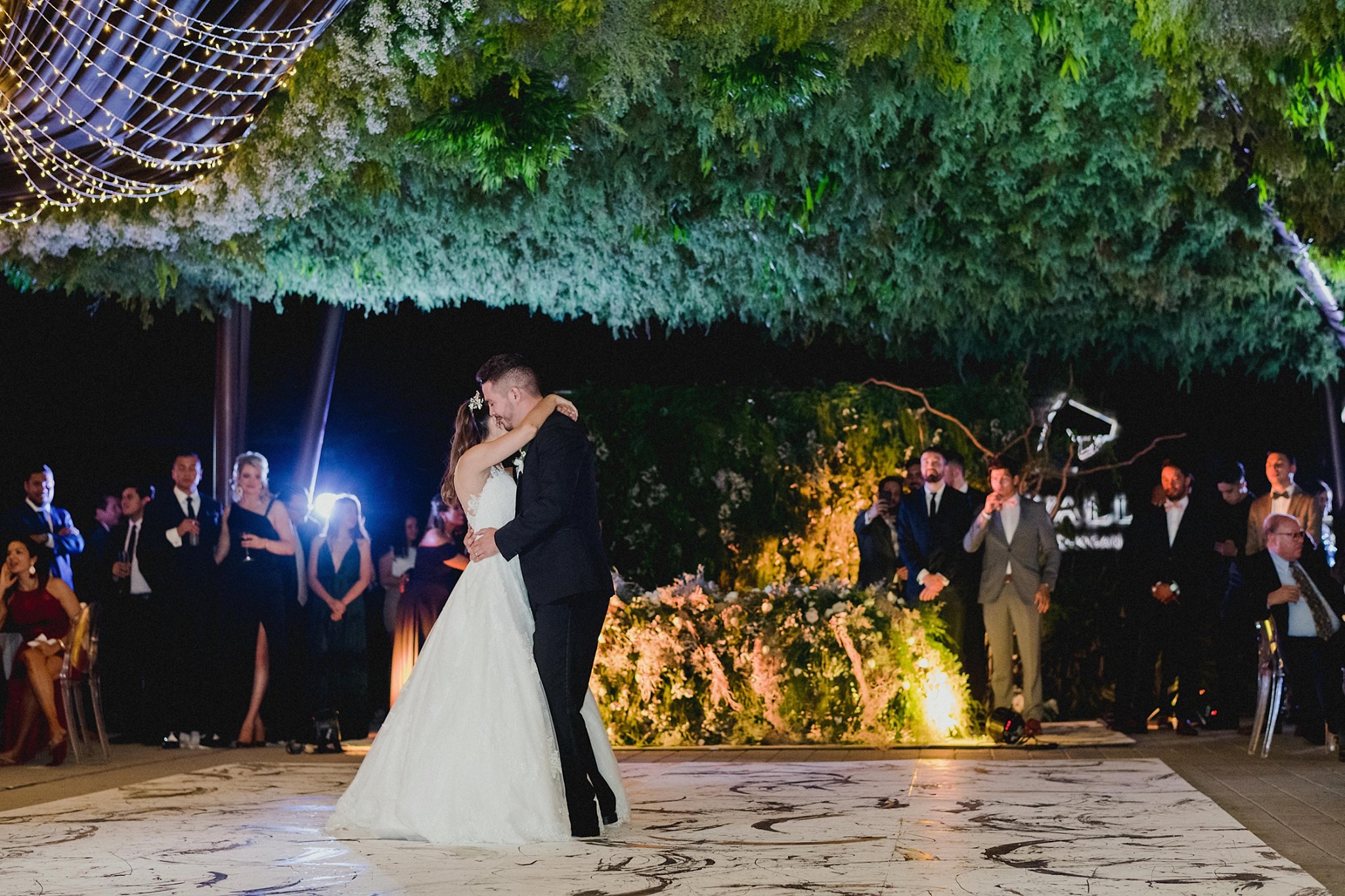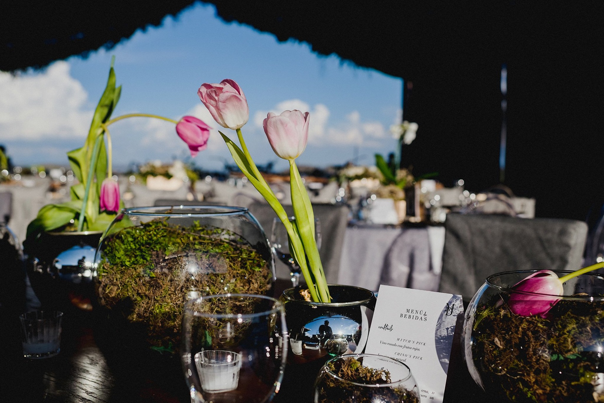 Un arco con vegetación marcaba el camino hacia la recepción. Bajo el cielo verde, mesas imperiales rectangulares y angulares personalizadas con detalles alusivos al lugar, caminos de tulipanes con burbujas de musgo y velas flotantes; enredaderas de vid con rosas y orquídeas. Para el back de novios una porción vertical del jardín invertido y una pista pintada a mano completaban el espacio en perfecto equilibrio.