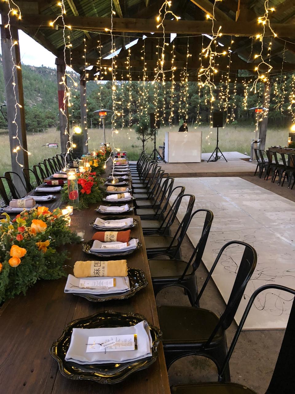 Los invitados eran agasajados a su llegada con una canastita lindísima cortesía de los novios y para los que llegaron el día previo, organizamos una cena en un salon de piedra y ladrillo, dos mesas largas decoradas con jarros, hojas de pino y lámparas de petróleo. Súper ad hoc para la ocasión.