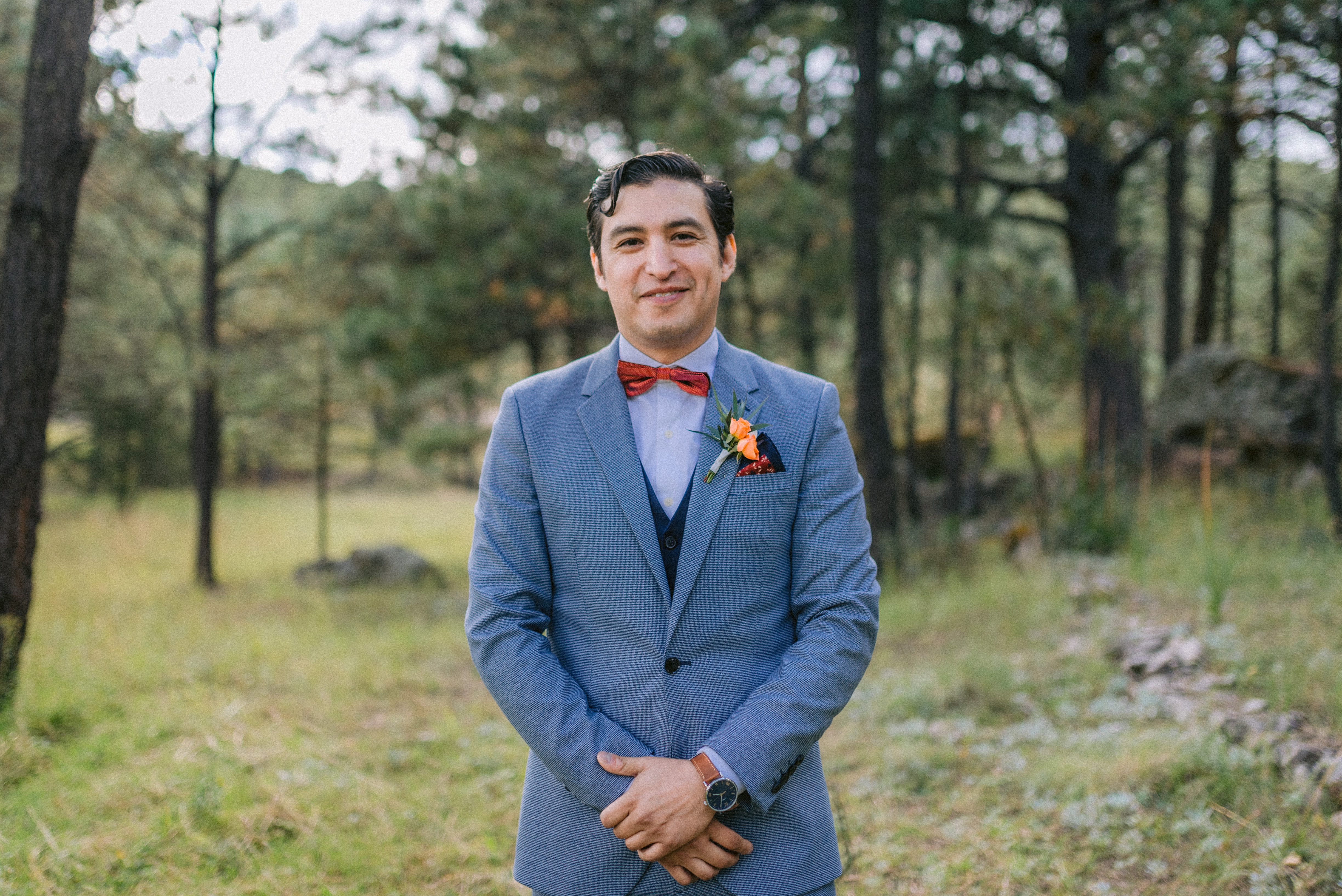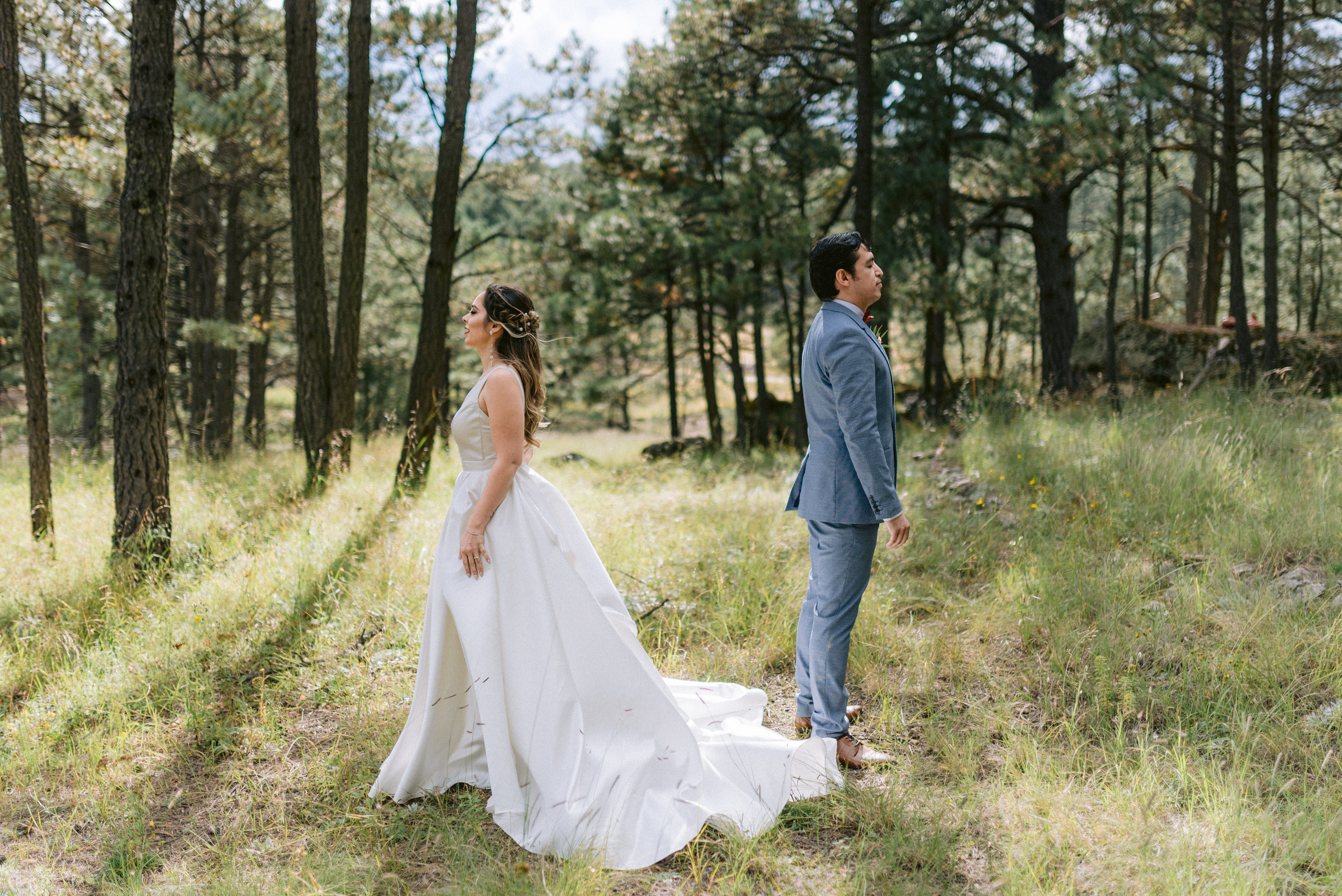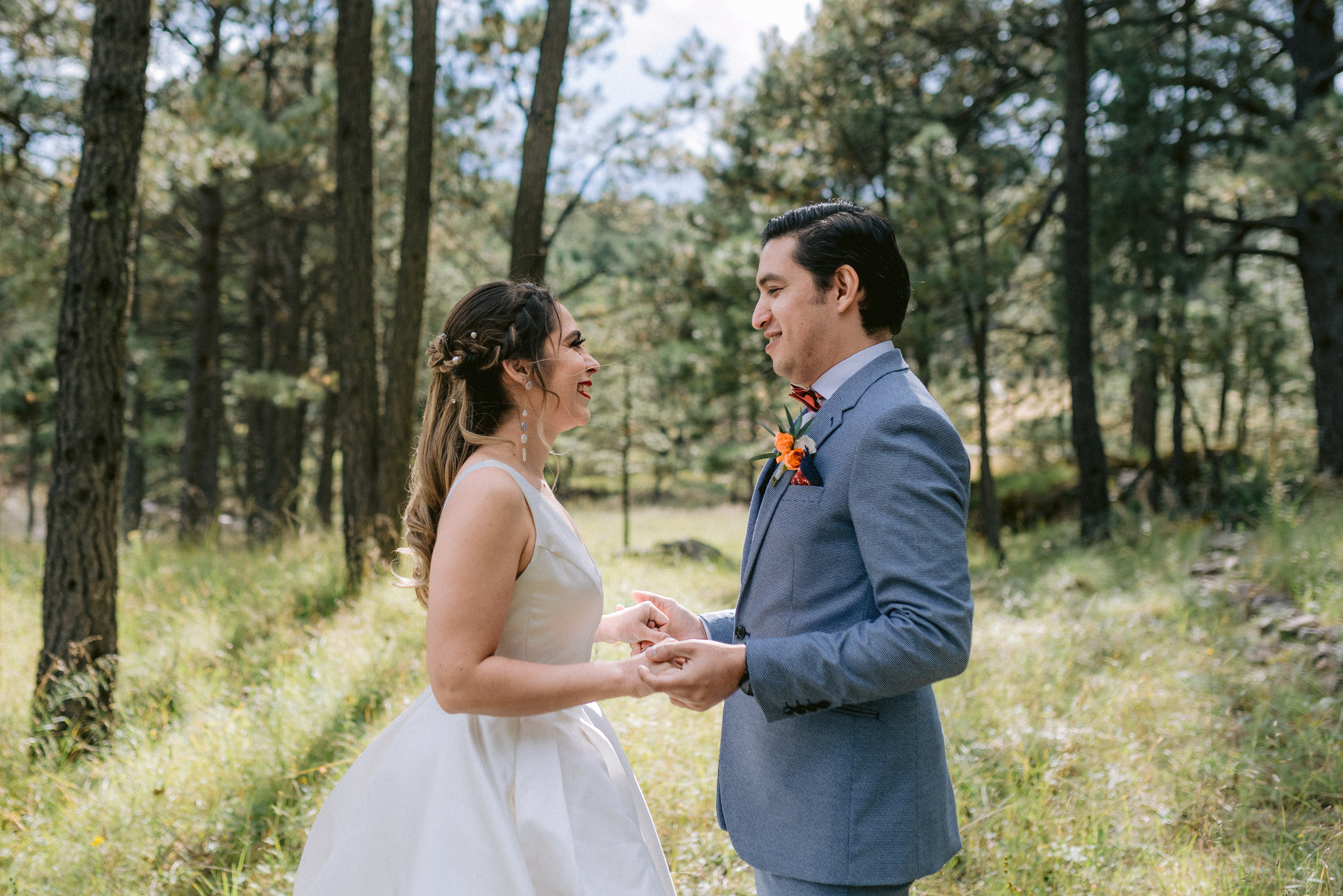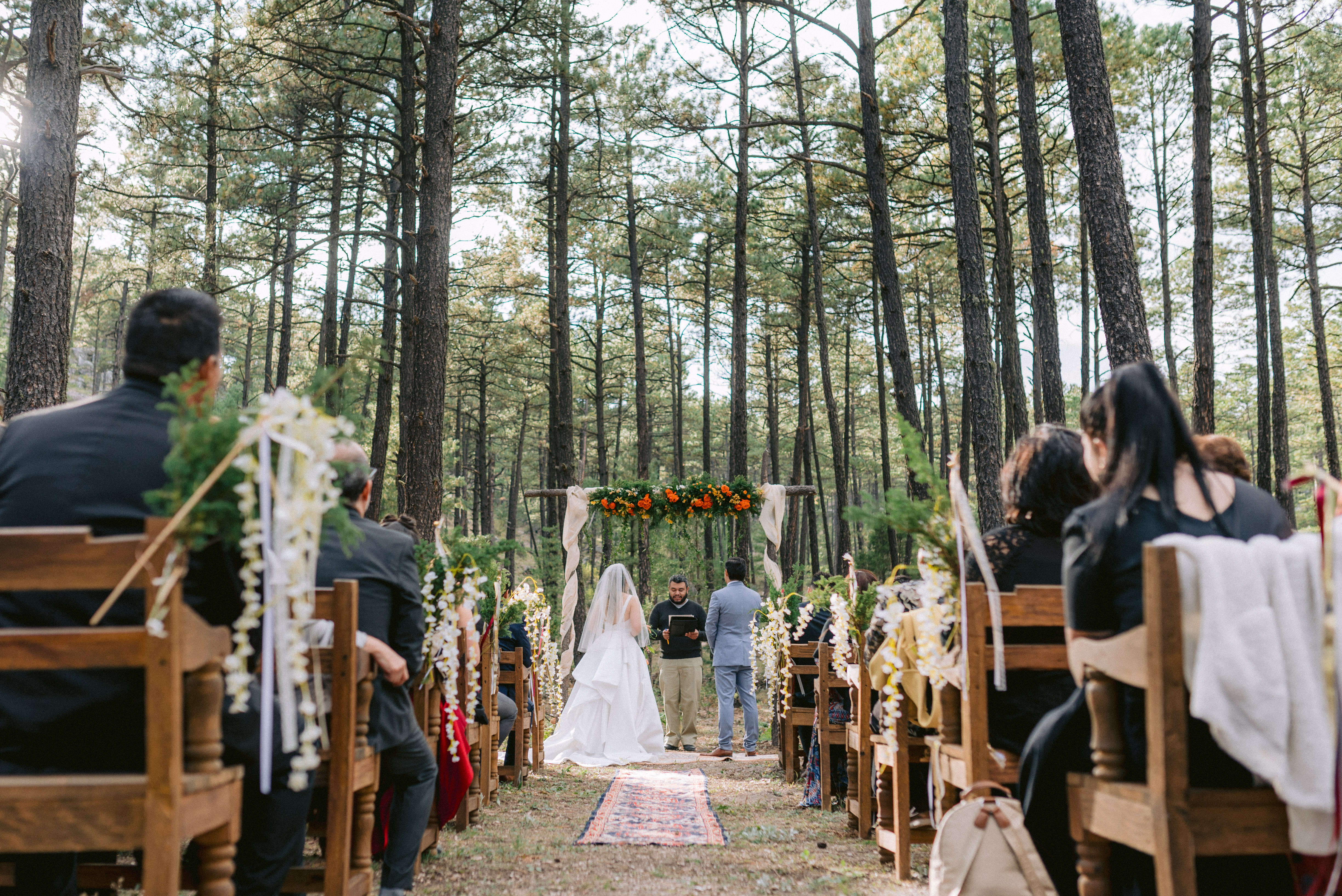 La ceremonia fue un momento incomparable: un camino señalado entre la espesura del bosque hasta llegar a un claro bordeado por pinos altísimos seguidos de una pared de rocas que convertían el paisaje en una pintura. Justo ahí un arco de madera decorado con telas y flores, donde Javier esperaba la llegada de Mariana vestida completamente de blanco entre todo el verde que convergía a su alrededor, estaban perfectos. Y todo quedo inmortalizado en la fotazas que les hizo María Vega Fotografía. Chéquenlas al final.
