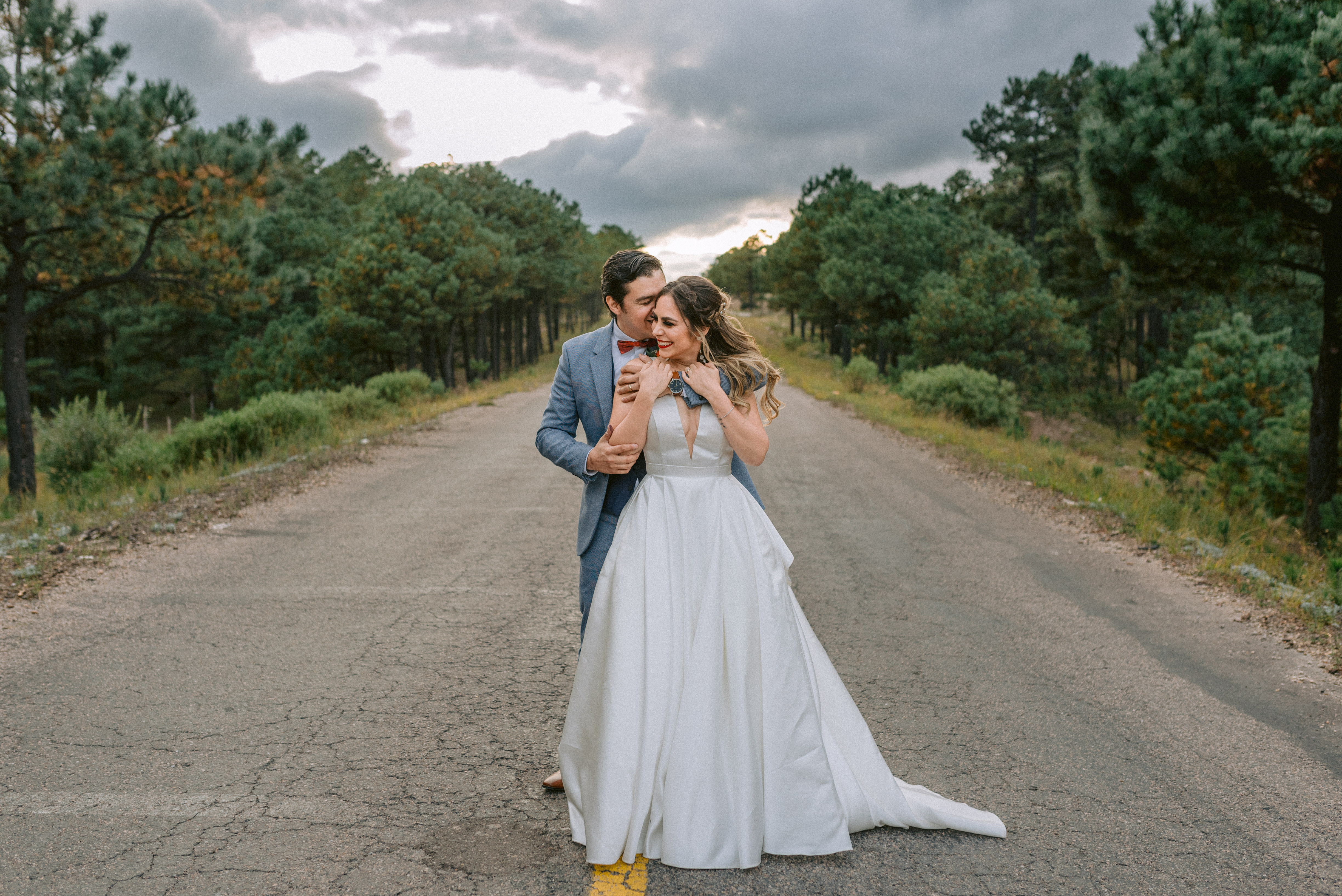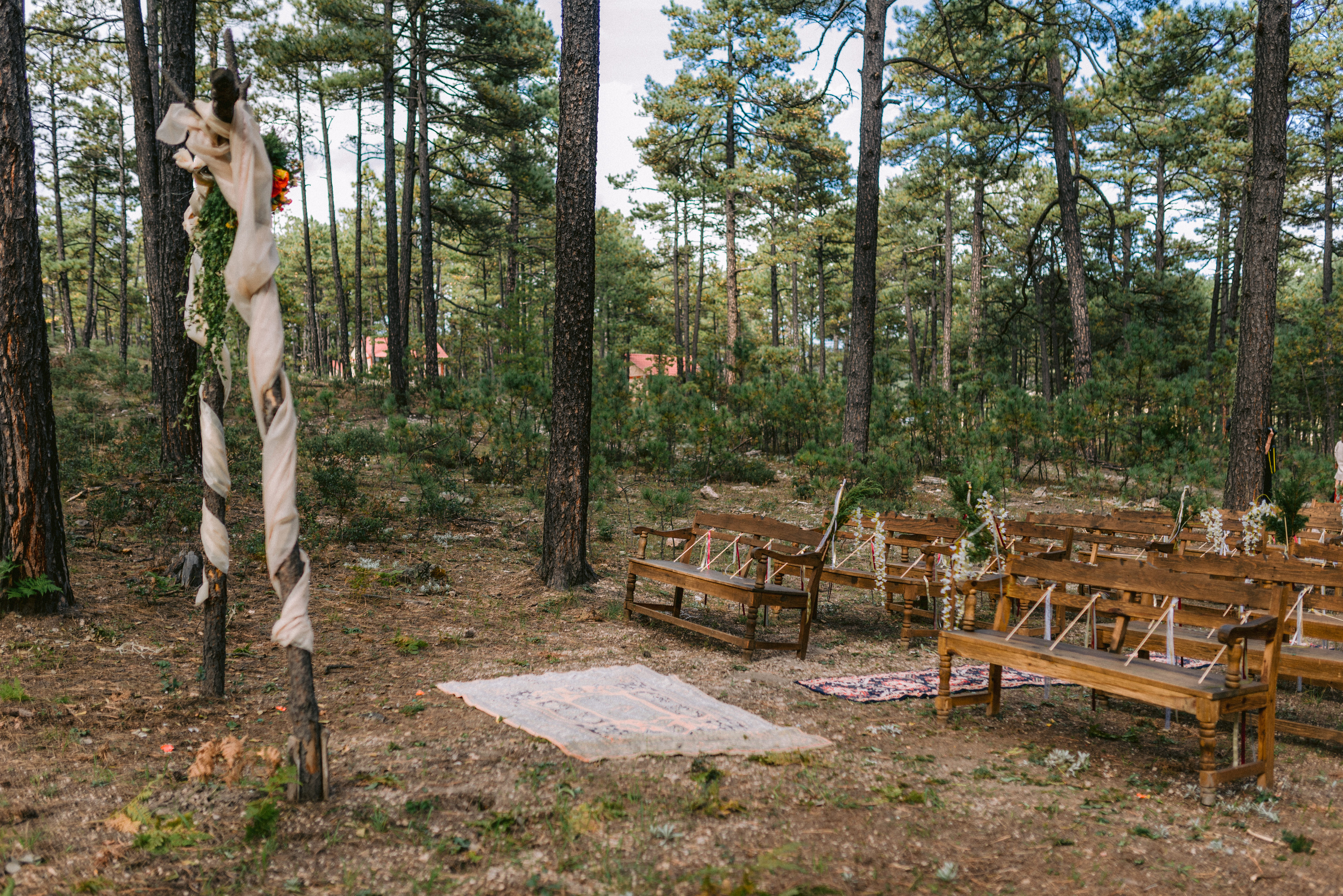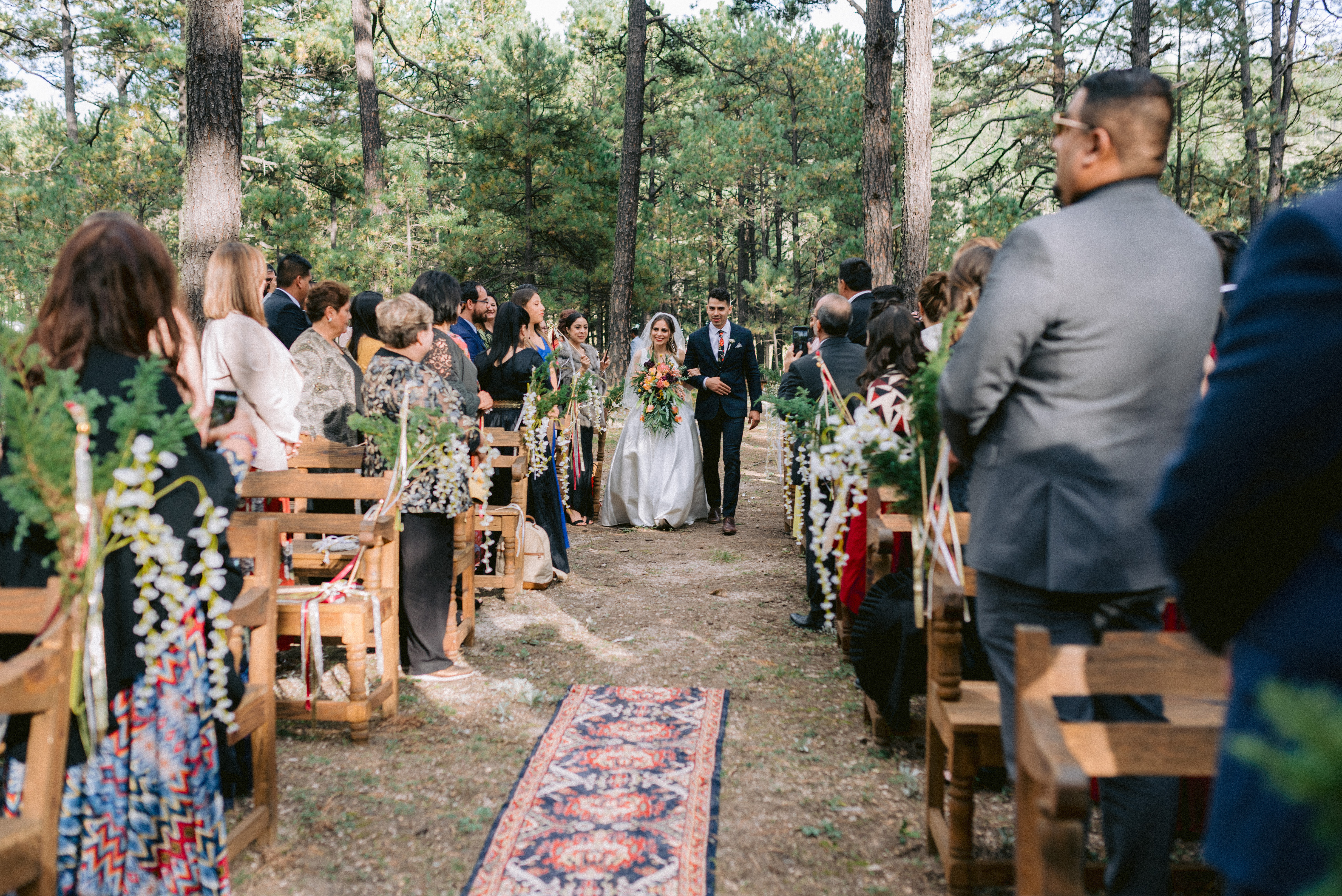 La ceremonia fue un momento incomparable: un camino señalado entre la espesura del bosque hasta llegar a un claro bordeado por pinos altísimos seguidos de una pared de rocas que convertían el paisaje en una pintura. Justo ahí un arco de madera decorado con telas y flores, donde Javier esperaba la llegada de Mariana vestida completamente de blanco entre todo el verde que convergía a su alrededor, estaban perfectos. Y todo quedo inmortalizado en la fotazas que les hizo María Vega Fotografía. Chéquenlas al final.