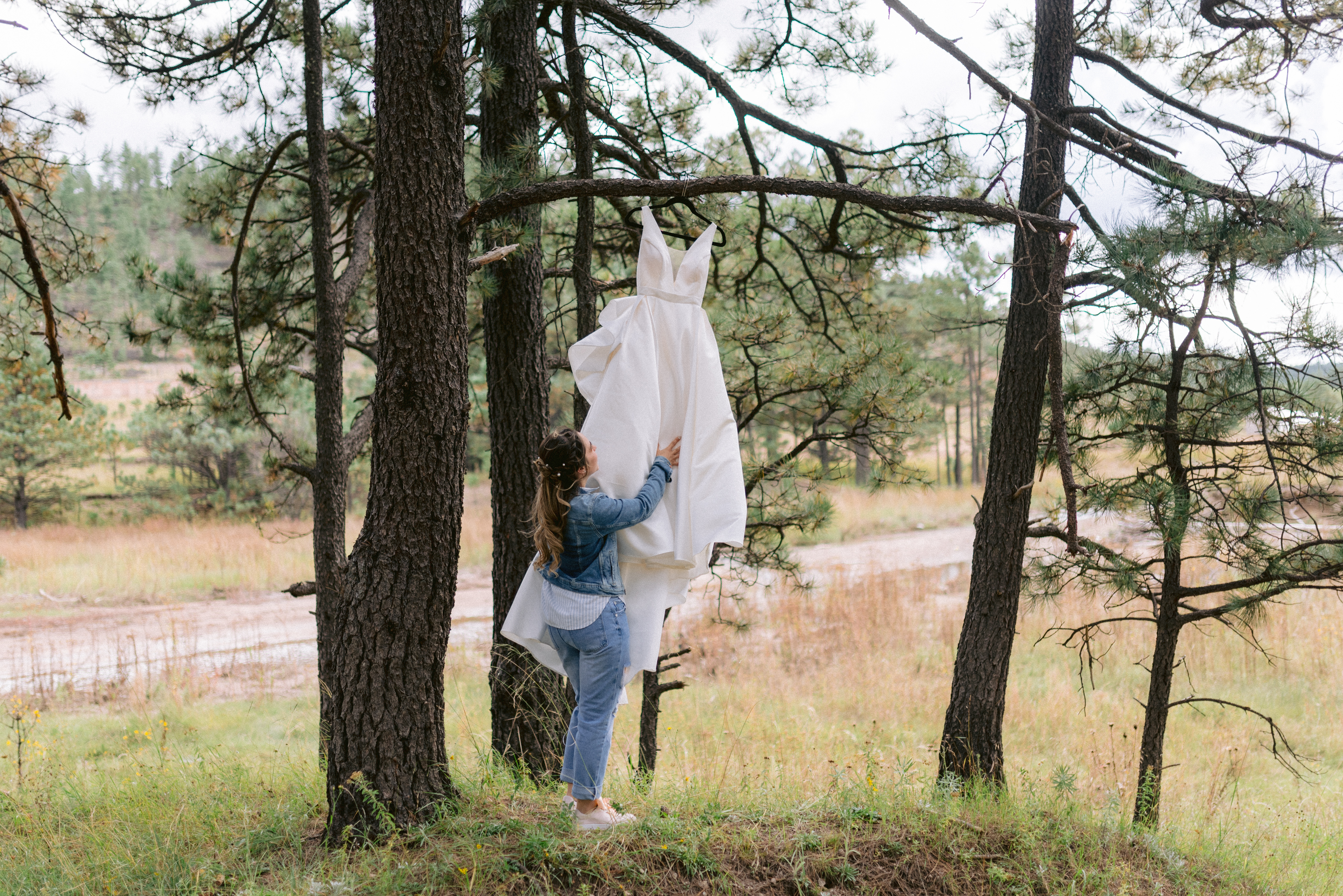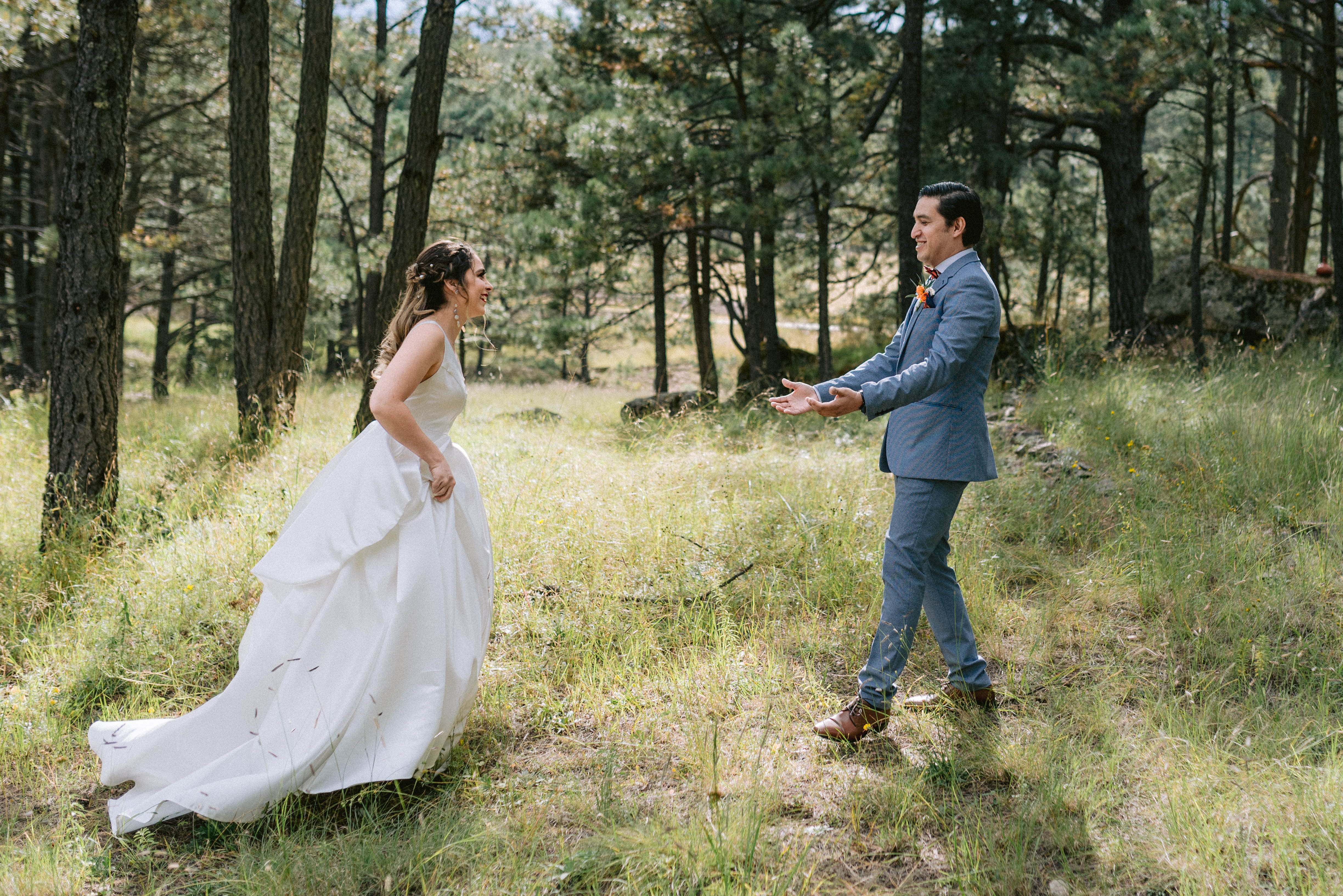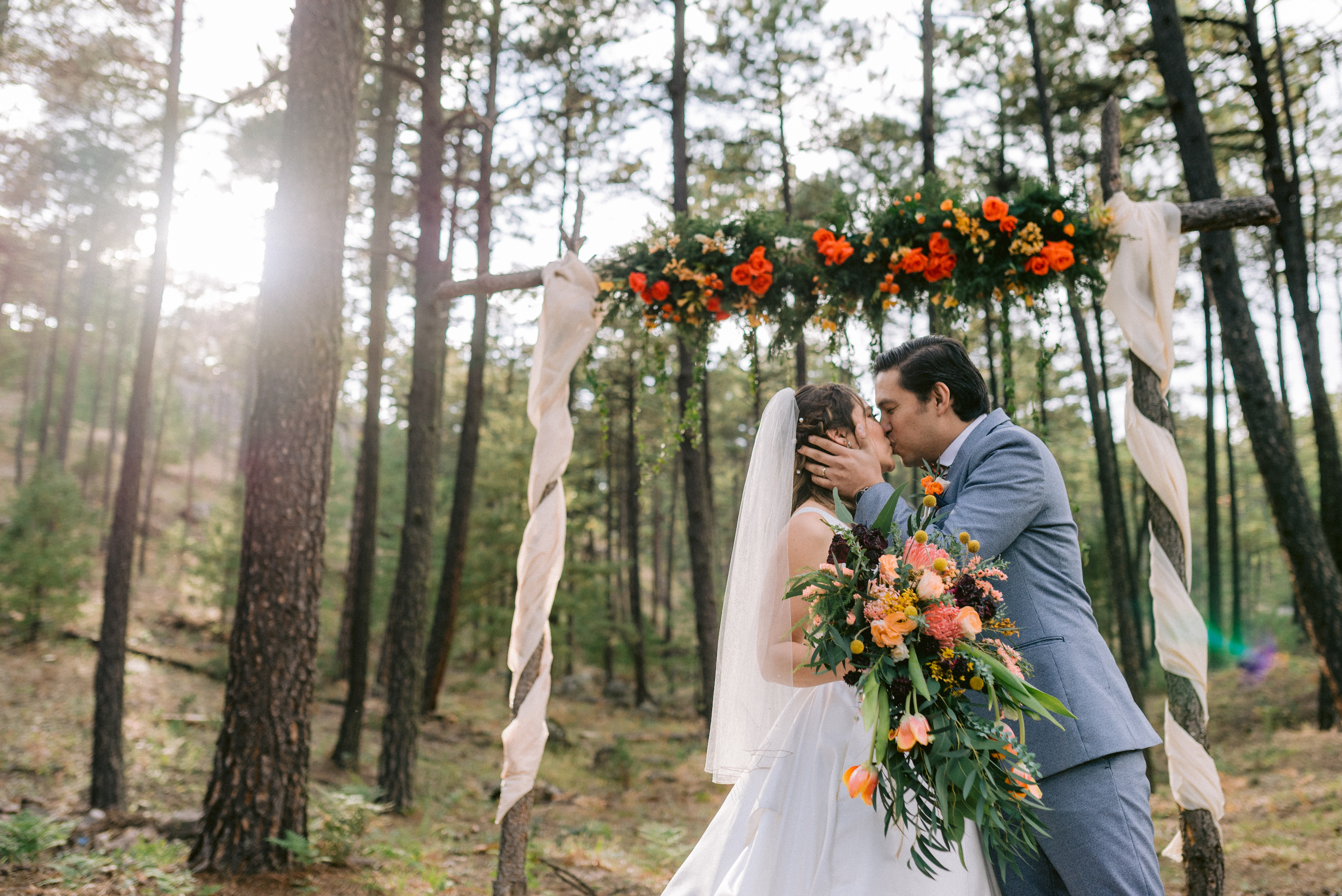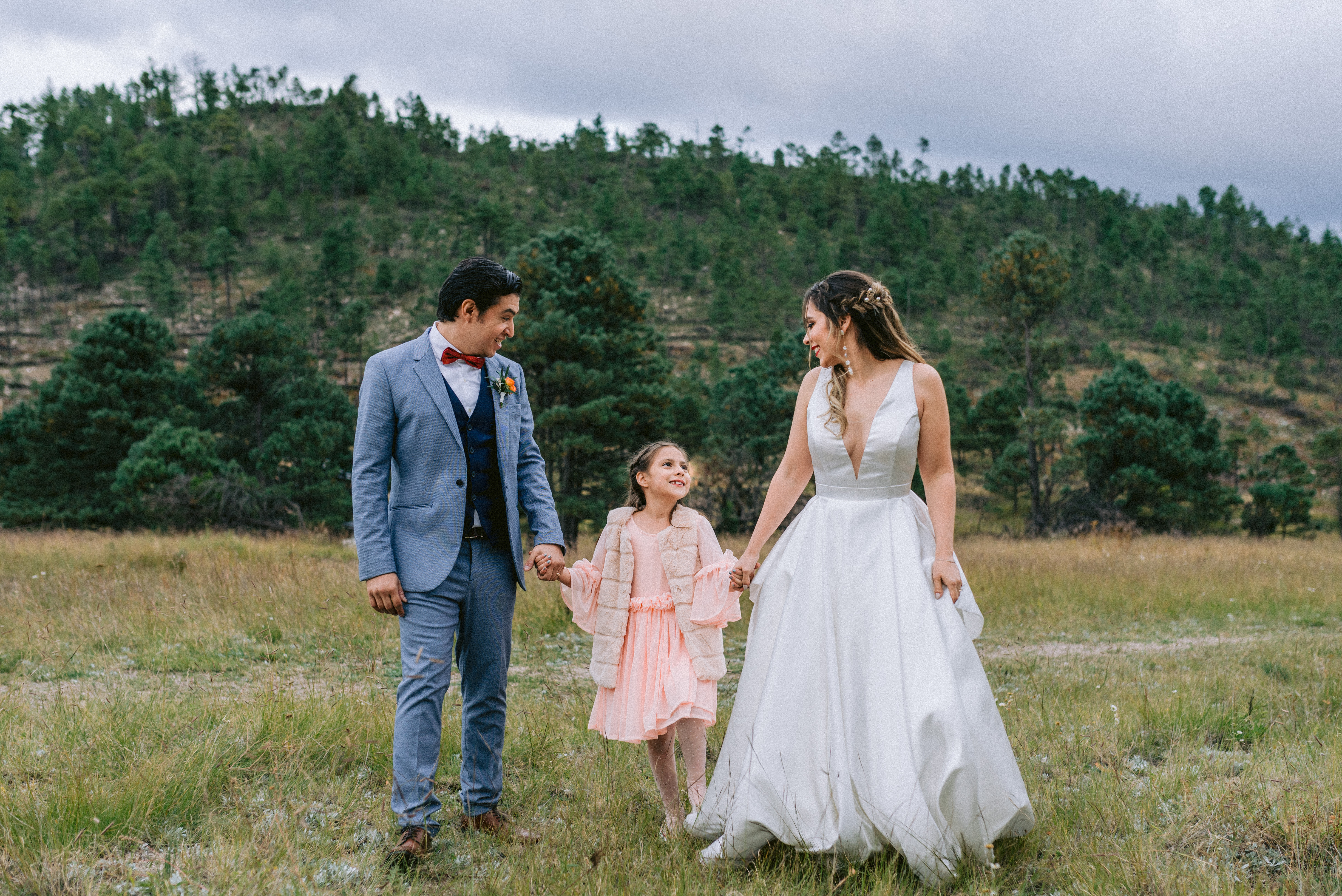 La ceremonia fue un momento incomparable: un camino señalado entre la espesura del bosque hasta llegar a un claro bordeado por pinos altísimos seguidos de una pared de rocas que convertían el paisaje en una pintura. Justo ahí un arco de madera decorado con telas y flores, donde Javier esperaba la llegada de Mariana vestida completamente de blanco entre todo el verde que convergía a su alrededor, estaban perfectos. Y todo quedo inmortalizado en la fotazas que les hizo María Vega Fotografía. Chéquenlas al final.