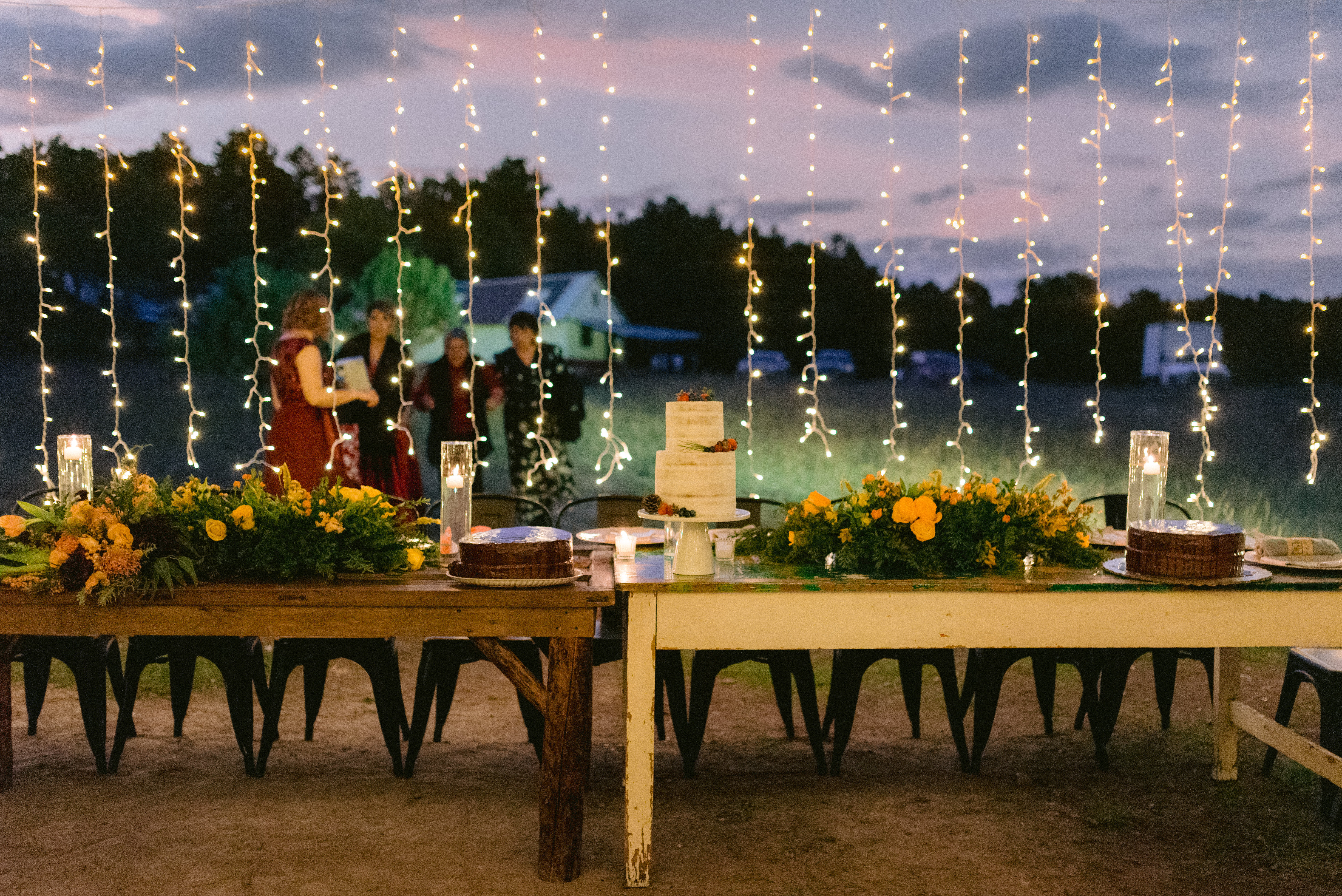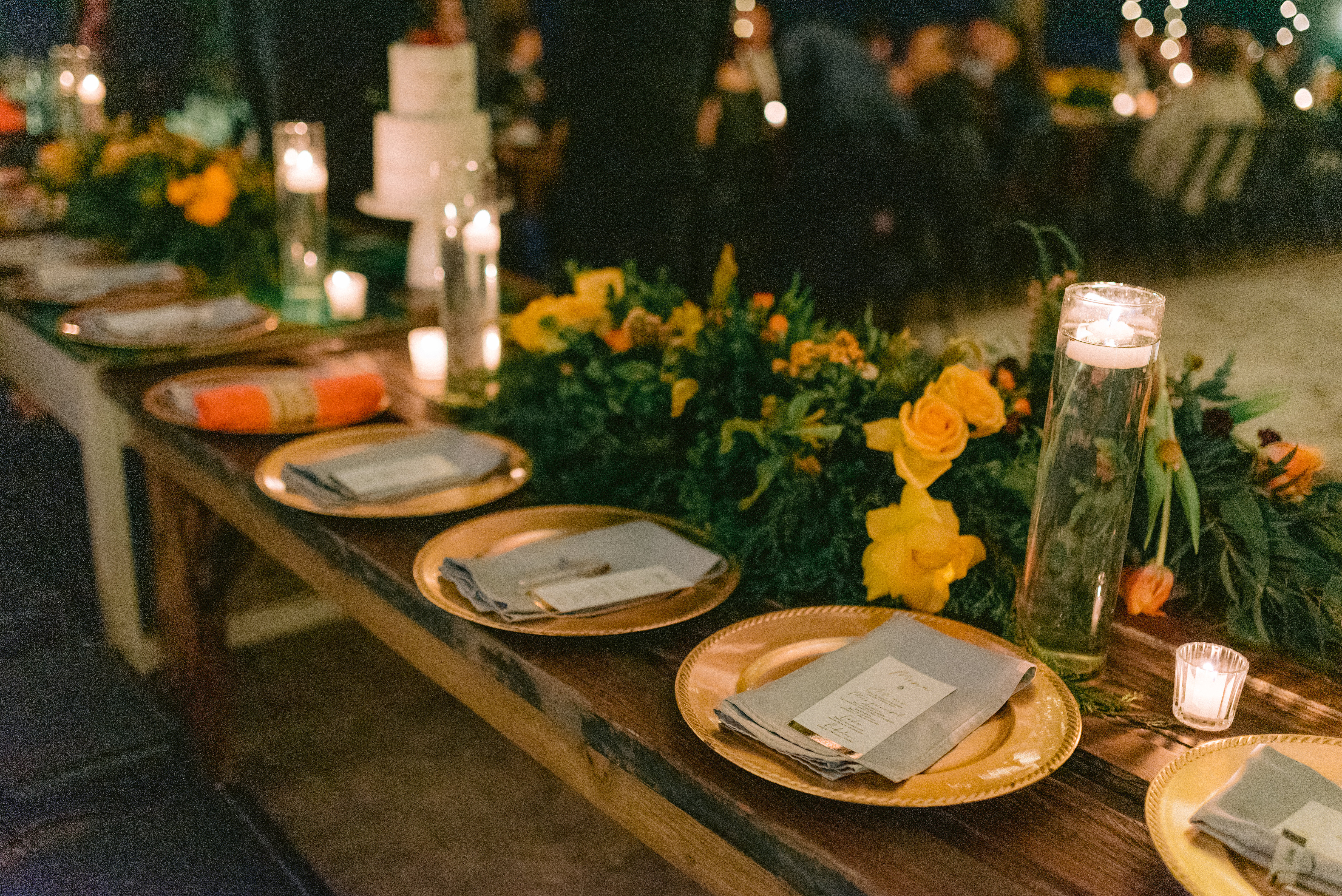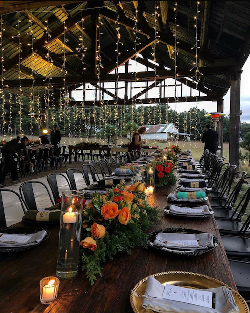 Para la recepción elegimos la ubicación ideal: un solitario granero de madera separado del resto del lugar, desde que lo vimos supimos que era ideal para ellos dos y no nos equivocamos. El techo lo convertimos en miles de lucecitas que caían en cortinas de luz sobre las mesas de madera sobre las que descansaban caminos de rosas color durazno, follajes verdes y detalles de velas.