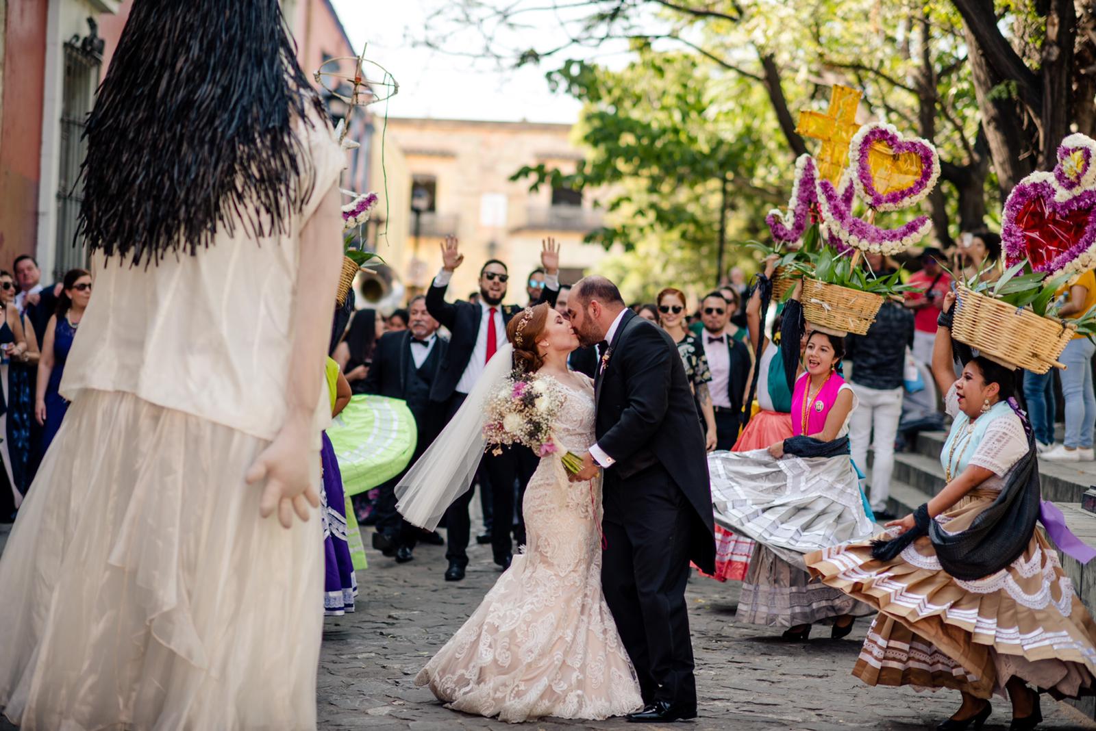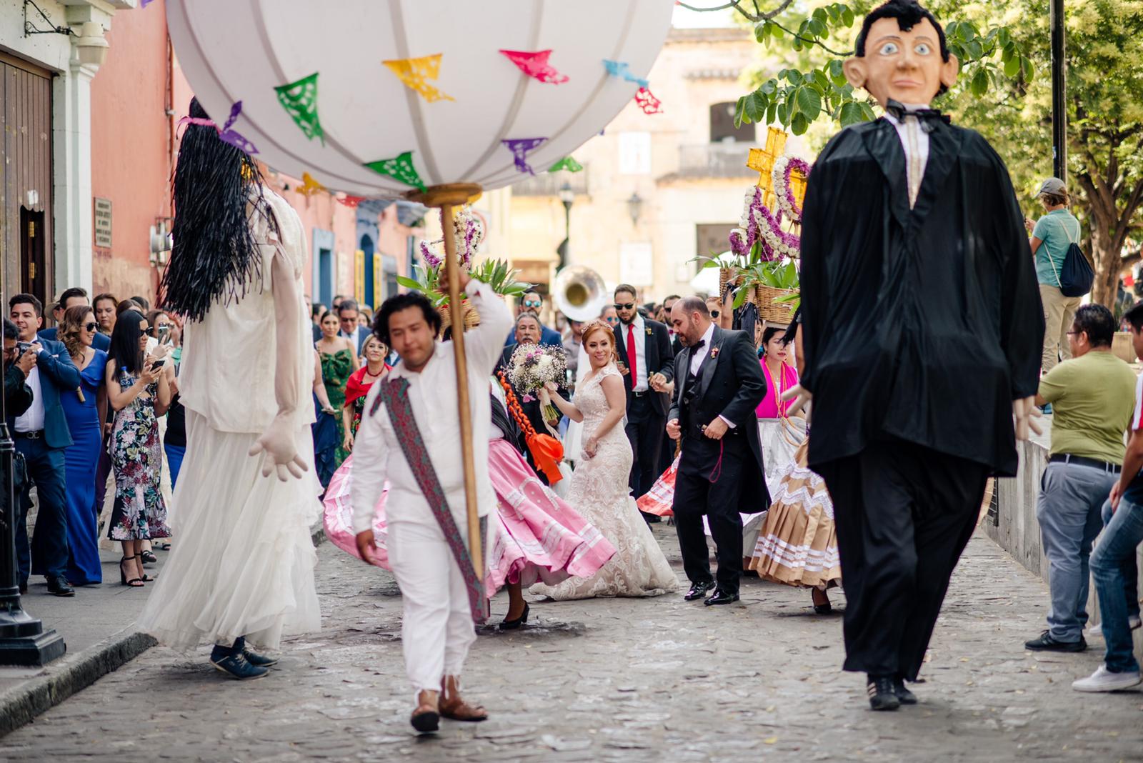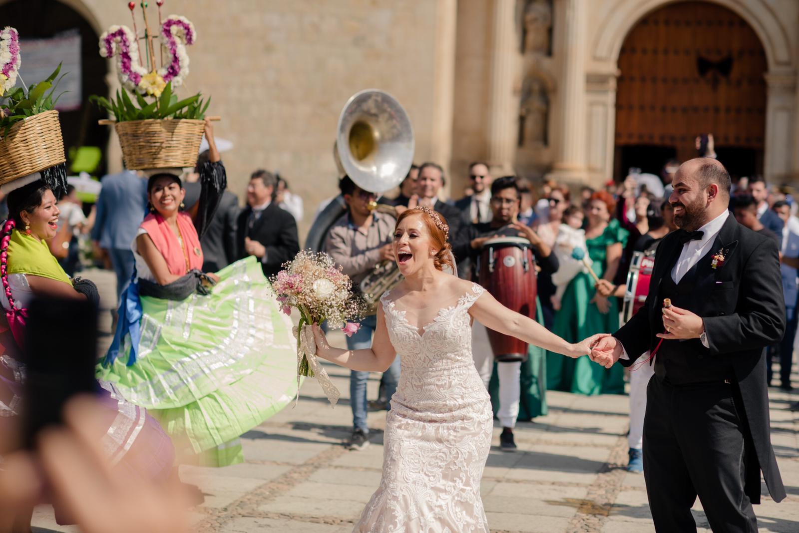 La ceremonia religiosa estuvo llena de tradición y emoción; a la salida, ¡la fiesta comenzó!, una calenda desde el templo hasta el ex convento repleta de música, gigantes mojigangas y shots de mezcal (obviamente, porque Oaxaca…) para avivar la calidez que ya se sentía en todos, ya verán las fotografías hechas por nuestro amigo Danny Cuevas Wedding Photography.