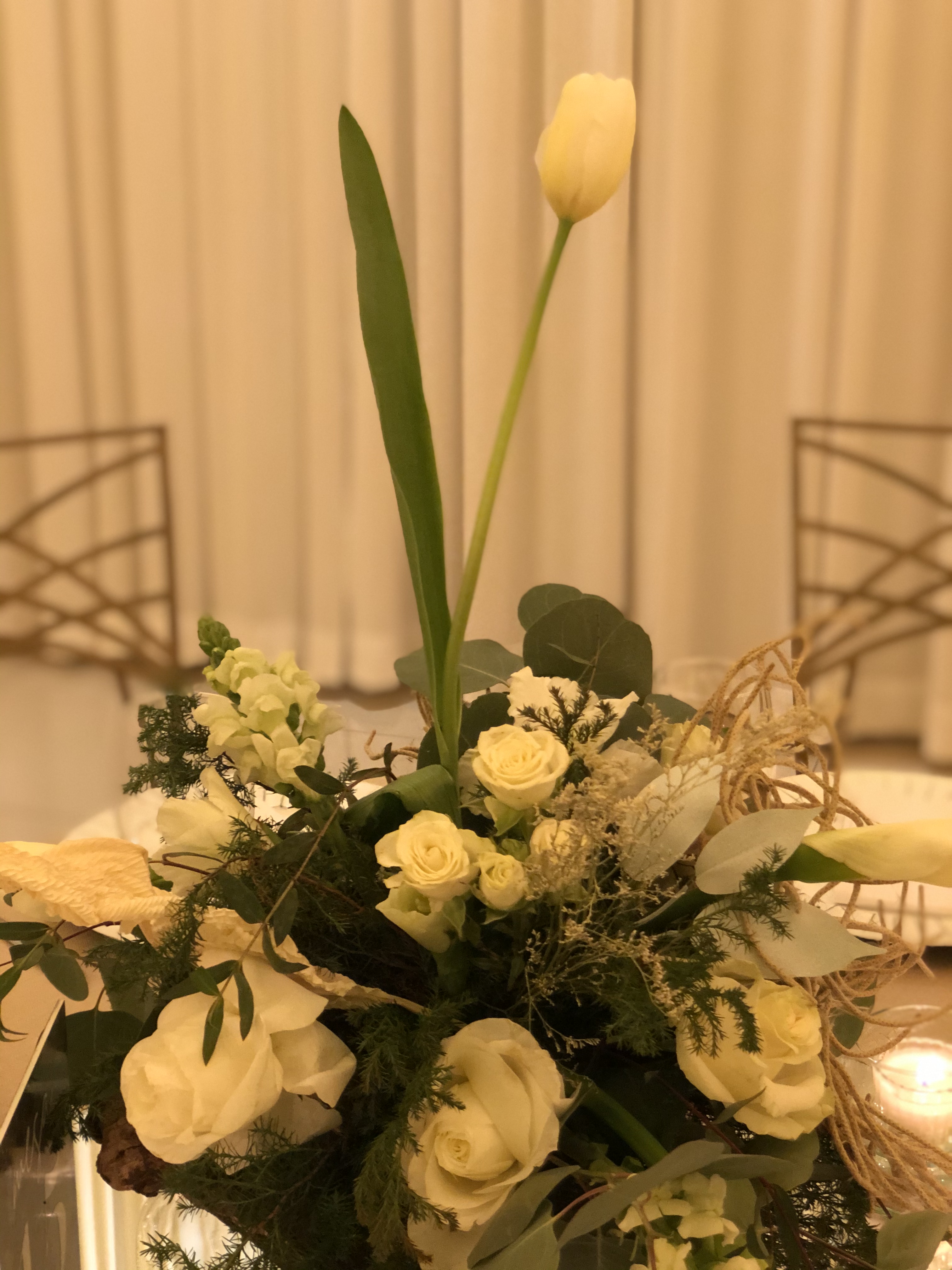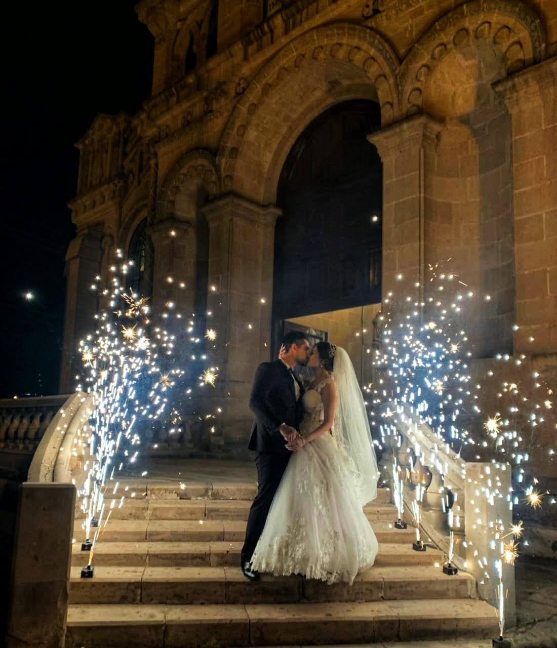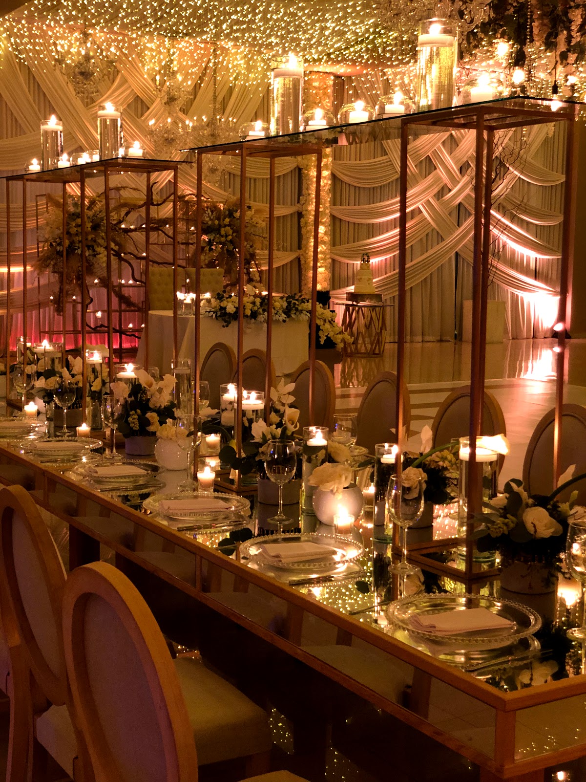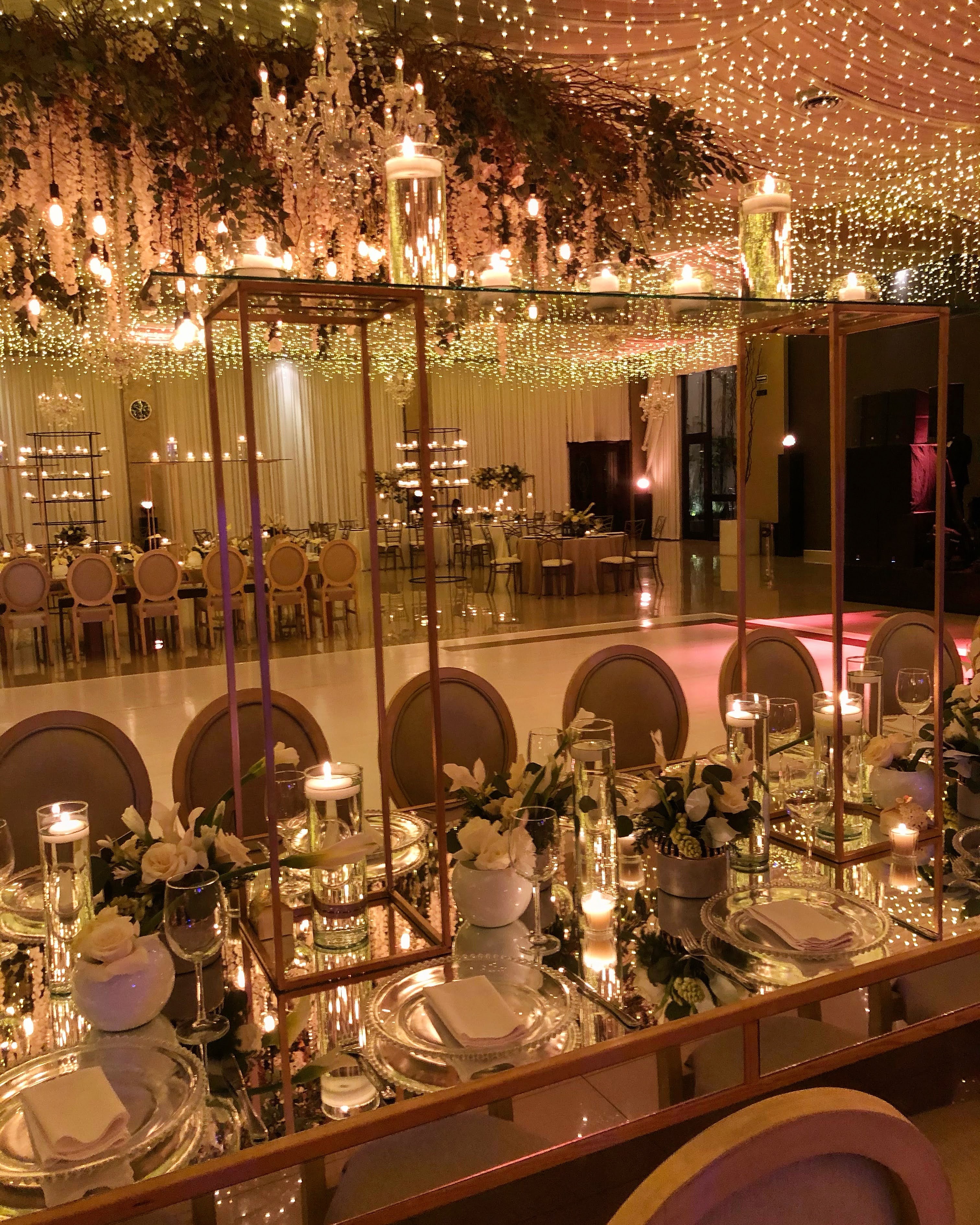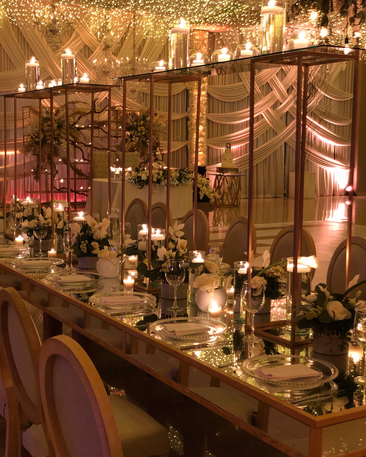 Para la llegada de los novios a la recepción todo estuvo inundado de luz desde un camino de bengalas formado por todos sus seres queridos, un recorrido ideal para la cámara experta de @jonathanguajardo hasta la pista donde «por el resto de mi vida» de Andrés Cepeda se convertiría en su primer baile como esposos, el fulgor se extendía desde un cielo resplandeciente reflejado en las mesas de espejo y en los cuencos de cristal, en ambos la rosas, tulipanes y anturios, todos de un blanco impoluto así como el vestido de la novia terminaban por envolvente en un sentimiento de completa fascinación.