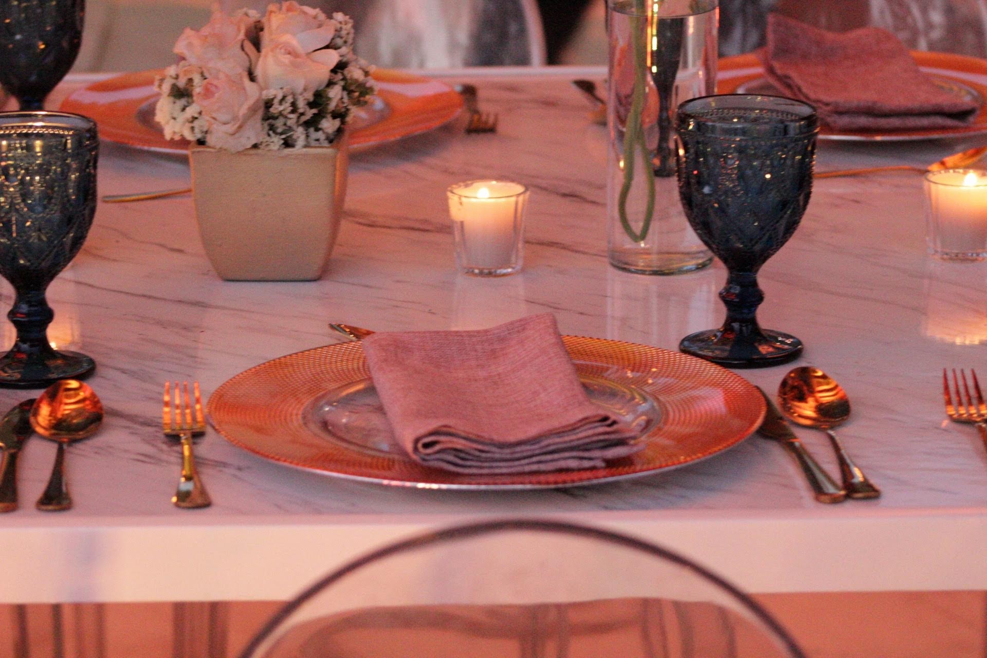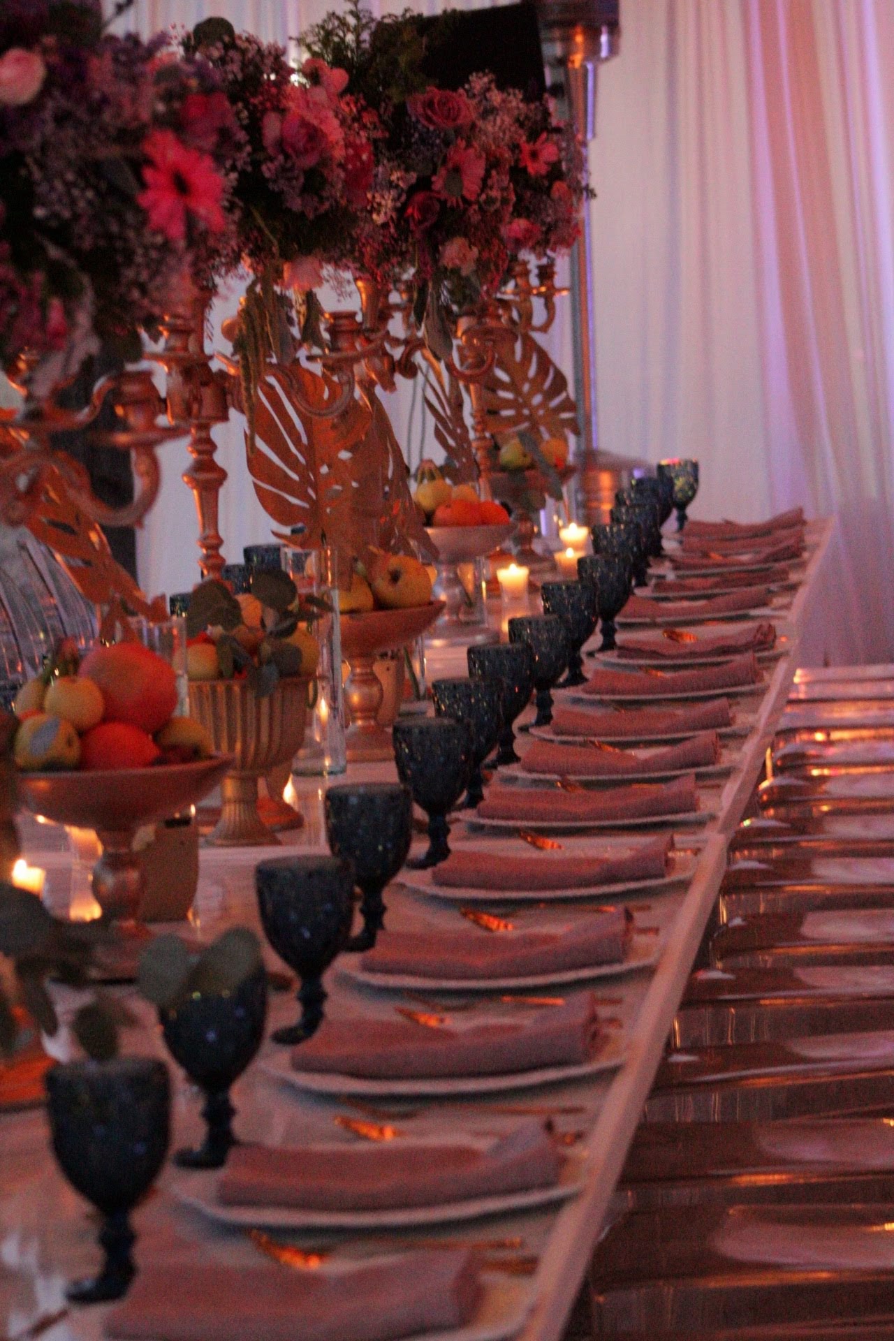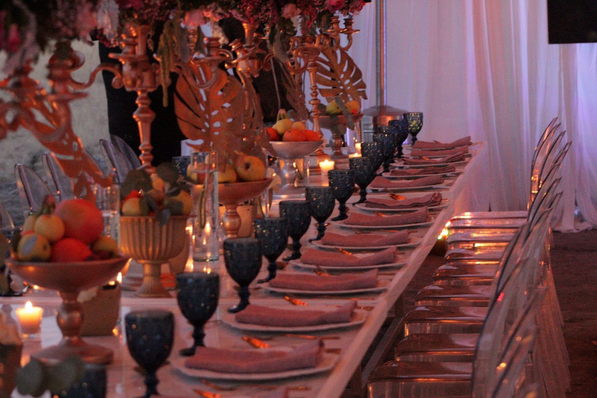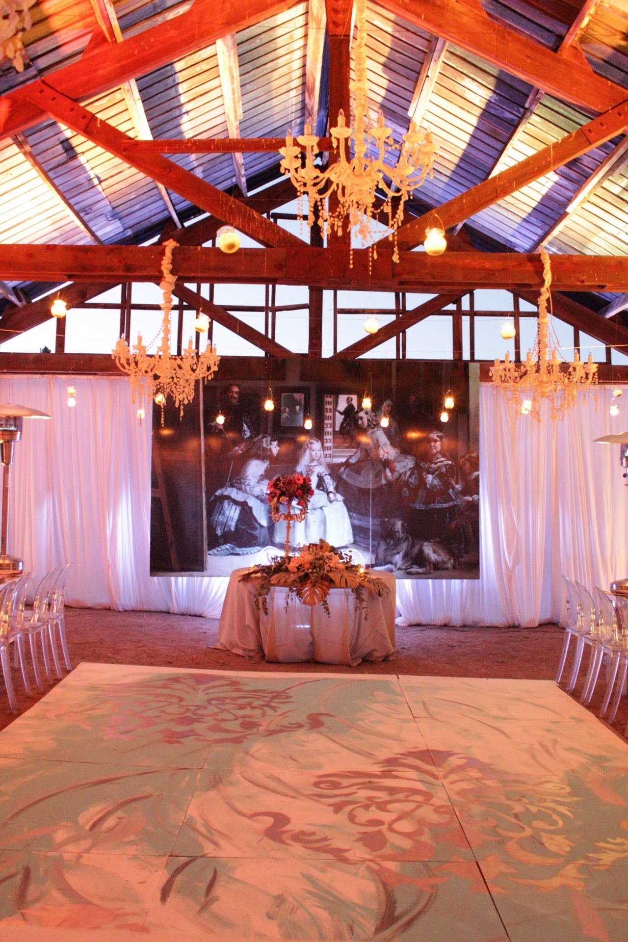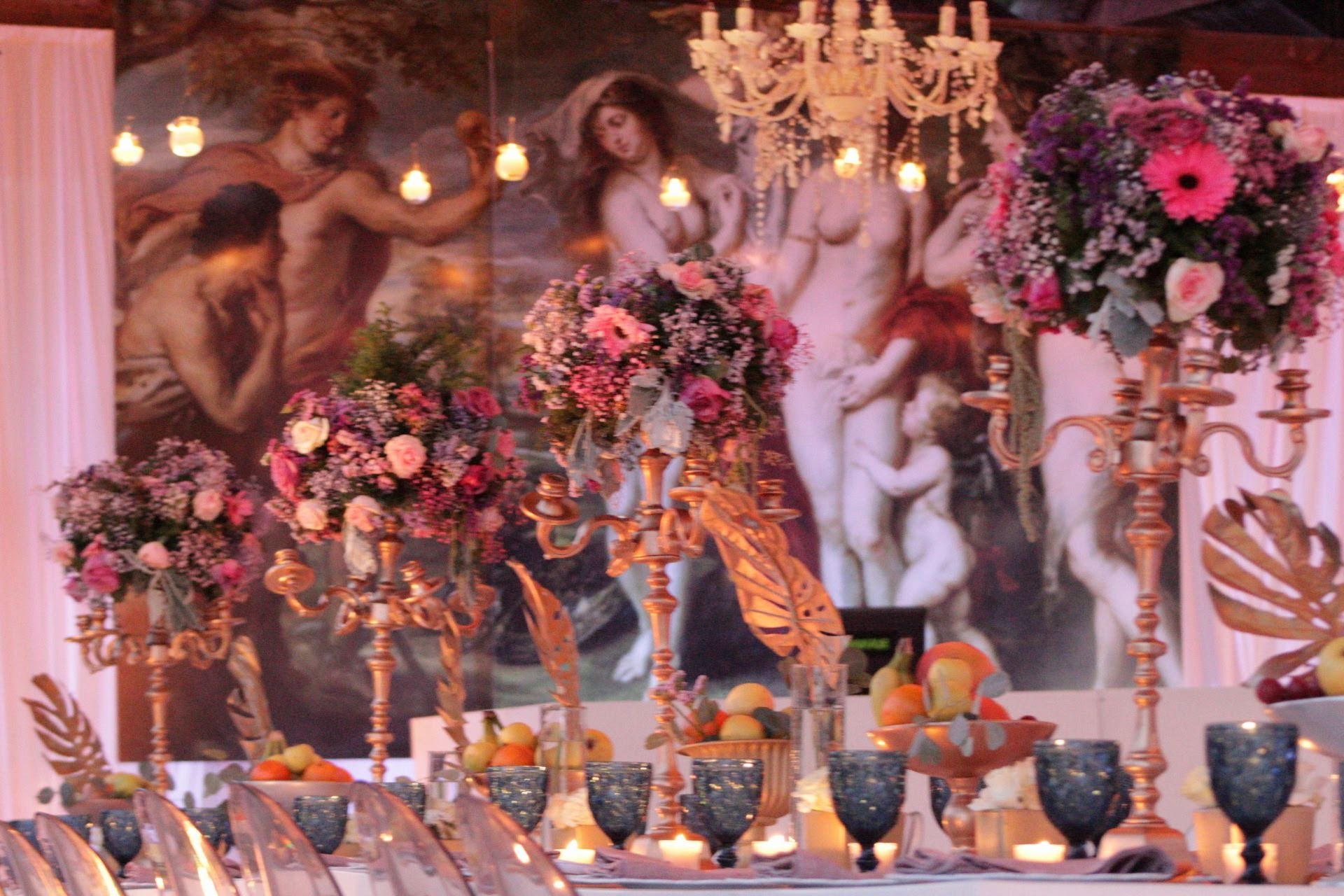 Detrás de la mesa de novios y detrás de la barra del Dj, dos representaciones de las pinturas iconos del arte barroco, Las Meninas de Diego Velázquez y El juicio de París de Pedro Pablo Rubens. Y de lado a lado lo recorrían dos largas mesas marmoleadas con altos candelabros dorados decorados con rosas inglesas, hojas de monstera doradas y flores de varios colores, rodeados de fruteros, vasijas, naturaleza muerta y una loza acordé al momento, todo listo para convertirse en un bodegón pintado por Caravaggio, sobre la pista blanca y azul decorada con patrones dorados de la misma época y sobre el techo colgaban varios candelabros para completar la escena. Les dejo algunas fotos para que vean como si es posible arriesgarse con las ideas de lo más les gusta y llevarlo al día de su boda.