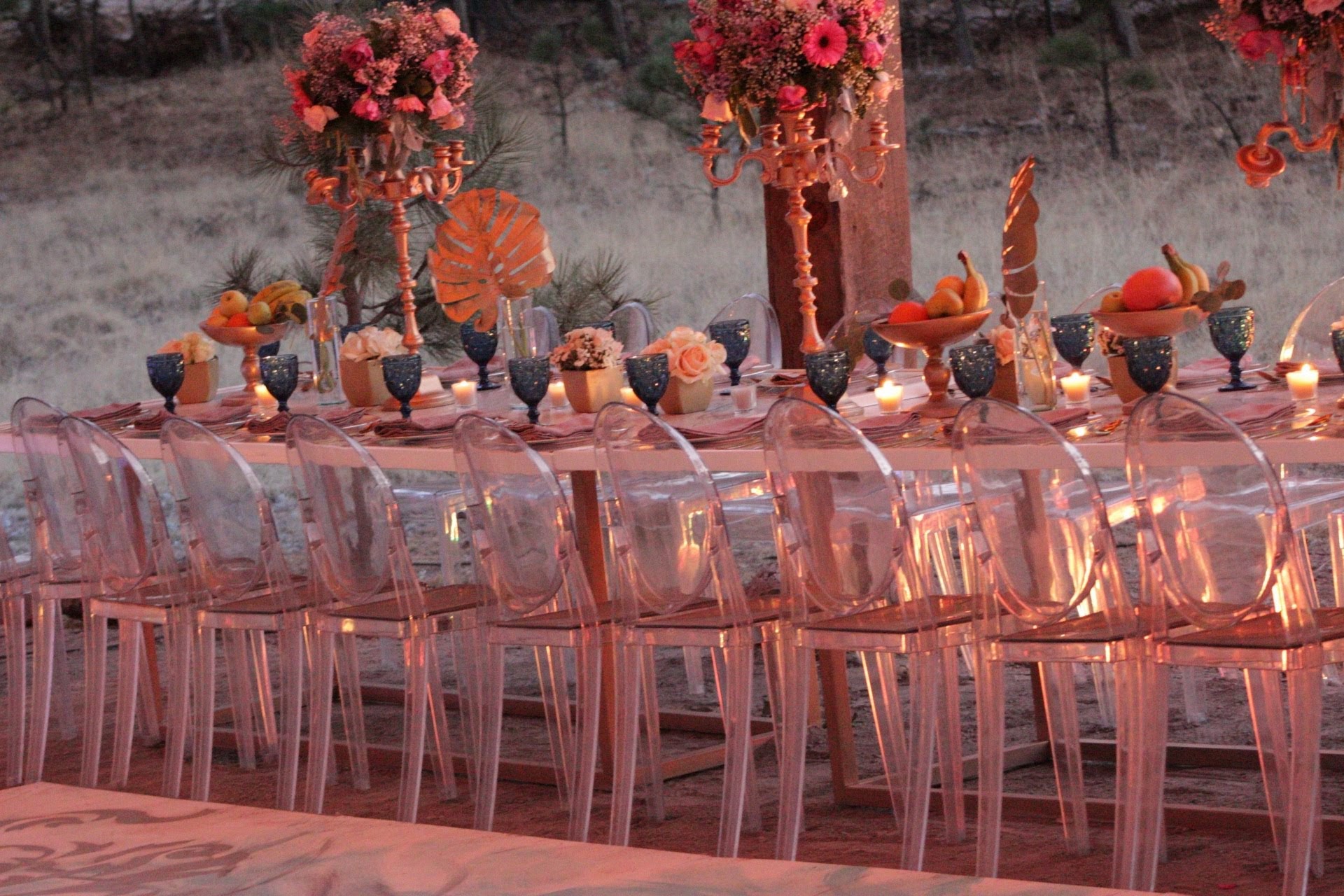 Cuando vieron unas fotografías de una boda que yo había tenido en la sierra de Chihuahua fue una revelación, tenía todo lo que ellos amaban de aquel lugar y era perfecto para que todos asistieran. Me contactaron y comenzamos a trabajar sobre las ideas que ellos ya tenían. Buscaban combinar el lugar elegido con algo que a también a ambos los cautivaba: el movimiemto barroco. Detalles cargados, mucho color y exuberancia en la ornamentación. Todo estaba claro, una fiesta con reaggeton a todo volumen para que todos bailarán sin descanso, decoración barroca y todo esto vigilados por las cumbres serranas ¡Reto aceptado!