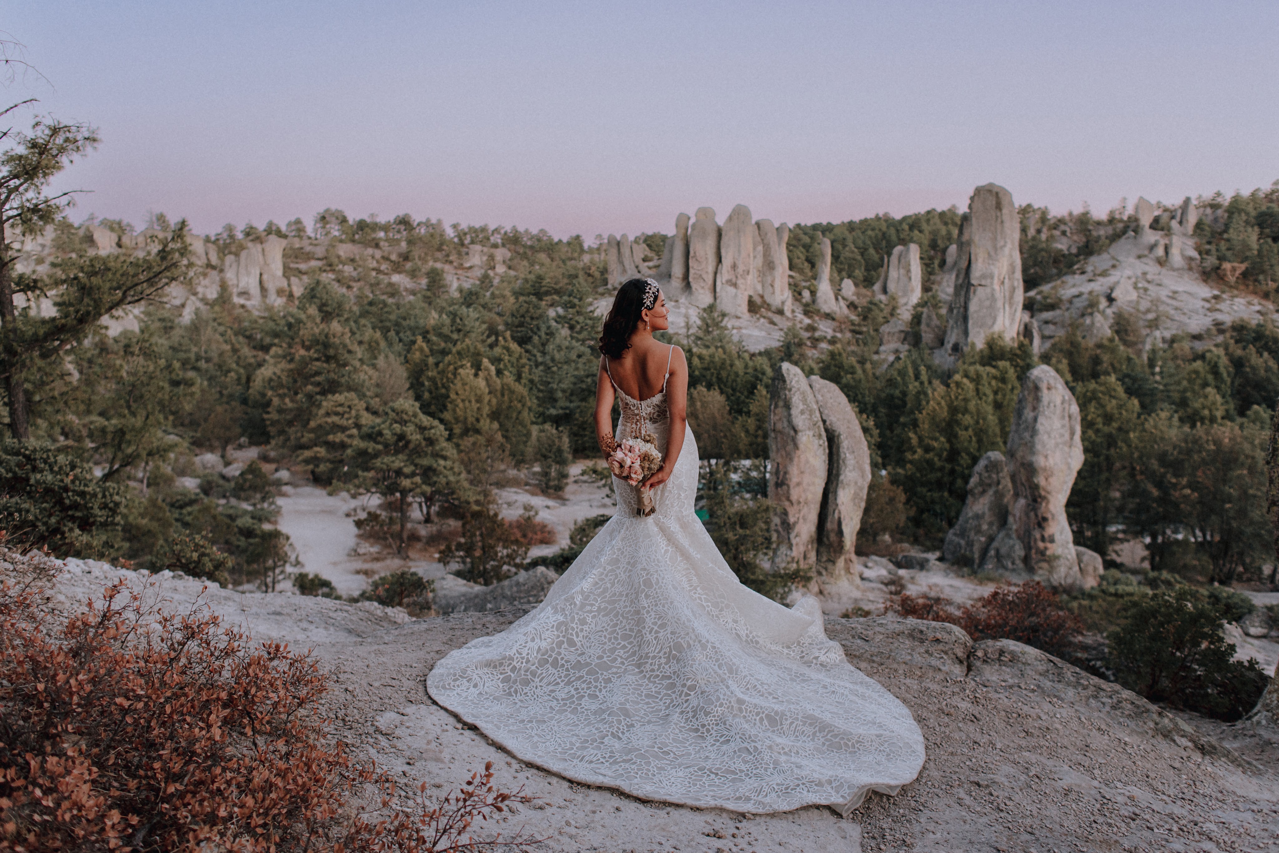 Nos fuimos a Creel, un pueblo mágico en la sierra Chihuahuense. Hacienda Don Armando, un espacio muy acogedor y con esa energía de bosque que a tantos nos encanta, solo que Mau y Majo buscaban una esencia diferente, más que una boda con alma de montaña buscaban transformar el lugar y convertirlo en un espacio contemporáneo de inspiración luminosa, como cuando vemos un atardecer en sus hermosos tonos dorados y la sola imagen nos transmite calma. Eso buscábamos y la verdad ¡lo conseguimos!