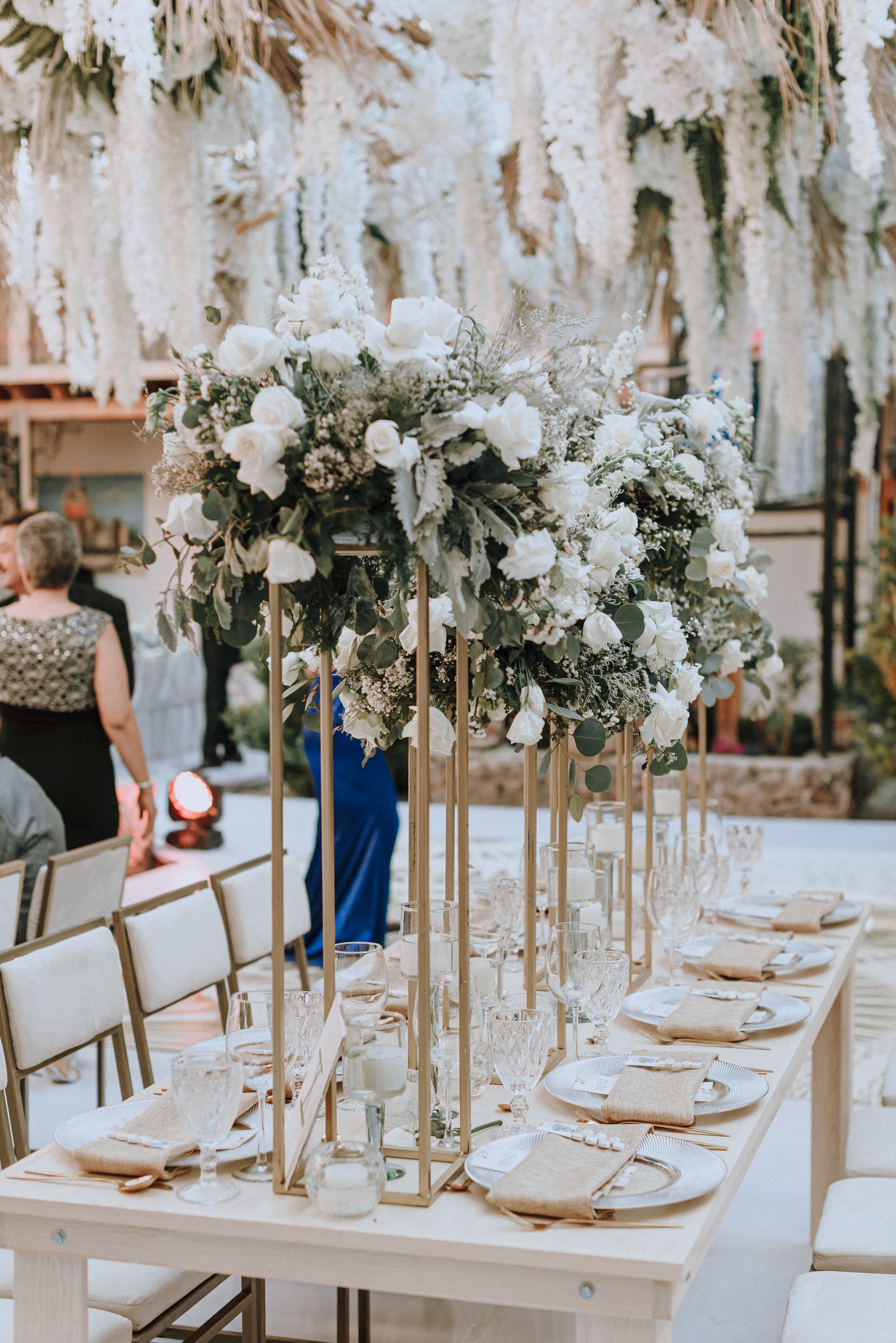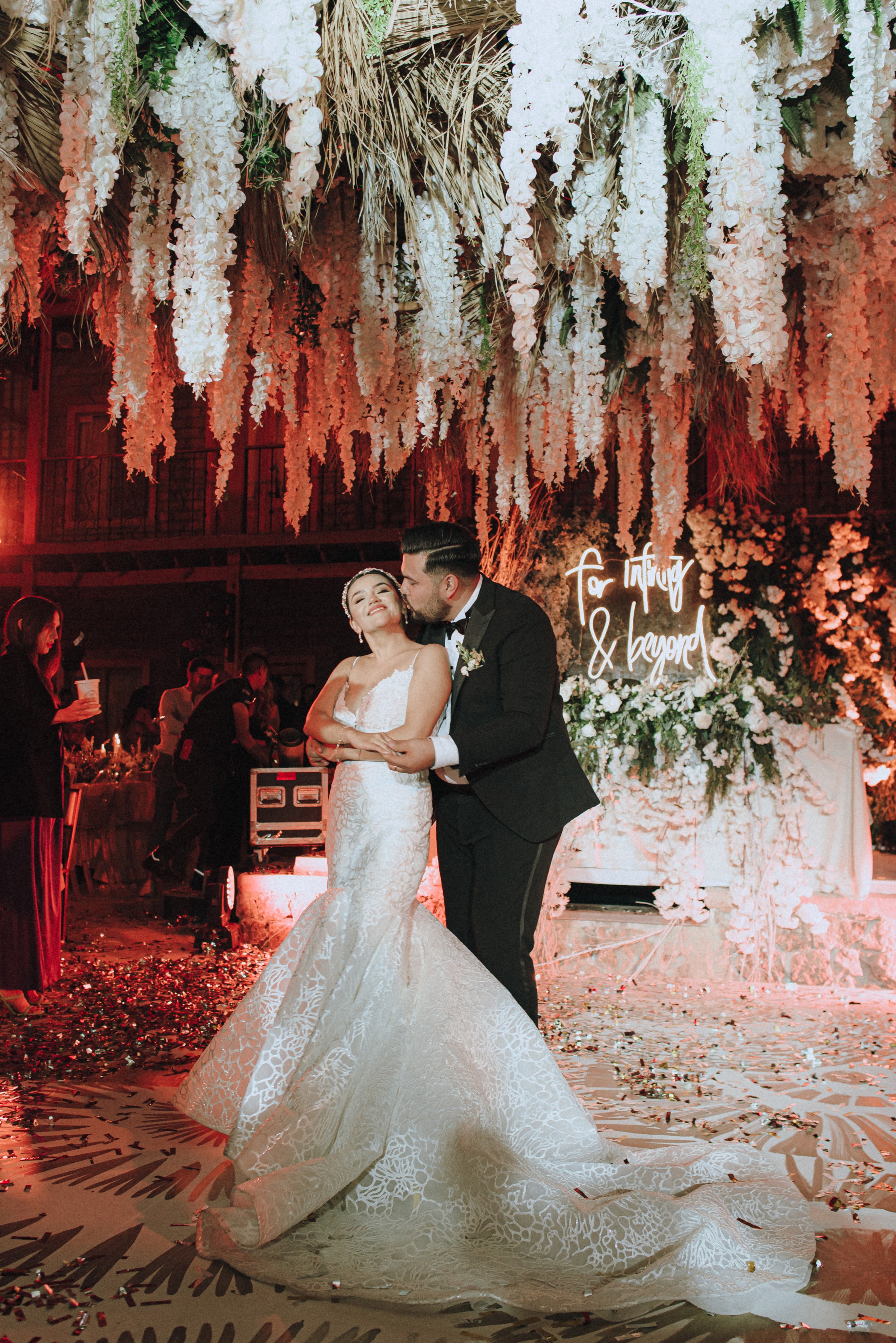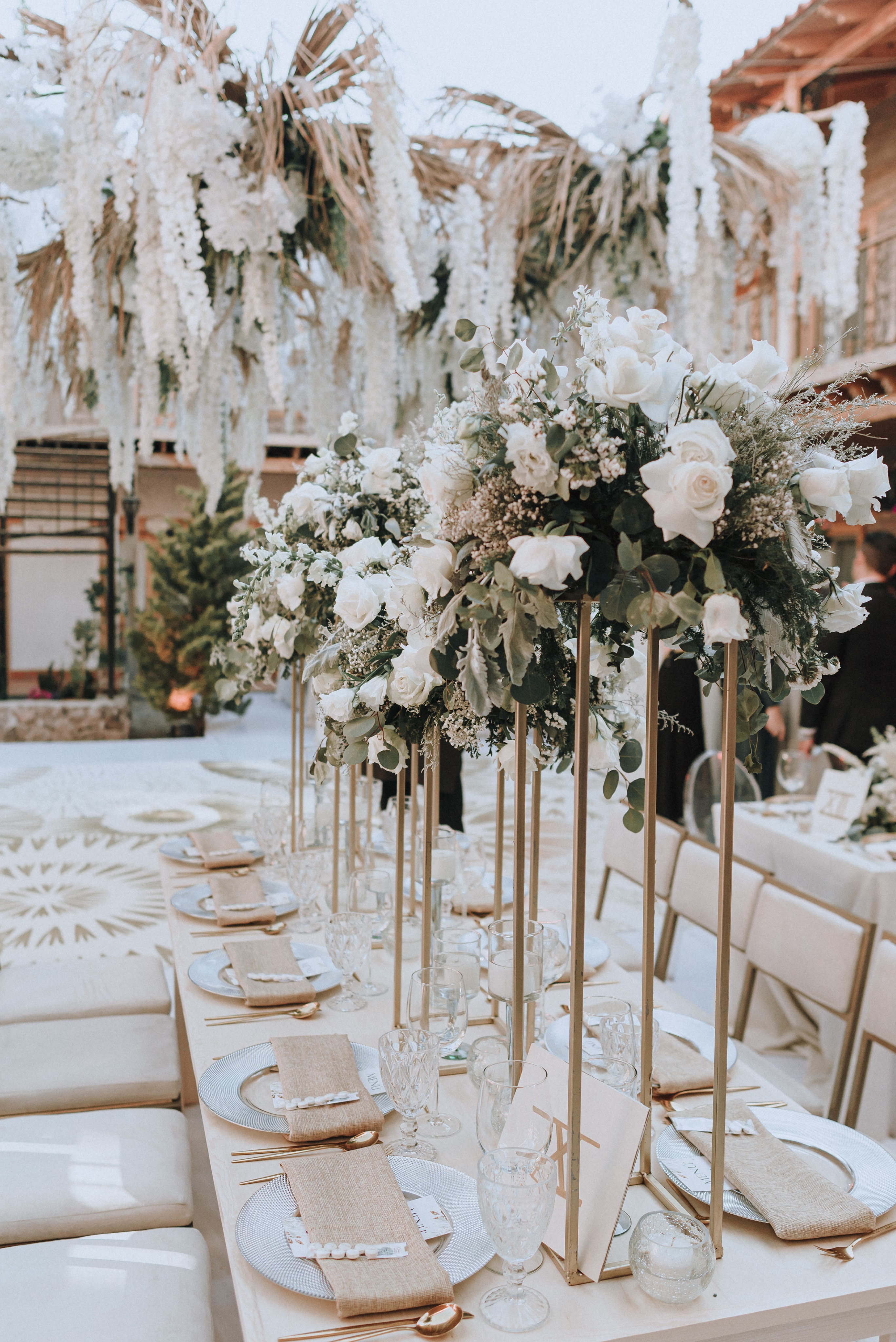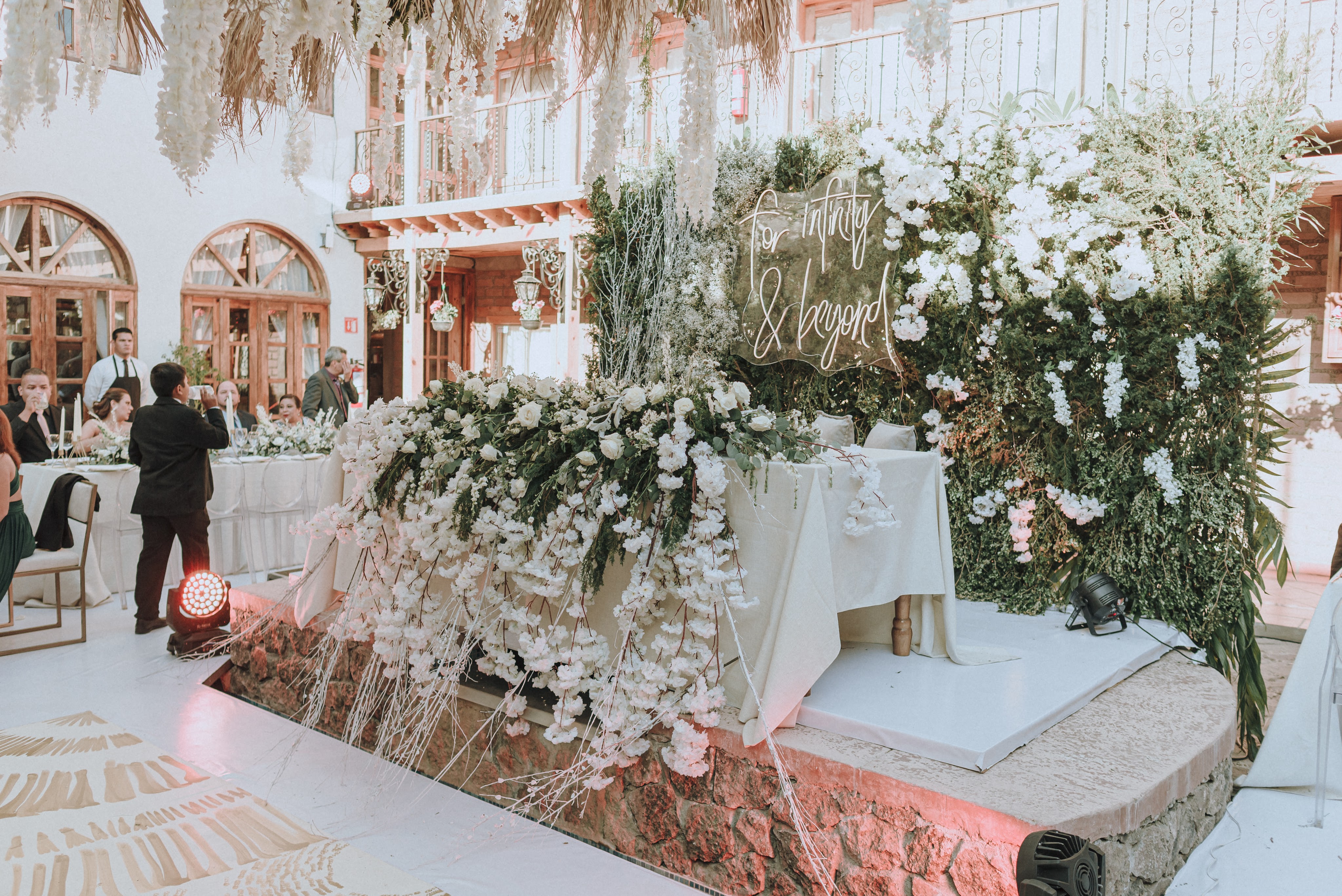 Lo primero fue cubrir los detalles de piedra del piso del patio con tarima de madera, todo en blanco para ampliar el espacio, al centro una pista de baile pintada a mano con destellos de explosiones doradas para que terminara por convertirse el lugar en un atardecer eterno. Para el primer baile de esposos y desde una pérgola central el decorado aéreo sobre la pista lo cubrimos todo con follaje y flores de wisteria blanca para el toque romántico perfecto.