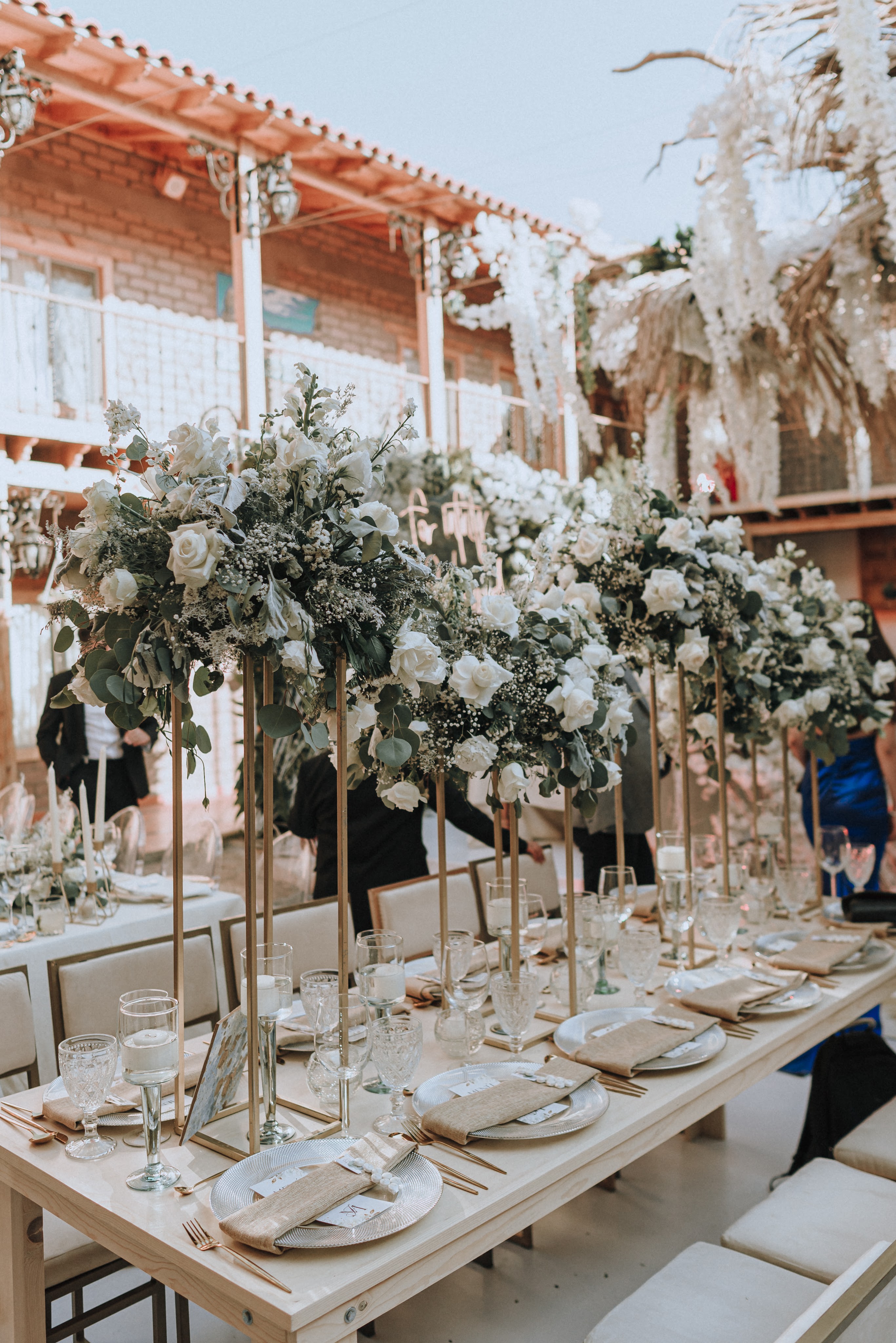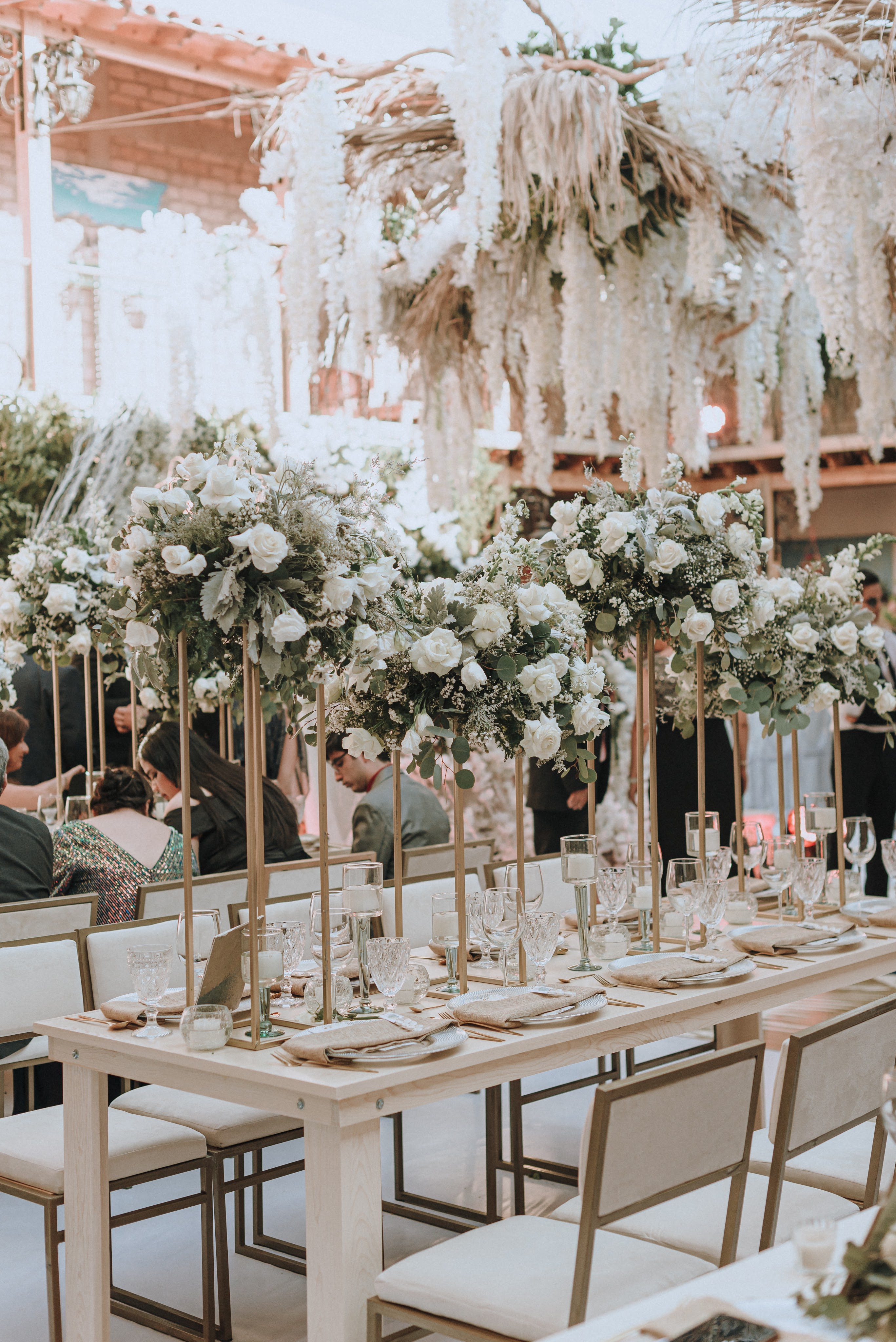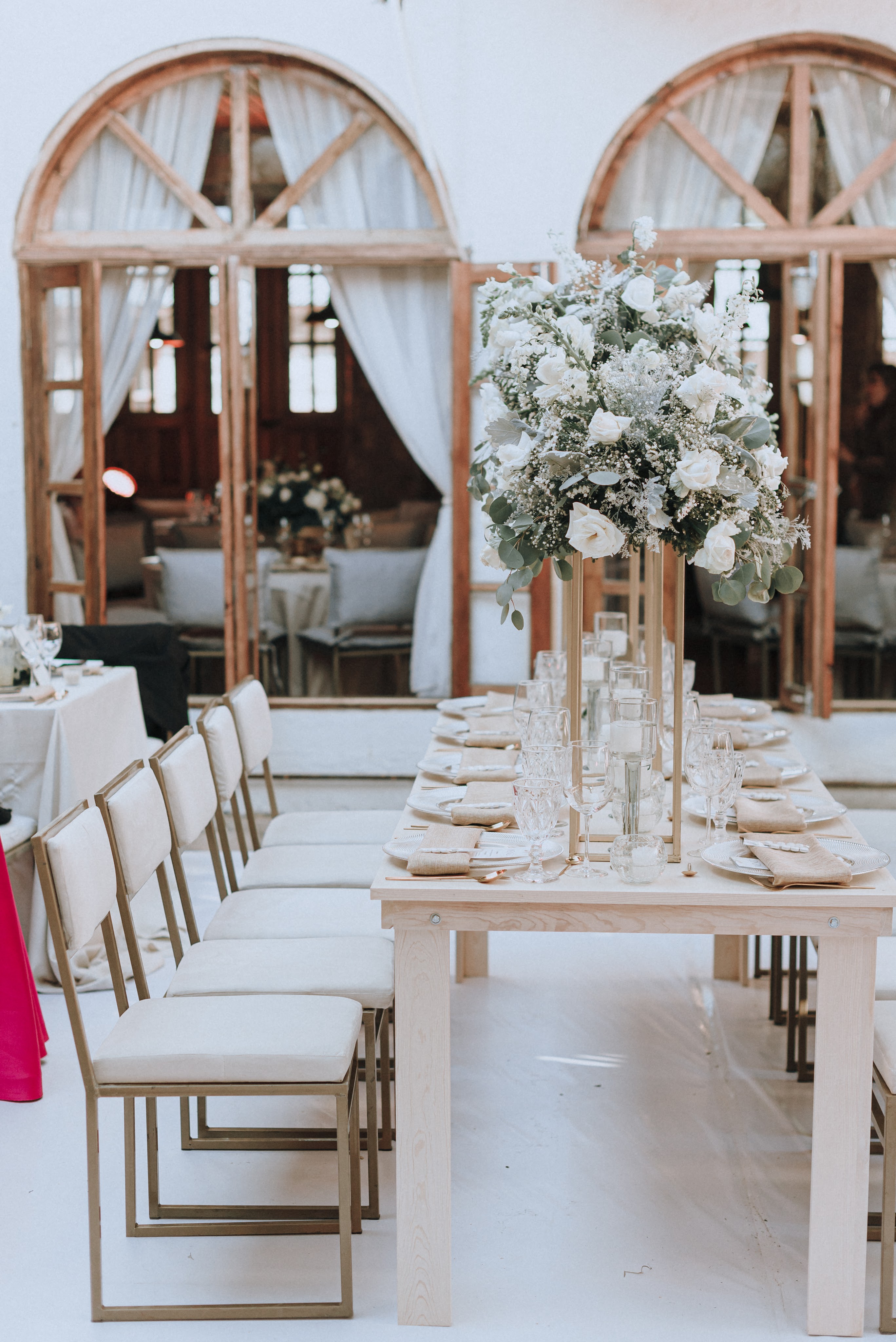 Alrededor todo tenía que conservar la paz y armonía construidas al centro, los mismos tonos y nada que pudiera perturbarlo: mesas de madera de pino hechas a la medida para su boda, sillas ghost transparentes y ghot dinning doradas, sobre las mesas tanto la decoración como el resto de elementos que interactúan debían preservar la línea marcada: flores blancas , estructuras decorativas de herrería, así como copas, platos, cubiertos y demás en tonos claros, blancos y dorados. Colaboradores de casa: Bukei Diseño, Eventum Mobiliario y ¡Todo listo!