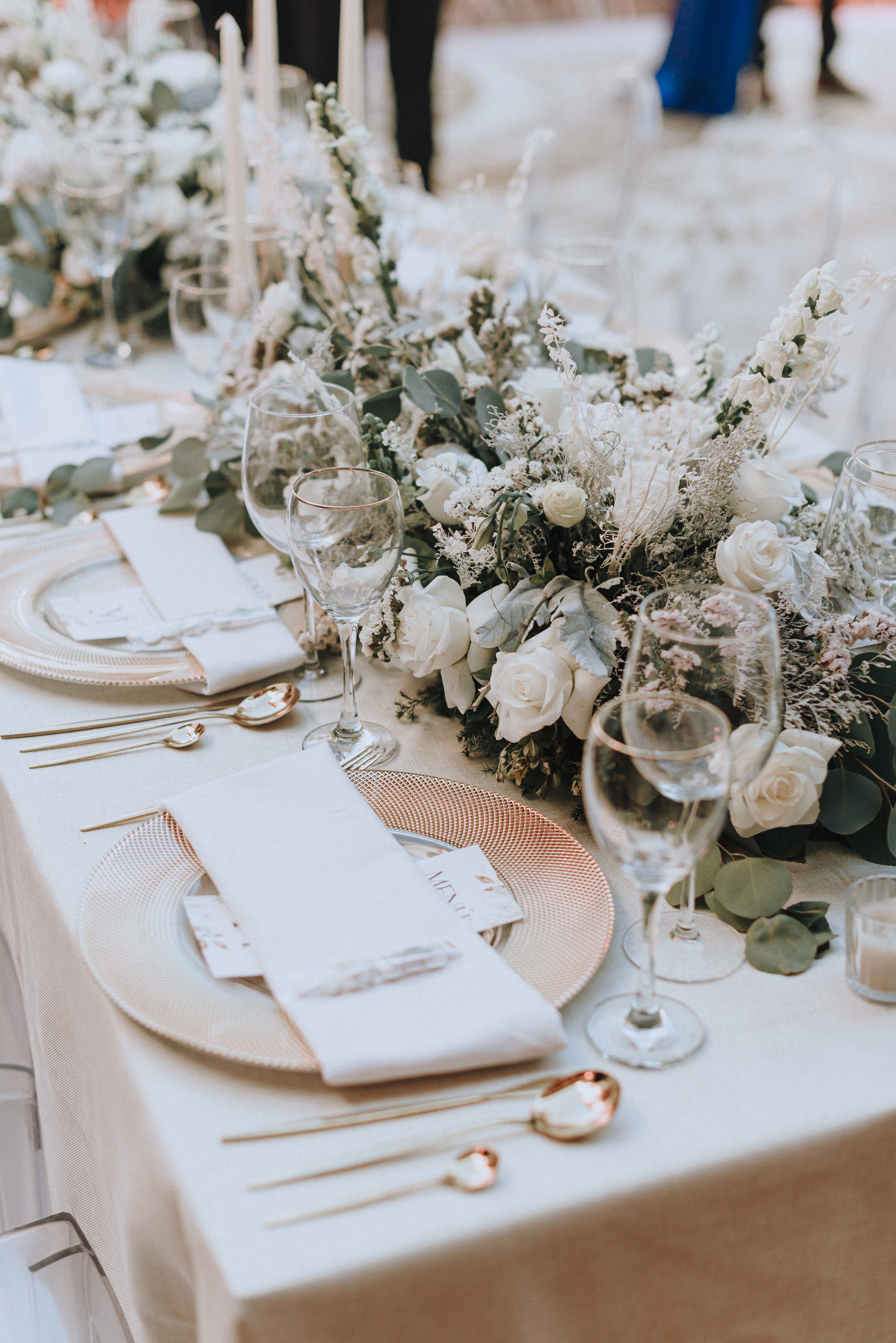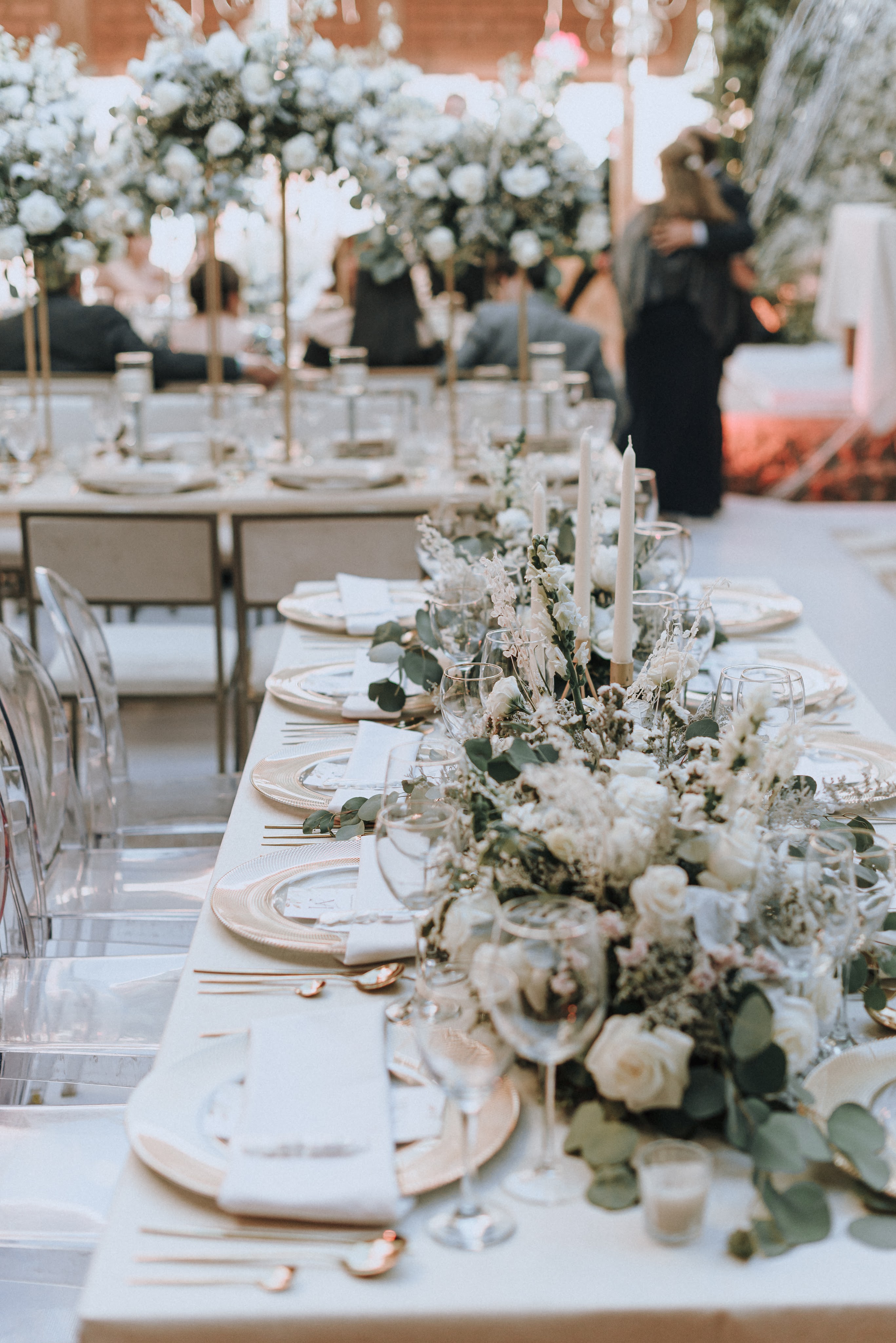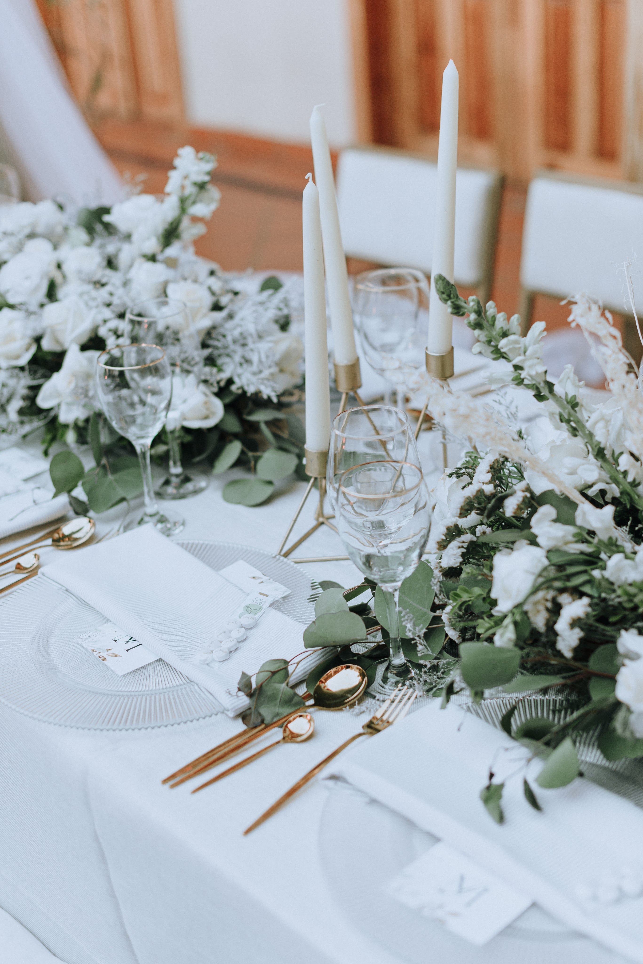 Alrededor todo tenía que conservar la paz y armonía construidas al centro, los mismos tonos y nada que pudiera perturbarlo: mesas de madera de pino hechas a la medida para su boda, sillas ghost transparentes y ghot dinning doradas, sobre las mesas tanto la decoración como el resto de elementos que interactúan debían preservar la línea marcada: flores blancas , estructuras decorativas de herrería, así como copas, platos, cubiertos y demás en tonos claros, blancos y dorados. Colaboradores de casa: Bukei Diseño, Eventum Mobiliario y ¡Todo listo!