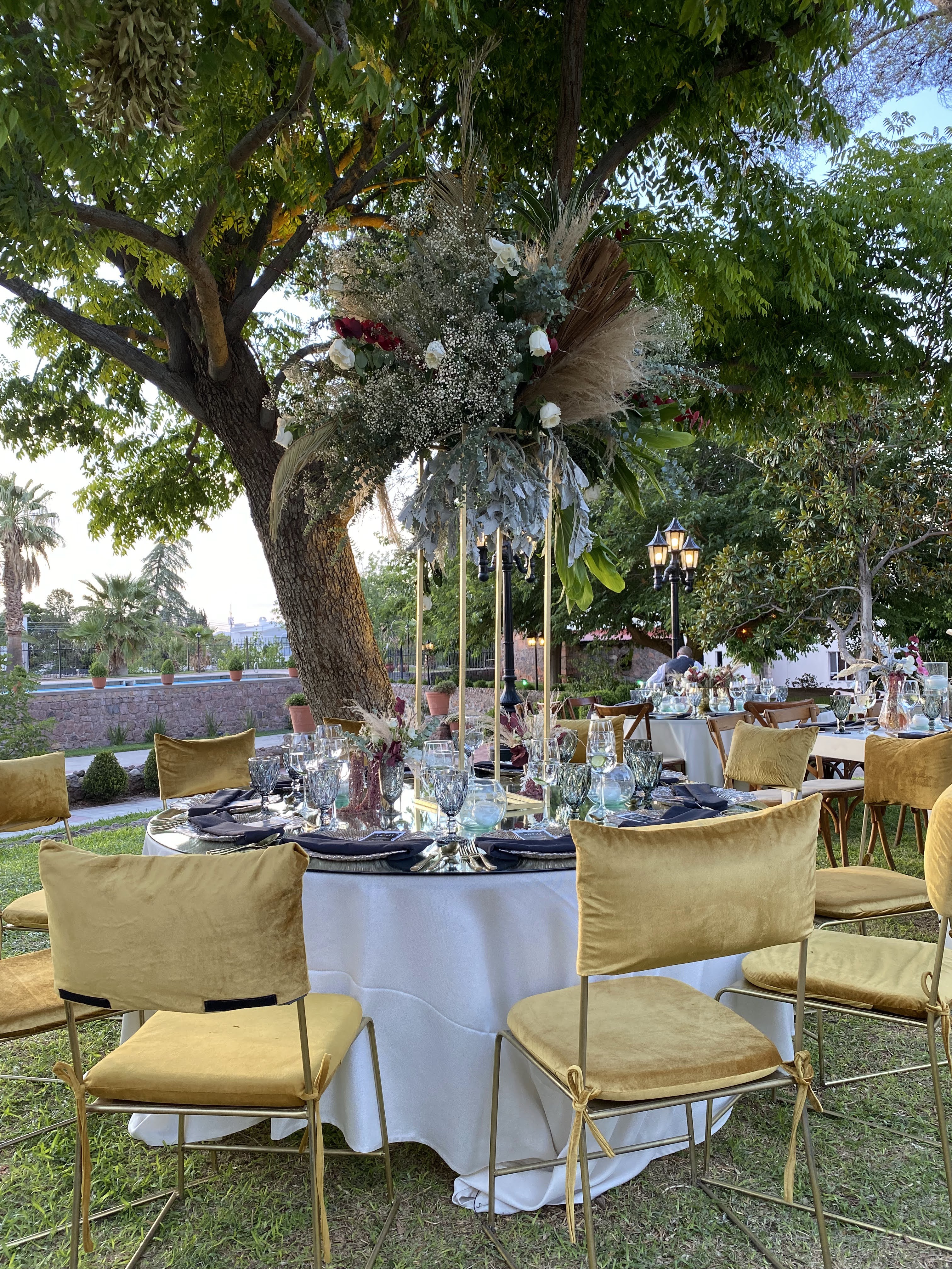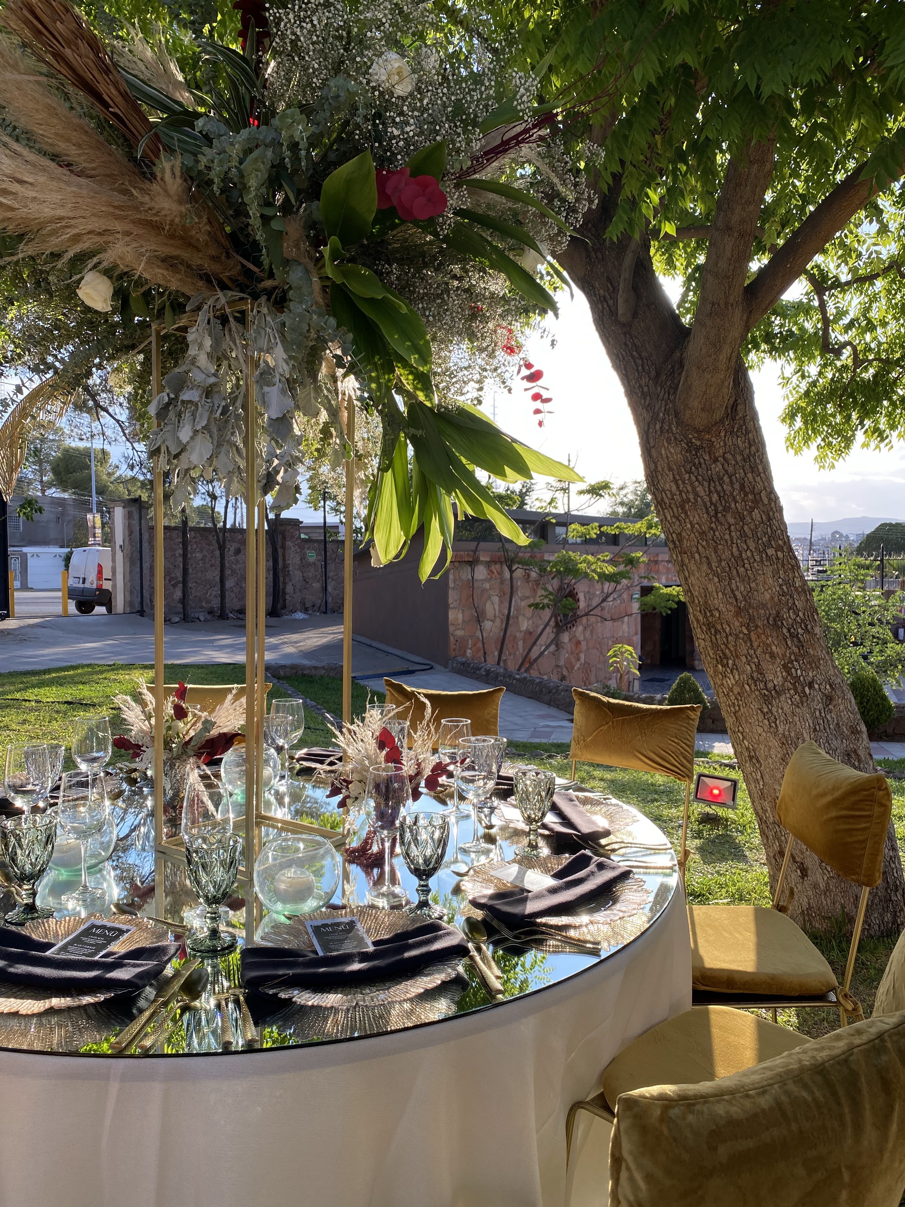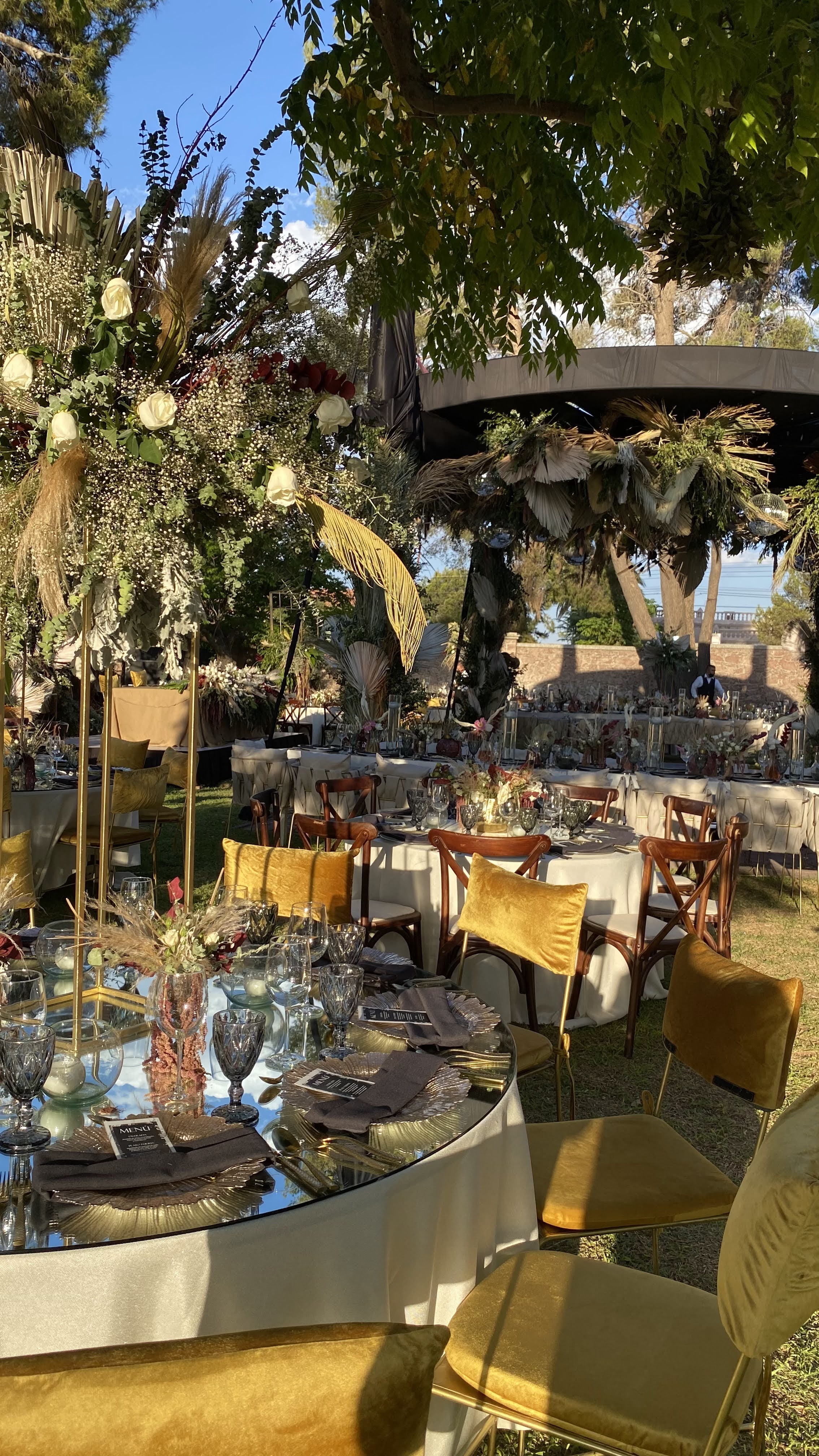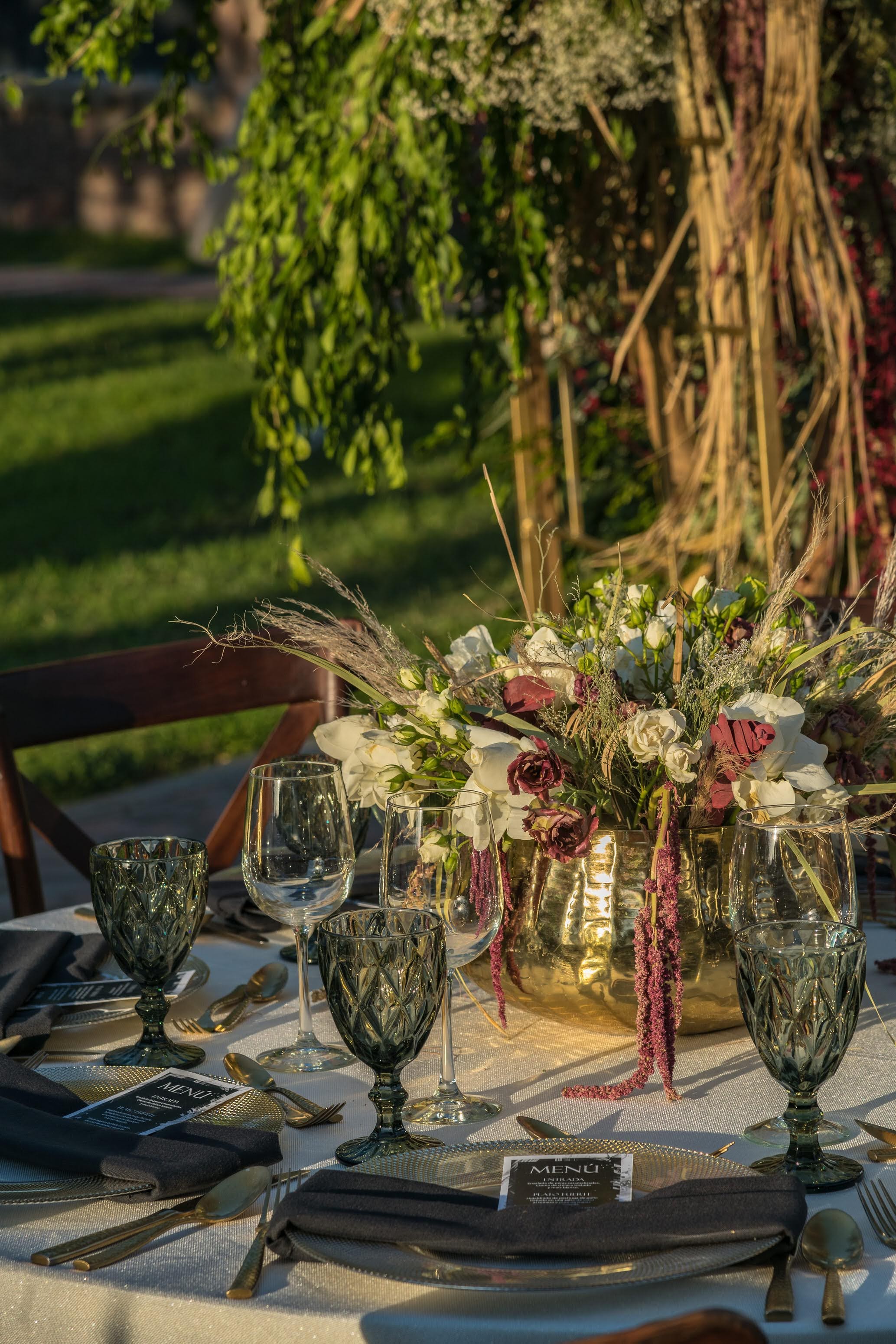 Mesas y sillas de madera clásicas en tonos desvestidos y equilibrados; cristalería en la misma línea con copa burdeos transparente y diamante humo, así como plato de servicio y cubertería dorada. Follaje seco de pampas y naturaleza preservada y para el toque romántico, las flores: lisianthus, tulipanes, dusty miller y amaranto.