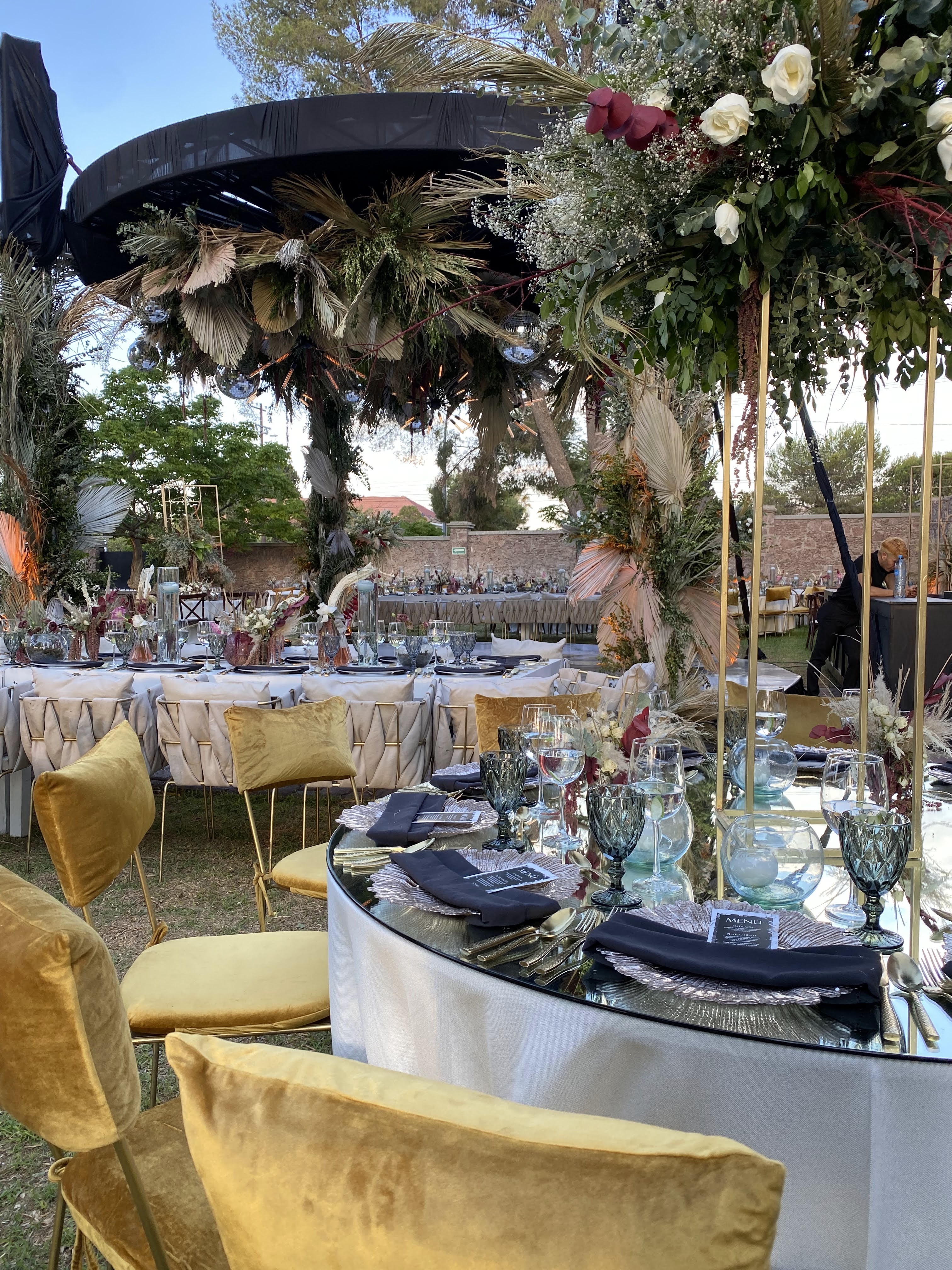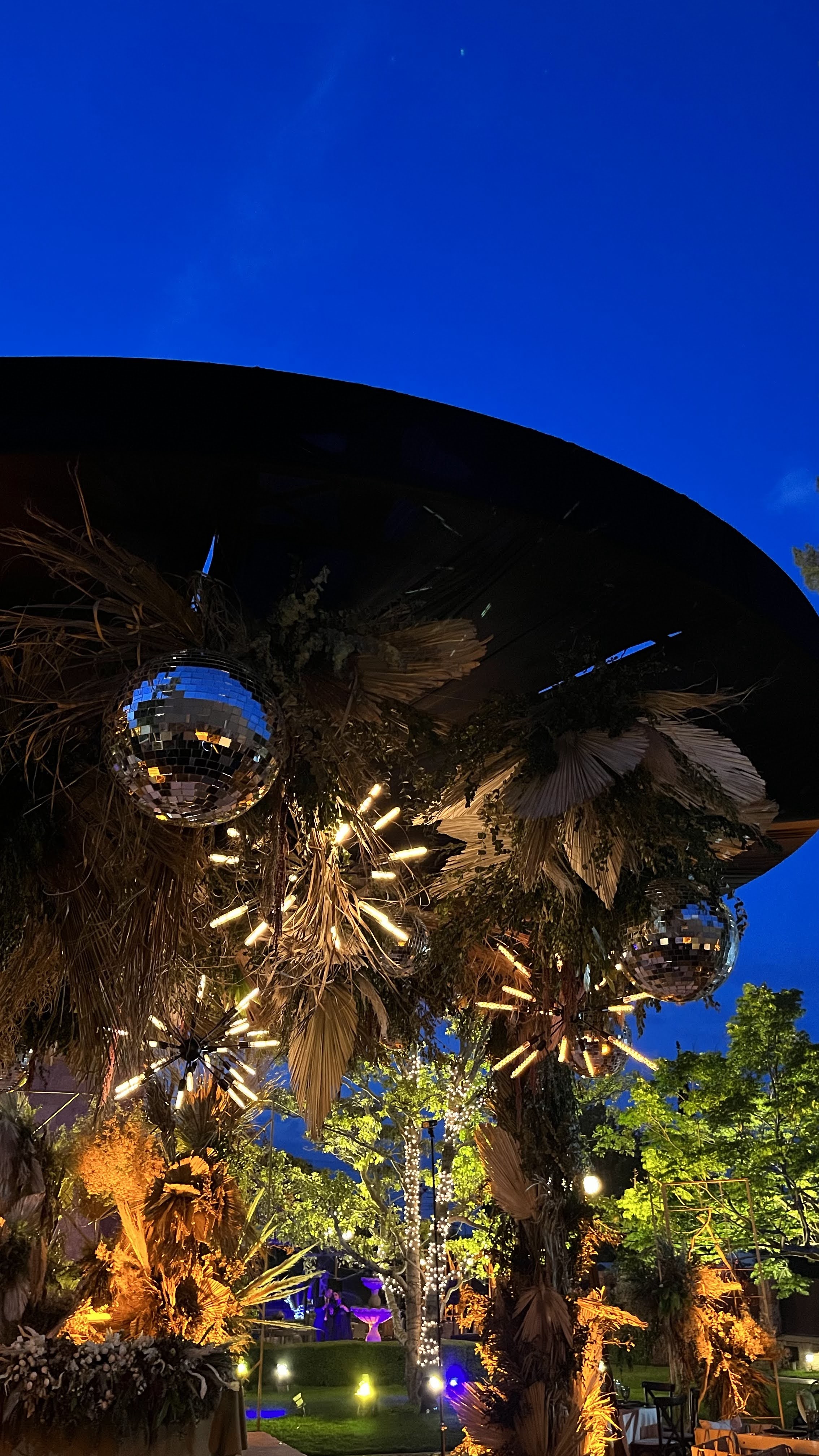 Al centro una estructura circular de mas de ocho metros de altura y diámetro que se adueñaba de todos los ángulos, cubierta de follajes formados de naturaleza preservada conservando los tonos desvanecidos del resto de la decoración. Además unas bolas de cristal gigantes en conjunto con unos candelabros tipo sputnik de led que dotaban de una personalidad única a todo el evento.