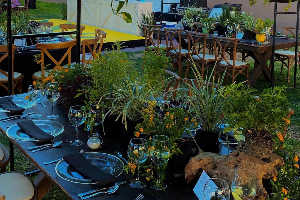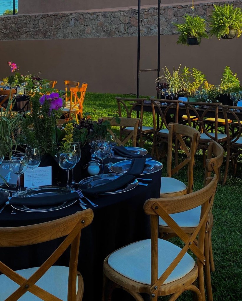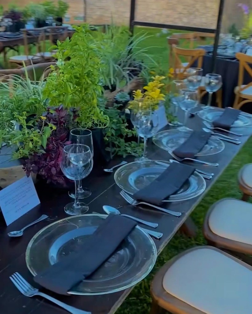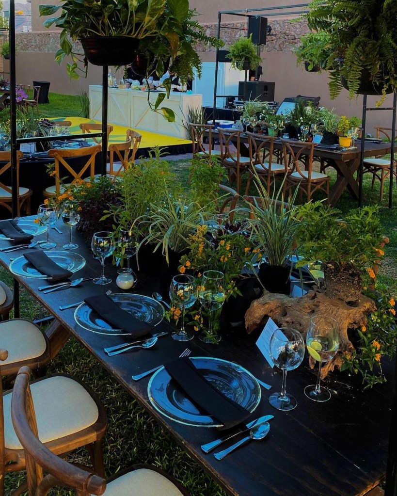 Para hacer match con los troncos, orquideas, enredaderas, helechos, romeros y todas las plantas utilizadas para la decoración en las que predominaba el verde, la elección fue colores oscuros en todos los elementos: estructuras y mesas en negro, de madera parda al igual que las sillas; copa y plato trasparente con toques en planta en combinación con la cubertería y por último servilleta negra. Todo en su conjunto lograba crear un ambiente natural y refinado a la vez.