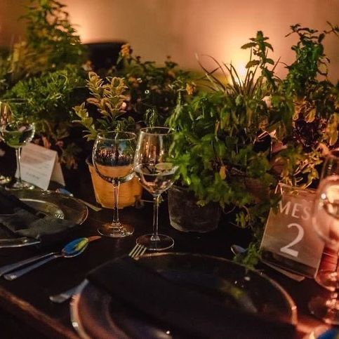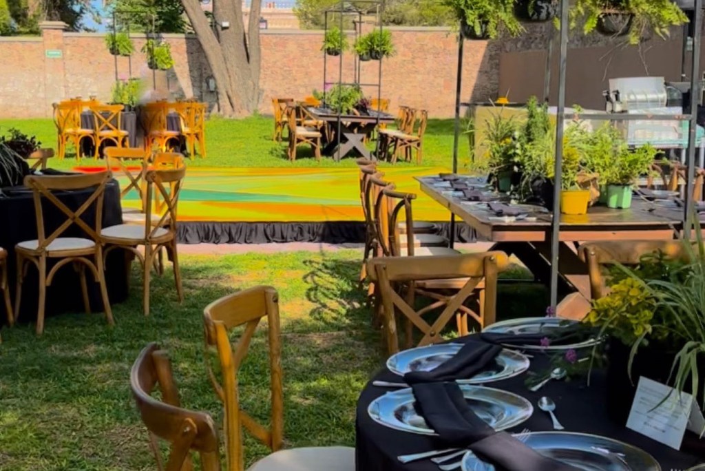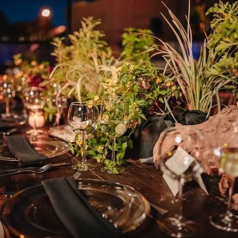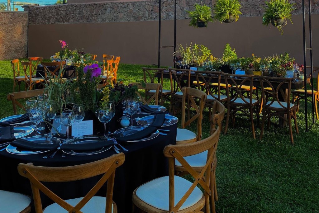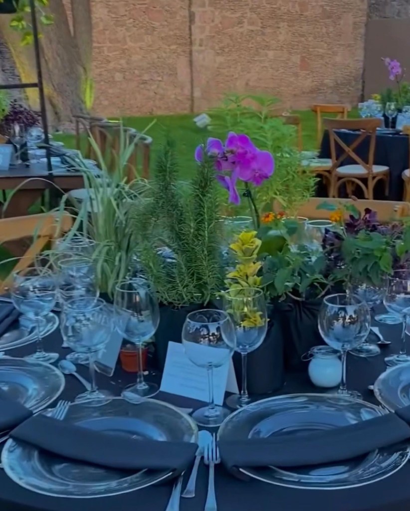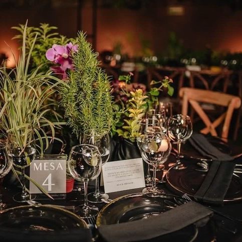 Para hacer match con los troncos, orquideas, enredaderas, helechos, romeros y todas las plantas utilizadas para la decoración en las que predominaba el verde, la elección fue colores oscuros en todos los elementos: estructuras y mesas en negro, de madera parda al igual que las sillas; copa y plato trasparente con toques en planta en combinación con la cubertería y por último servilleta negra. Todo en su conjunto lograba crear un ambiente natural y refinado a la vez.