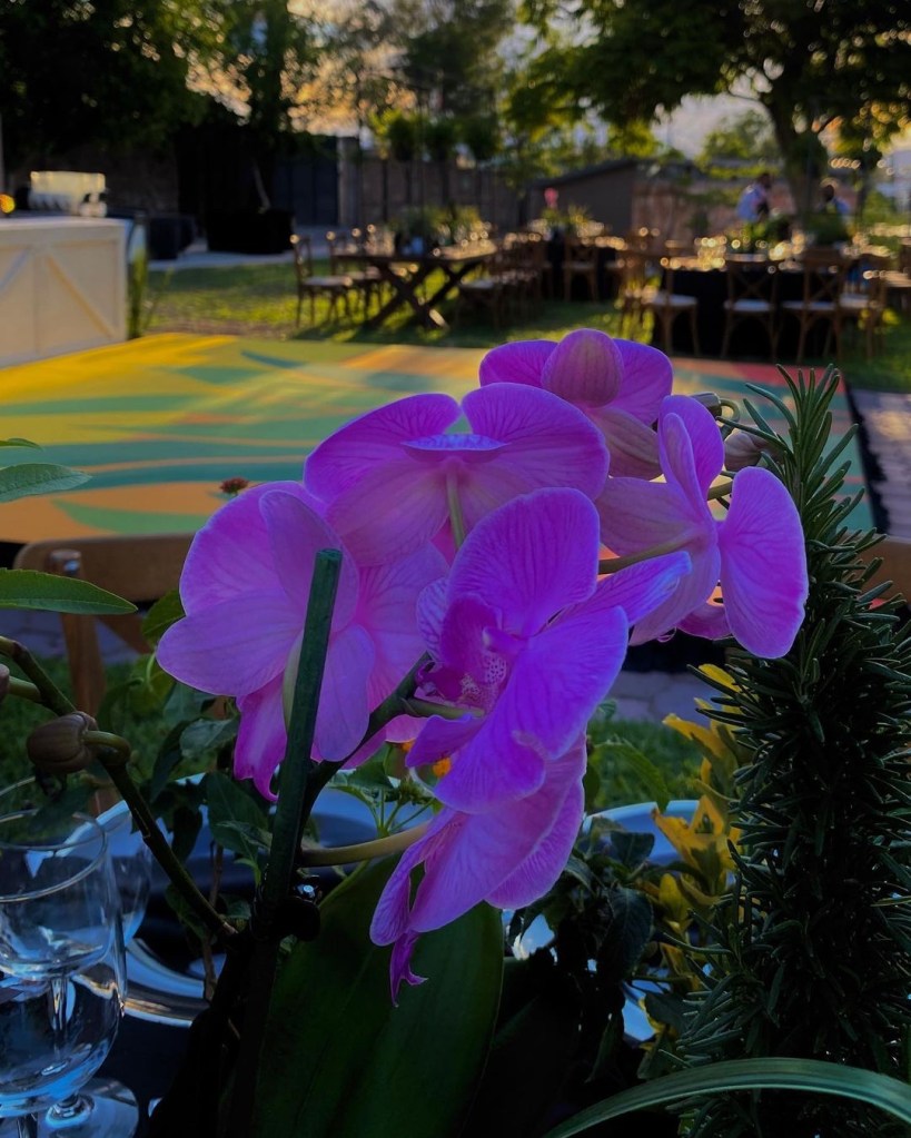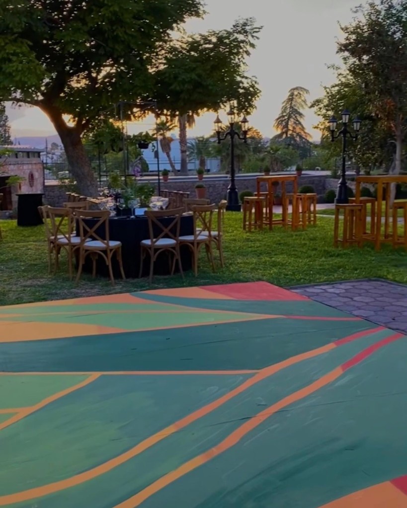 Además de las plantas vivas por toda la boda que ademas de decorar aromatizaban todo el lugar, los novios querían combinarla con un sentimiento de pertenencia para los invitados que venían de diferentes partes y que mejor para simbolizar ese sentimiento que una pista pintada a mano inspirada por el tequila y el mezcal, con una planta de agave (maguey) con colores vibrantes a juego con la naturaleza vital alrededor y que ademas replicamos con luces por todo alrededor de la fiesta. Que al igual que la decoración estuvo muy viva durante toda la noche.