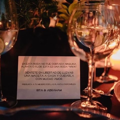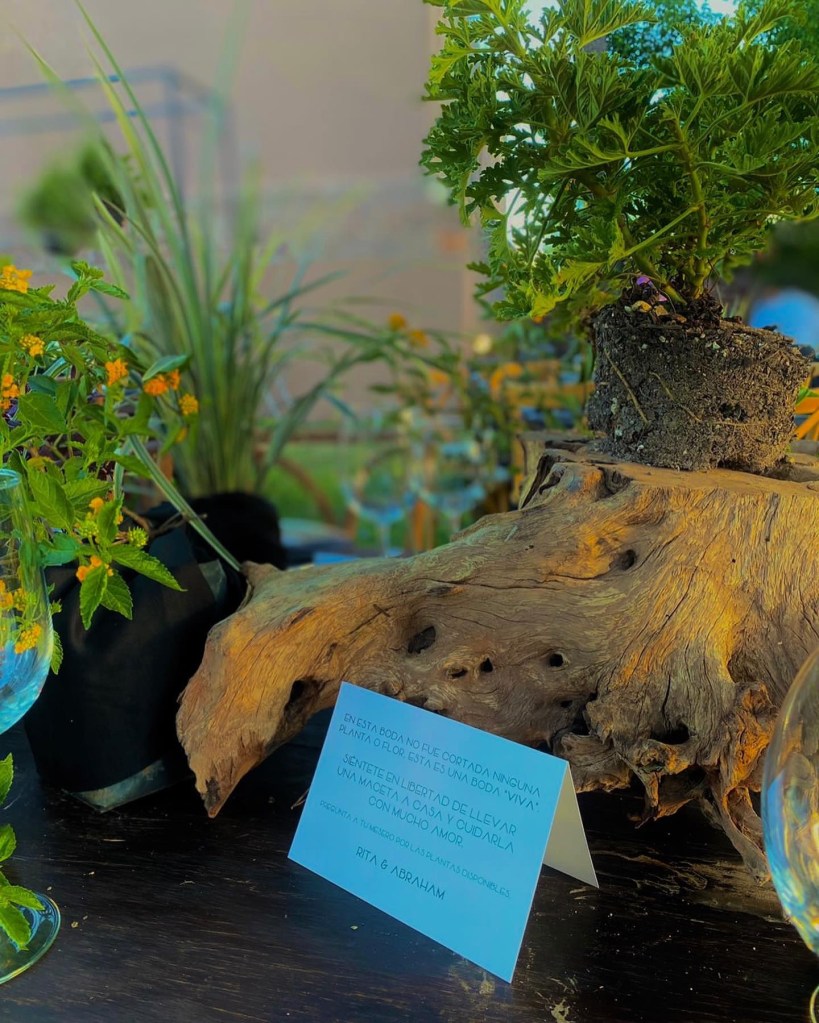 “En esta celebración no fue cortada ninguna flor o planta para decoración, esta es una boda viva. Siéntete en libertad de llevar una planta contigo a casa y cuidarla con mucho amor.”