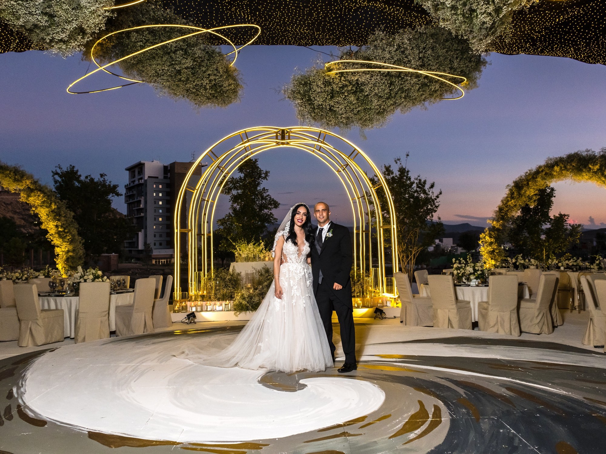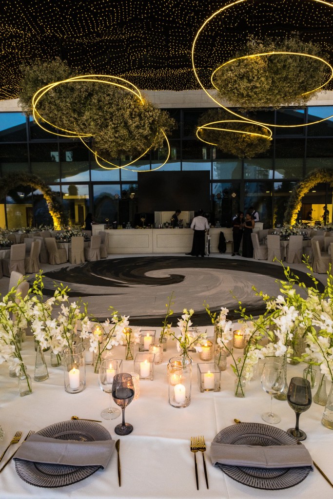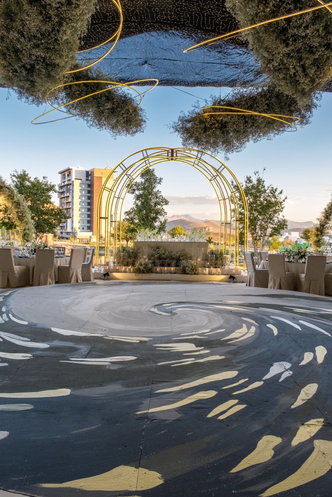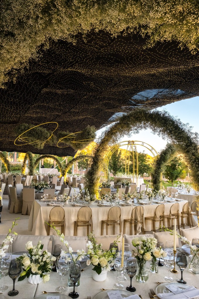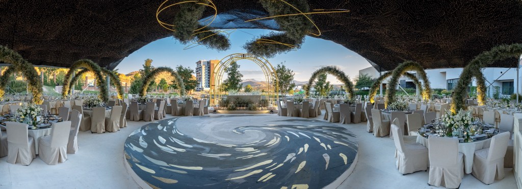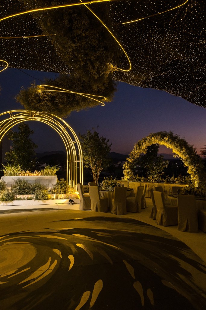 Comenzamos en el centro: una pista pintada a mano que representaba sus dos universos uniéndose en uno solo, ahí mismo fue dónde su primer baile de esposos nos dejo a todos con los ojos llorosos. Encima de ellos todo el firmamento, un cielo estrellado que lo envolvía todo, los orbitaban arcos y esferas de flor nube con anillos de luces de neon que dotaban al entorno de una sensación de infinitud.