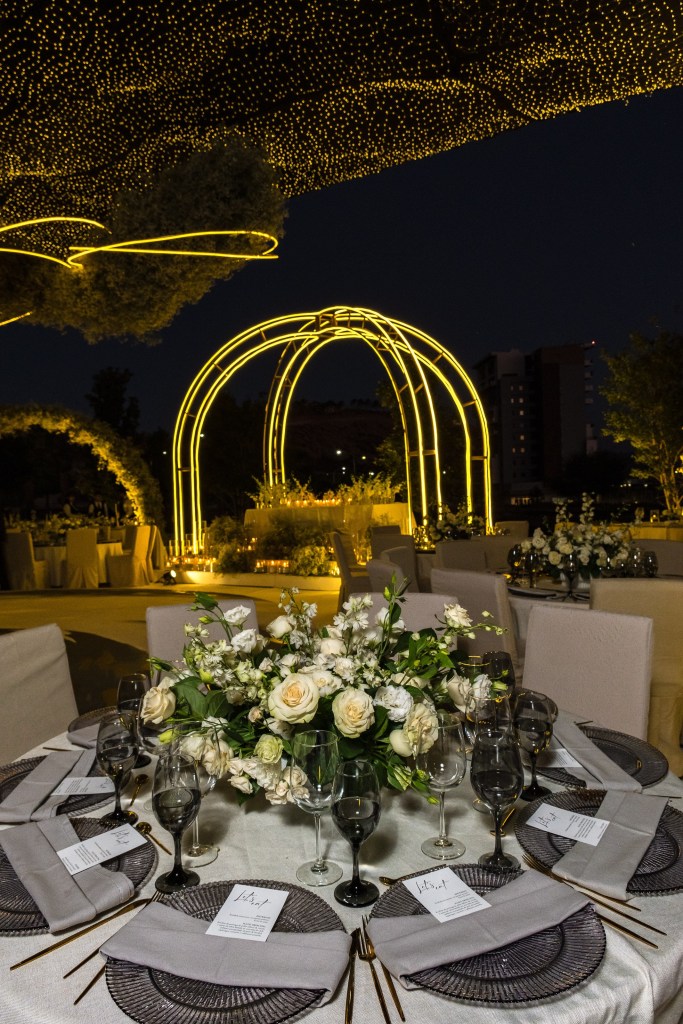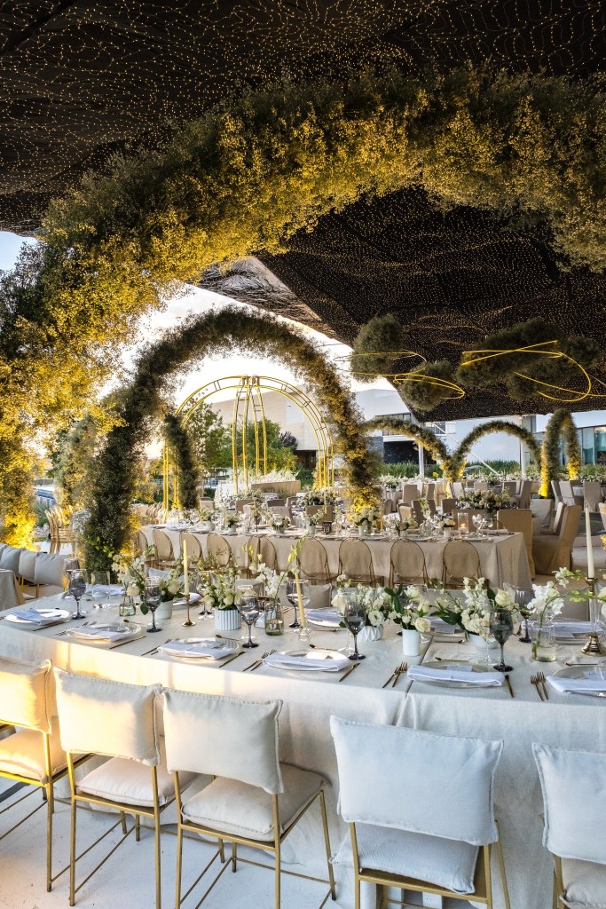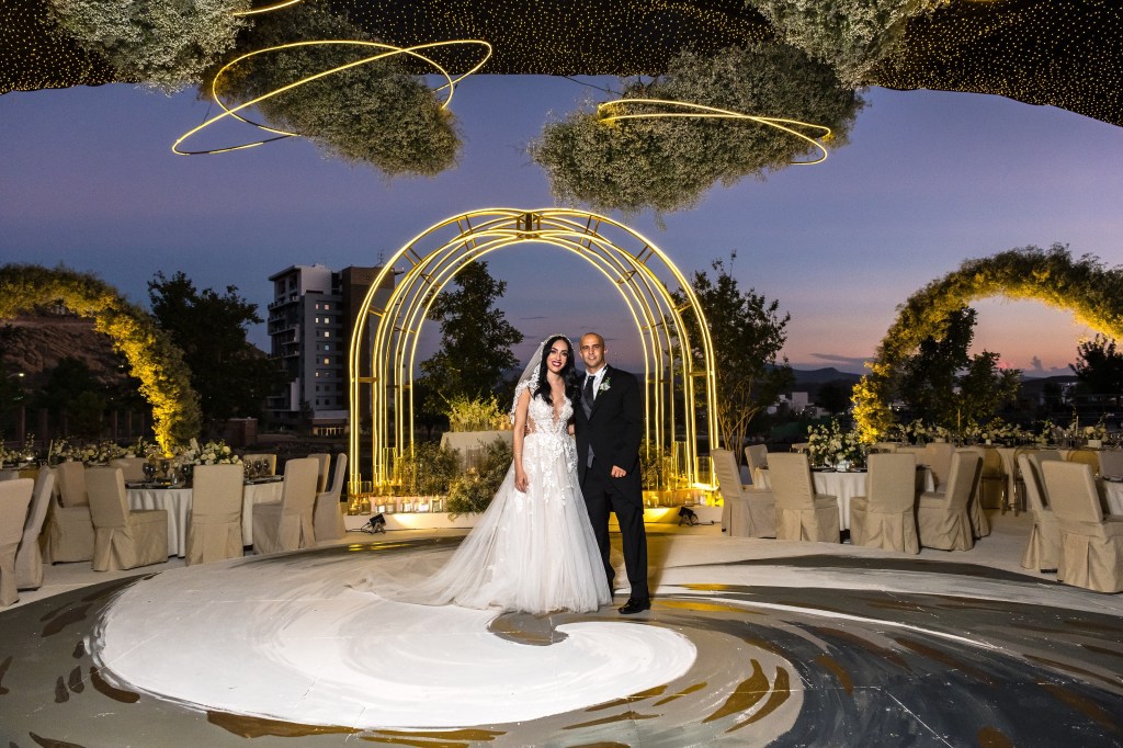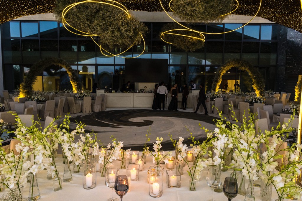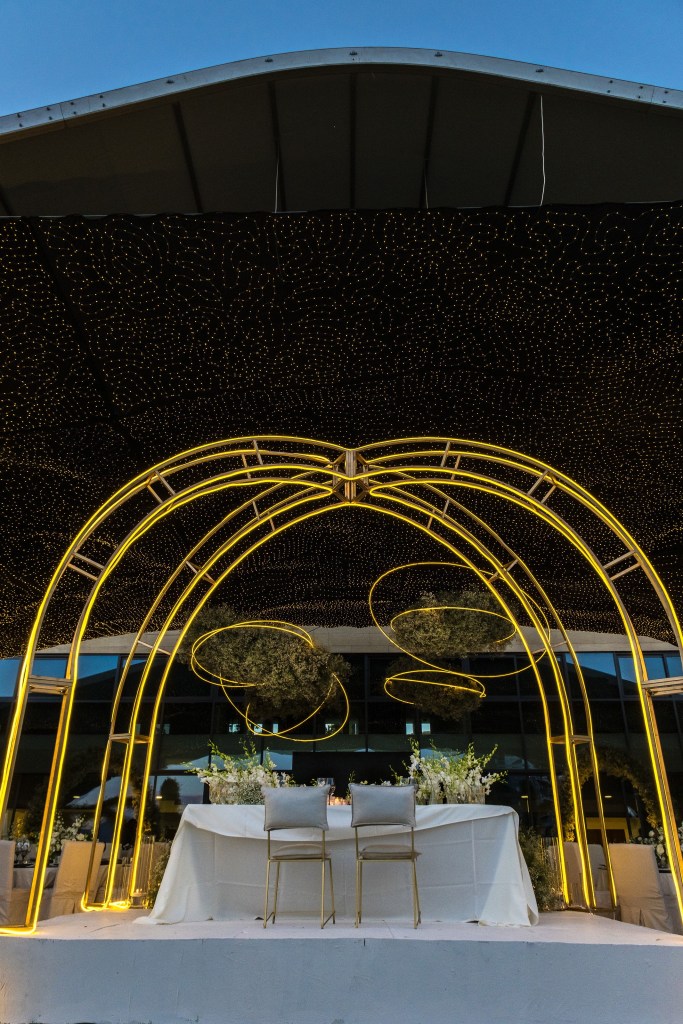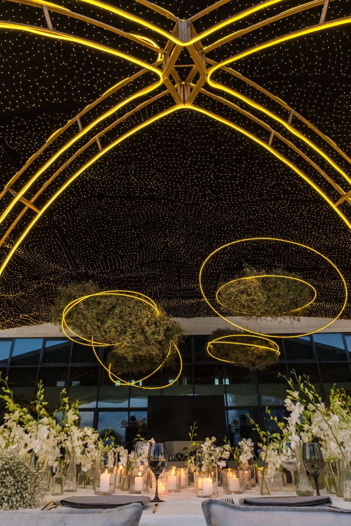 Comenzamos en el centro: una pista pintada a mano que representaba sus dos universos uniéndose en uno solo, ahí mismo fue dónde su primer baile de esposos nos dejo a todos con los ojos llorosos. Encima de ellos todo el firmamento, un cielo estrellado que lo envolvía todo, los orbitaban arcos y esferas de flor nube con anillos de luces de neon que dotaban al entorno de una sensación de infinitud.