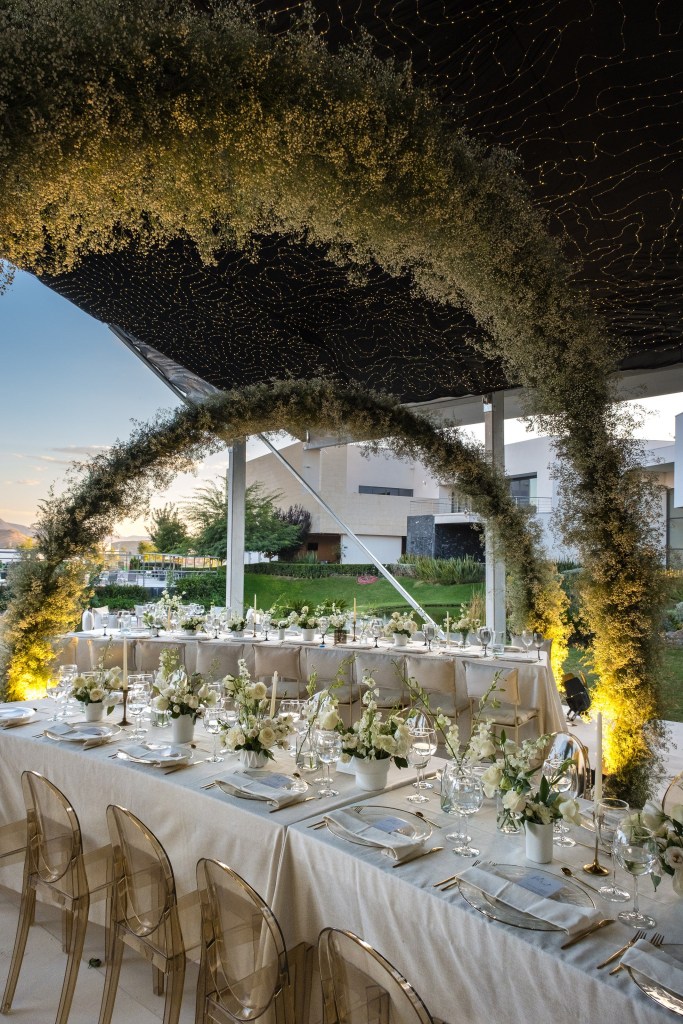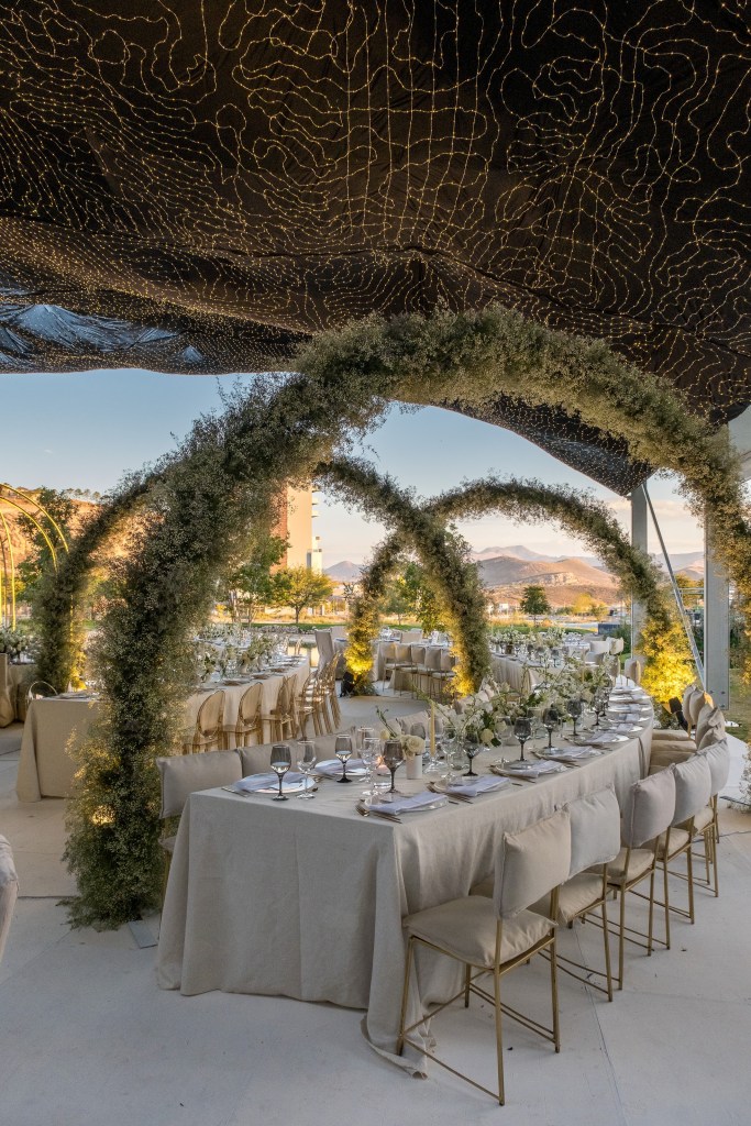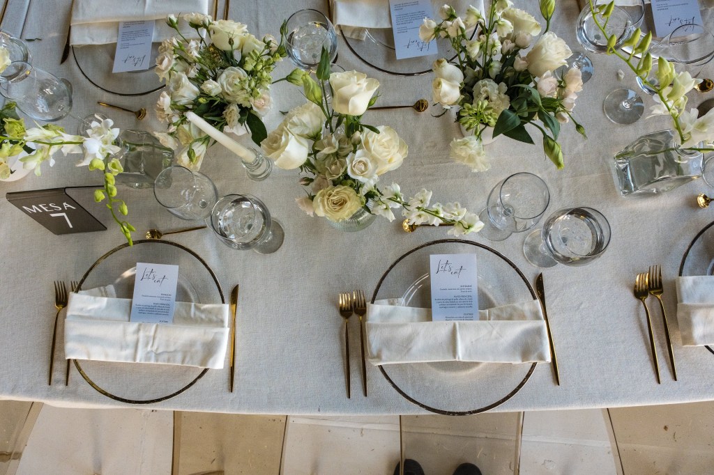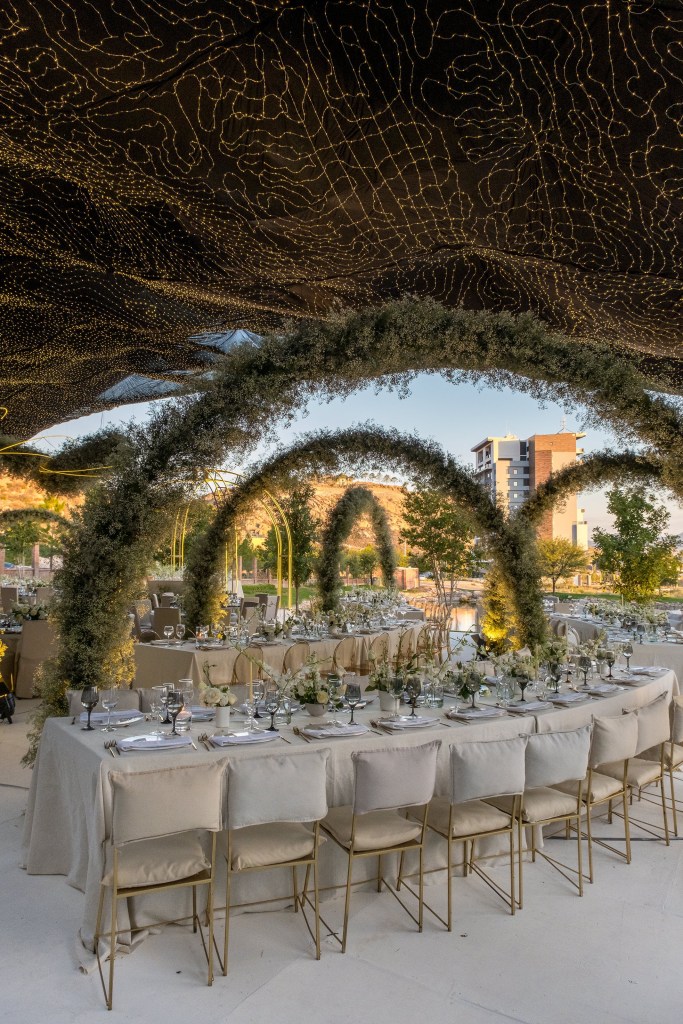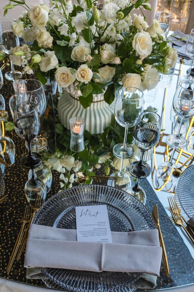 Del espacio sideral a la tierra: con flores de un blanco a juego con el vestido de la novia distribuidas de forma aleatoria sobre la mesa principal y en el resto de ellas sobre espejos que reflejaban la bóveda celeste. Un día que dio paso a una noche que se alargó entre muestras de cariño, una cena deliciosa, muchos abrazos, mucho baile y unos cuantos shots de tequila. ¡Guiño, guiño!