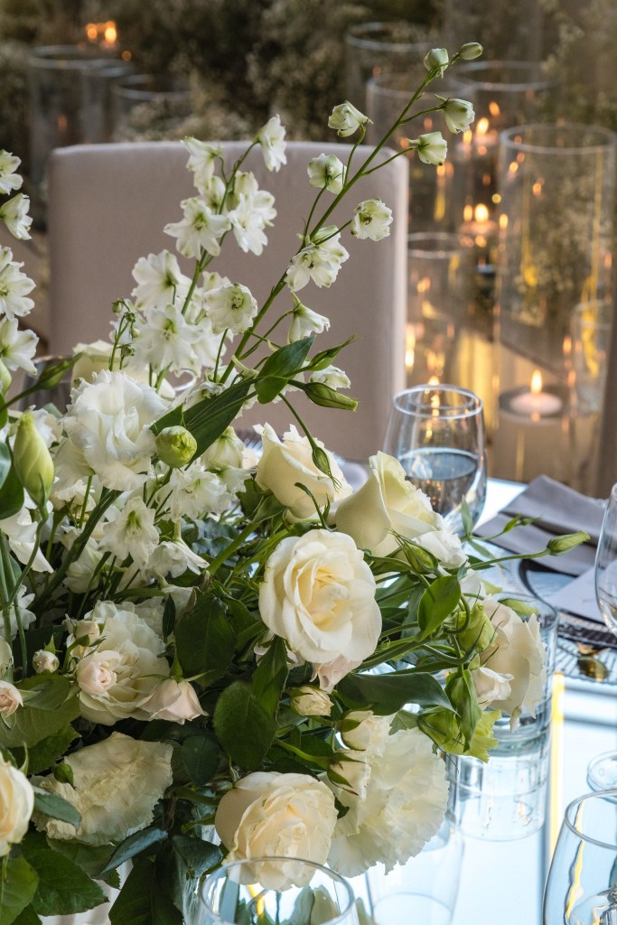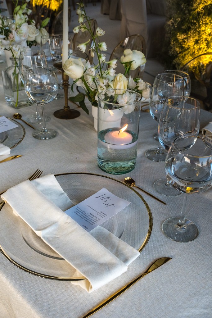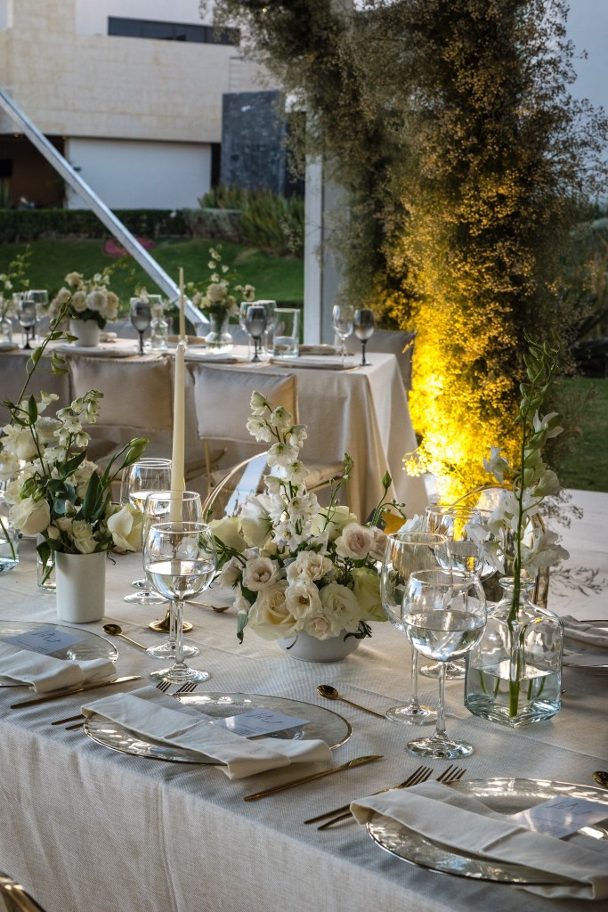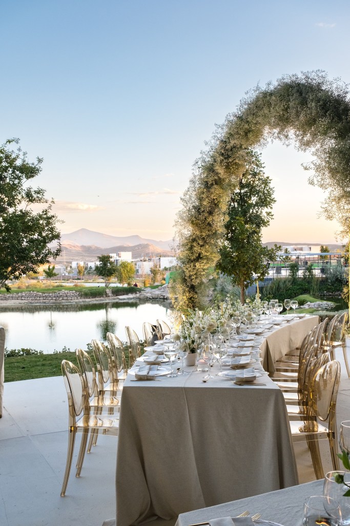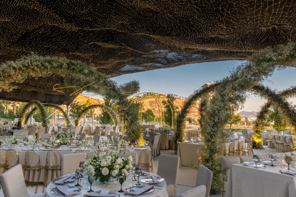 Del espacio sideral a la tierra: con flores de un blanco a juego con el vestido de la novia distribuidas de forma aleatoria sobre la mesa principal y en el resto de ellas sobre espejos que reflejaban la bóveda celeste. Un día que dio paso a una noche que se alargó entre muestras de cariño, una cena deliciosa, muchos abrazos, mucho baile y unos cuantos shots de tequila. ¡Guiño, guiño!