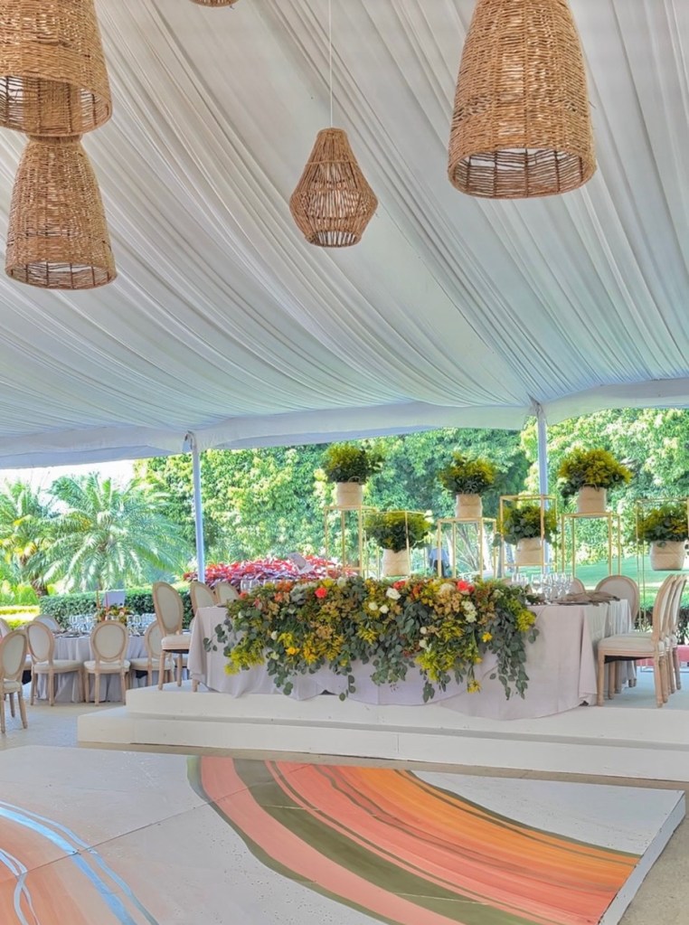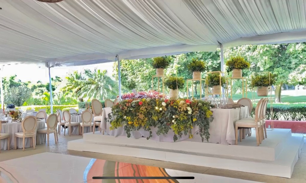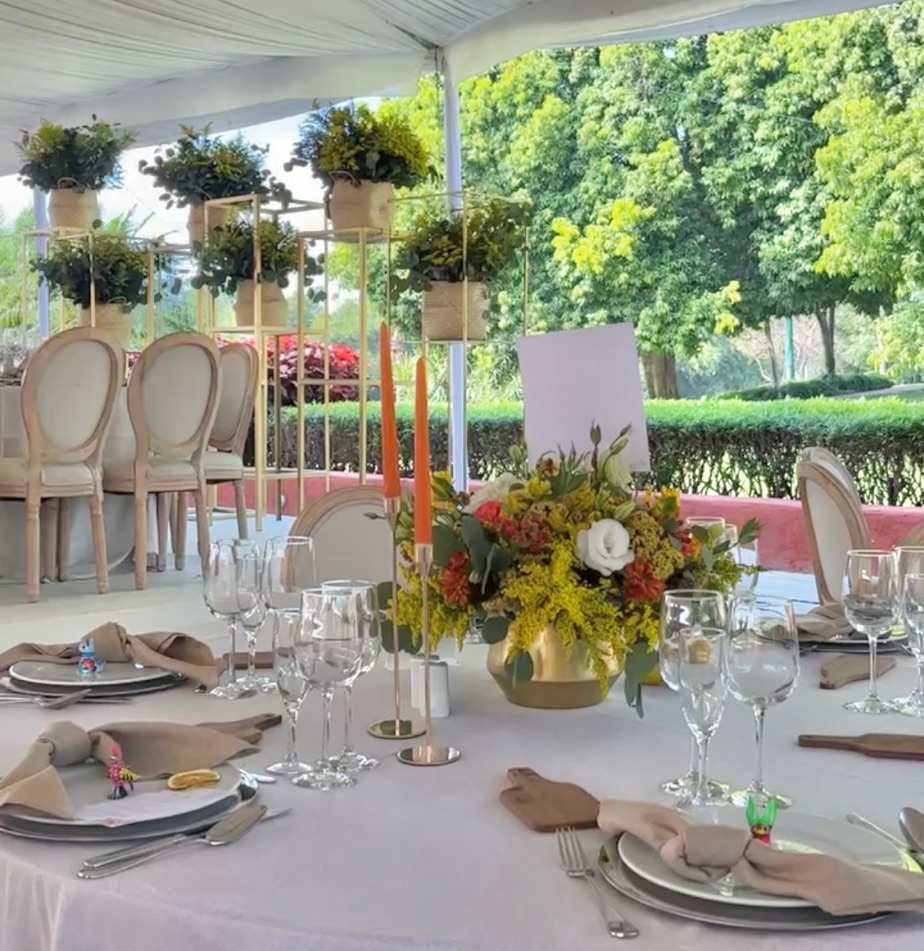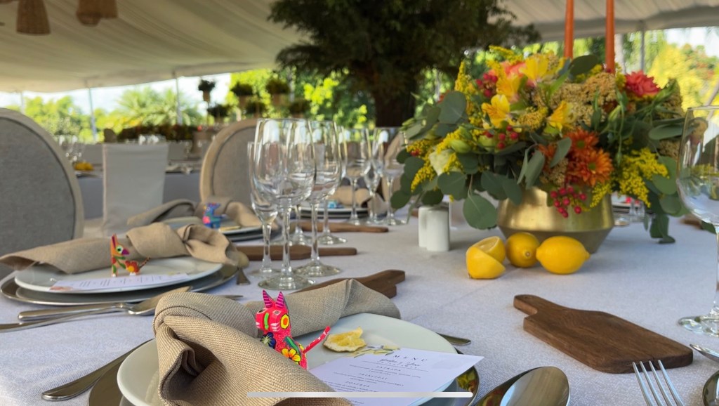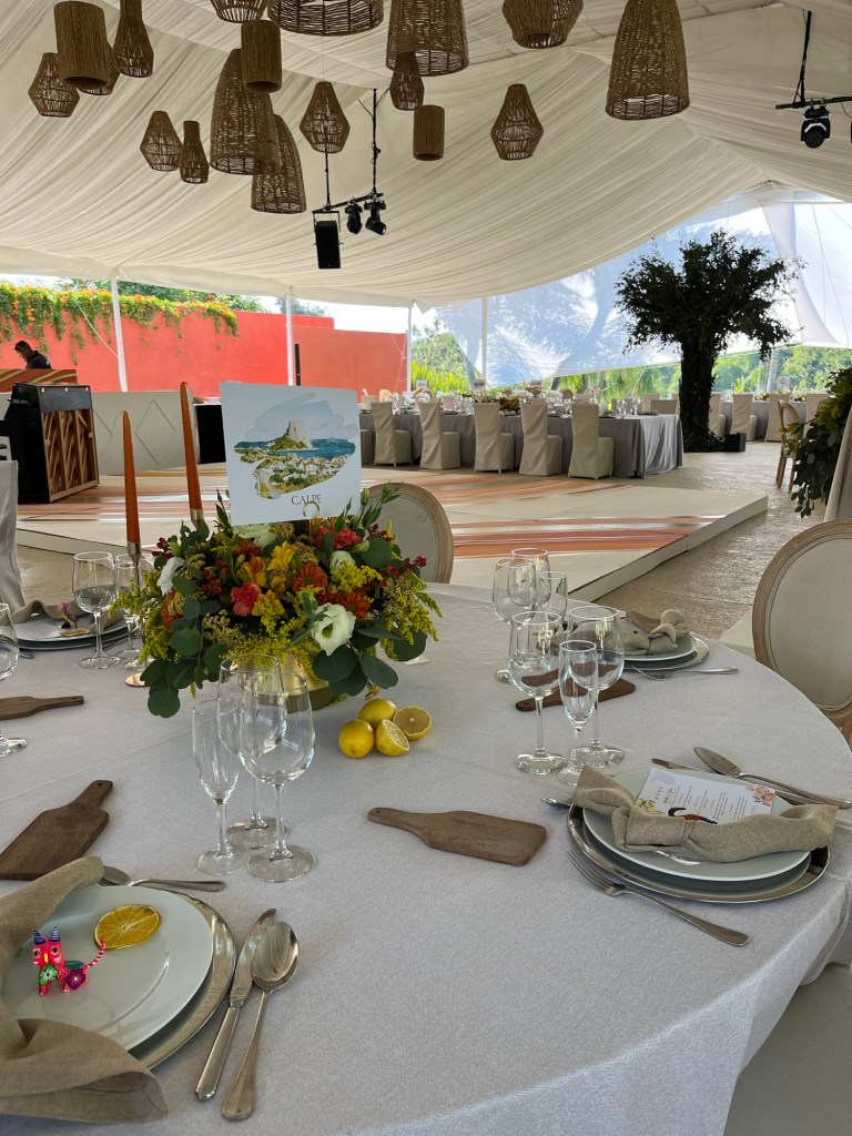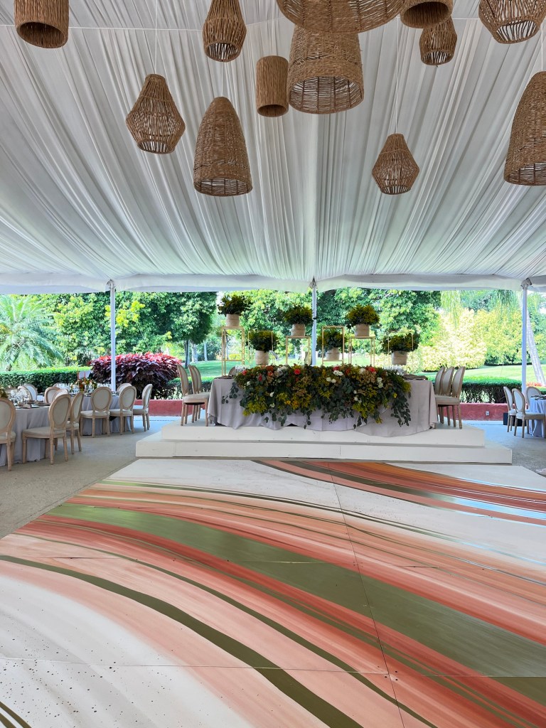 Y después una recepción que se alargó por horas aunque pasó en un abrir y cerrar de ojos. Una carpa con vista al enorme jardín, colores muy vivos mezclados con el blanco impoluto del mobiliario. Los novios bailando y cantando “y siempre cuidar a tu corazón, antes que al mío” sobre la pista de baile pintada a mano en los mismos tonos que las lisianthus, aquileas, camelias y mini rosas distribuidas por todo el lugar, además de detalles frutales para el toque final. Amarillos, naranjas, rojos desvanecidos y verdes se mezclaban perfecto con el detalle que los recién casados eligieron para que todos recordaran ese día: alebrijes personalizados para cada invitado con los colores tan llamativos que los caracterizan.