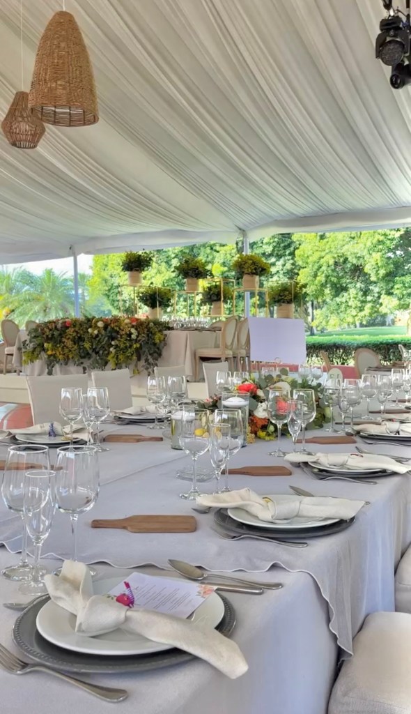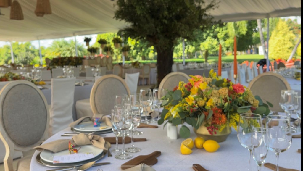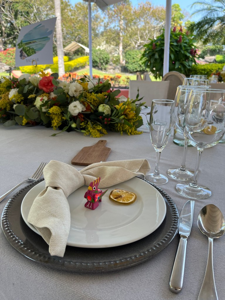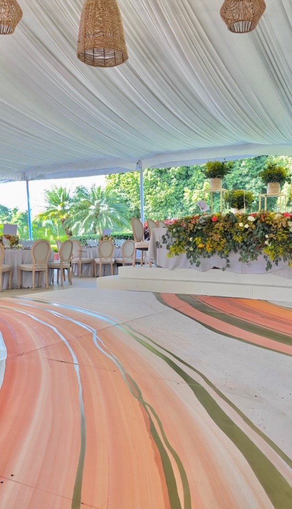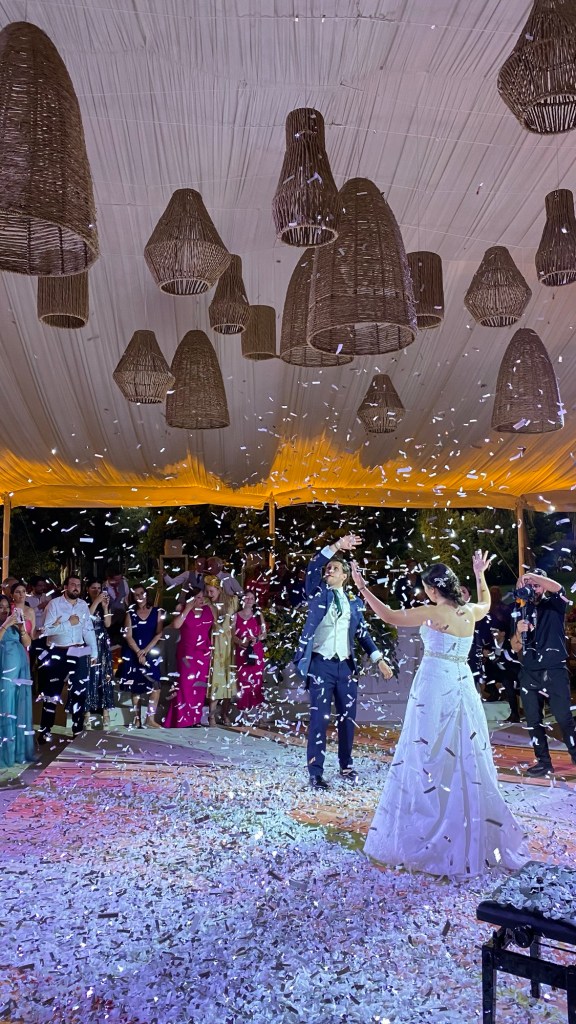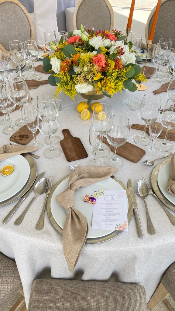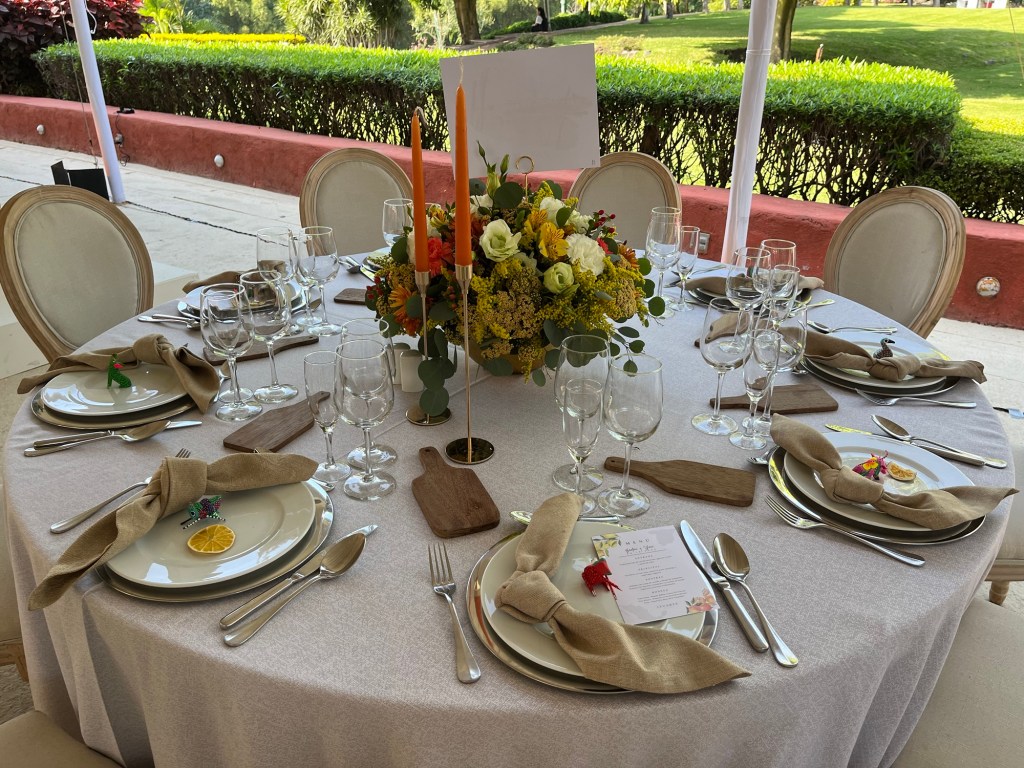 Y después una recepción que se alargó por horas aunque pasó en un abrir y cerrar de ojos. Una carpa con vista al enorme jardín, colores muy vivos mezclados con el blanco impoluto del mobiliario. Los novios bailando y cantando “y siempre cuidar a tu corazón, antes que al mío” sobre la pista de baile pintada a mano en los mismos tonos que las lisianthus, aquileas, camelias y mini rosas distribuidas por todo el lugar, además de detalles frutales para el toque final. Amarillos, naranjas, rojos desvanecidos y verdes se mezclaban perfecto con el detalle que los recién casados eligieron para que todos recordaran ese día: alebrijes personalizados para cada invitado con los colores tan llamativos que los caracterizan.