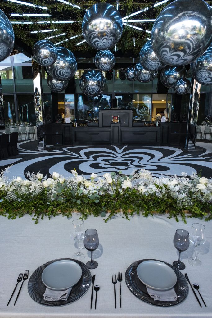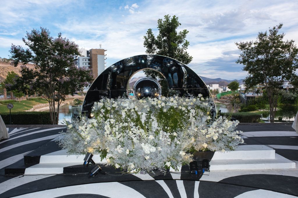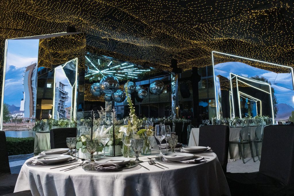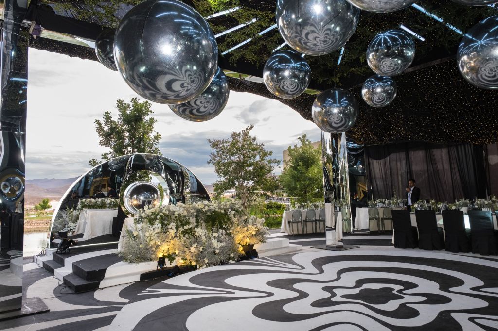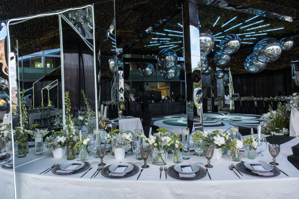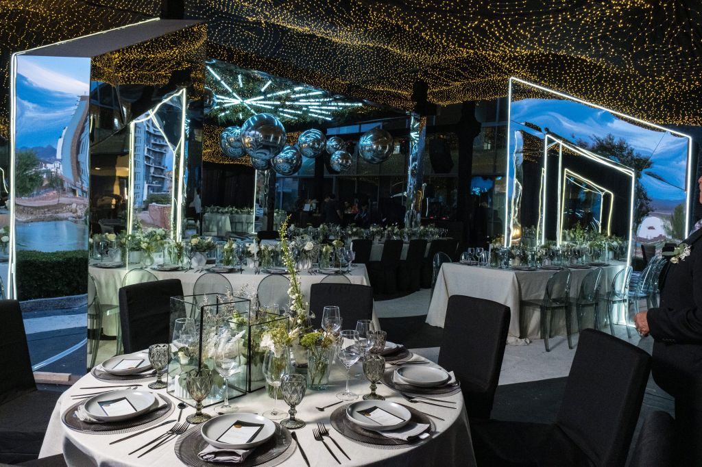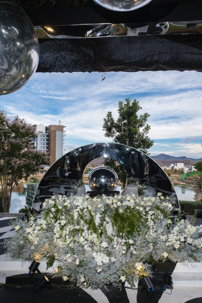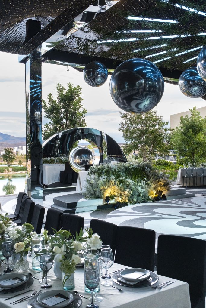 En un montaje circular decidimos incorporar elementos punk, eléctricos y futuristas: estructuras de espejos de diferentes formas y tamaños, una tarima pintada con detalles surrealistas que se extendía desde el centro de la pista de baile hasta el último rincón, luces de neón detrás de la mesa de novios, al centro y sobre las estructuras logrando que desde cualquier lugar cada invitado tuviera una imagen única.