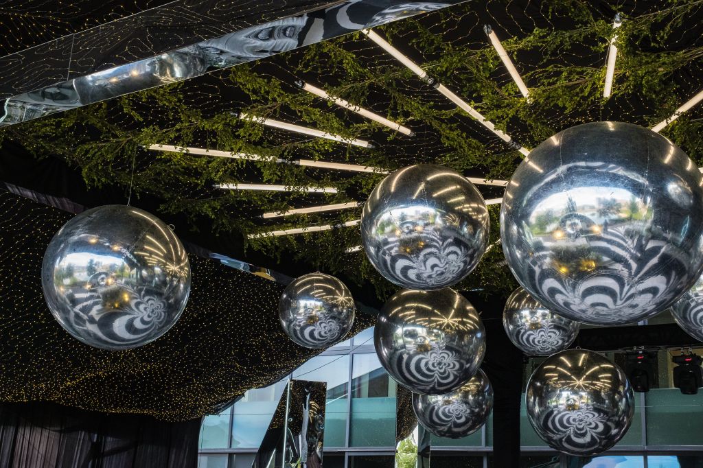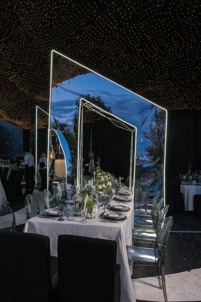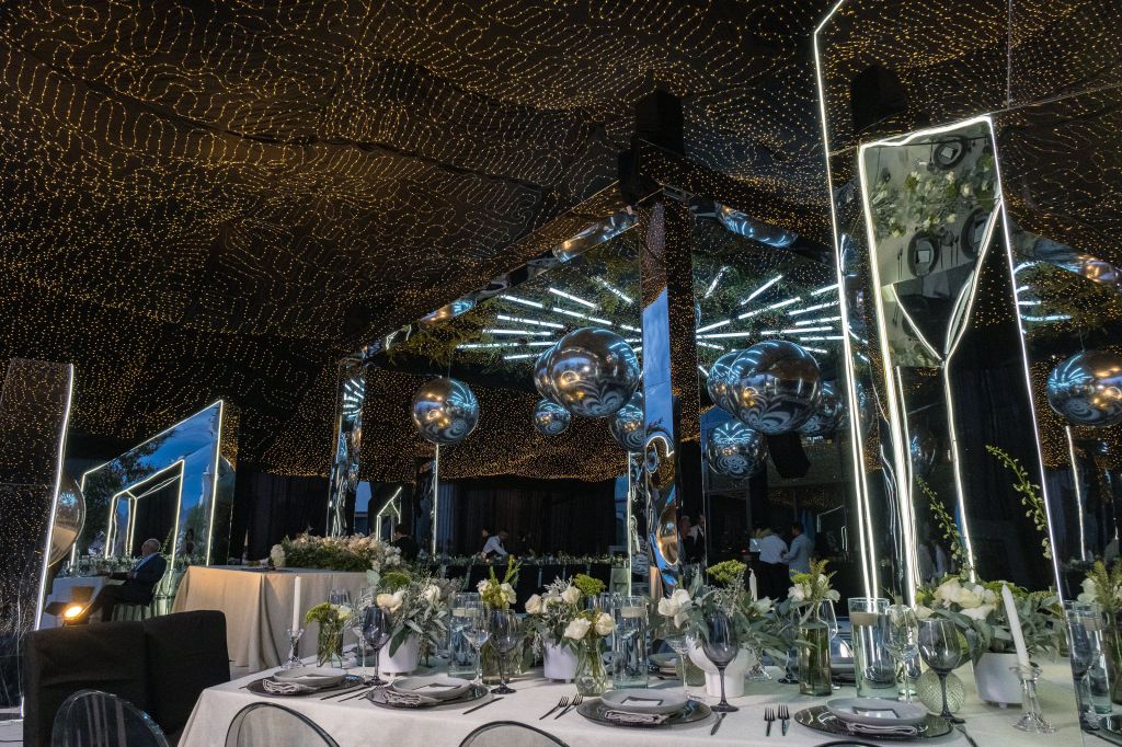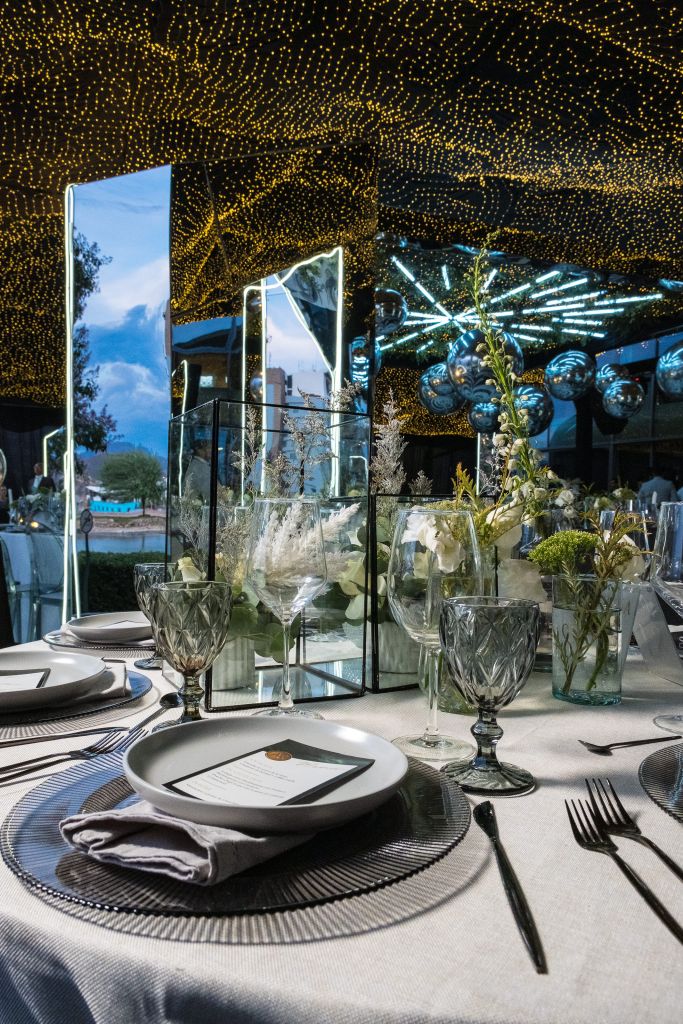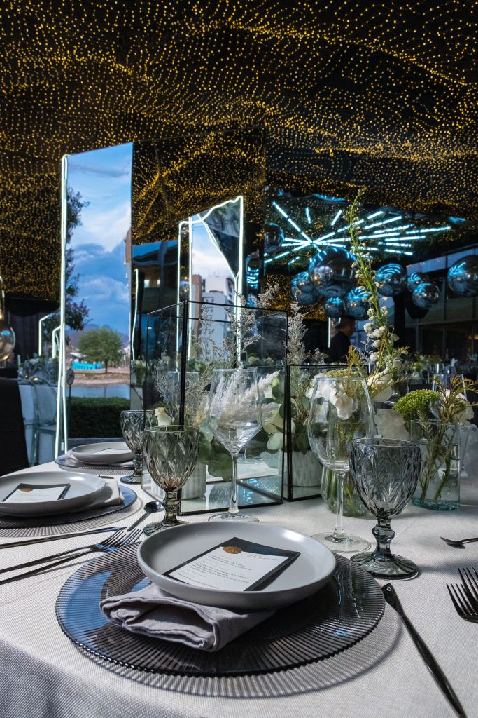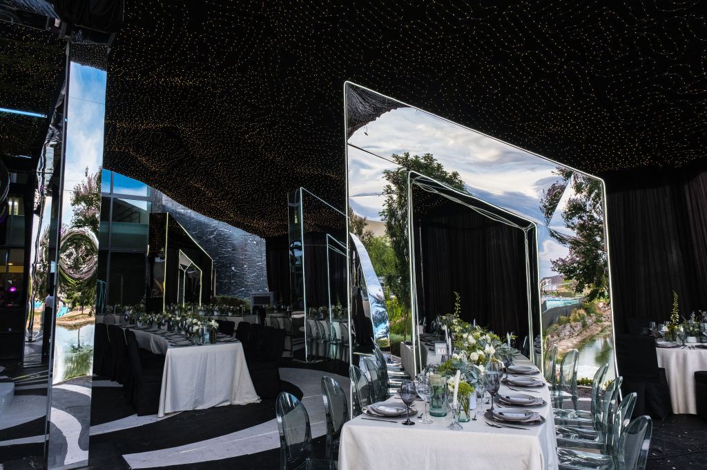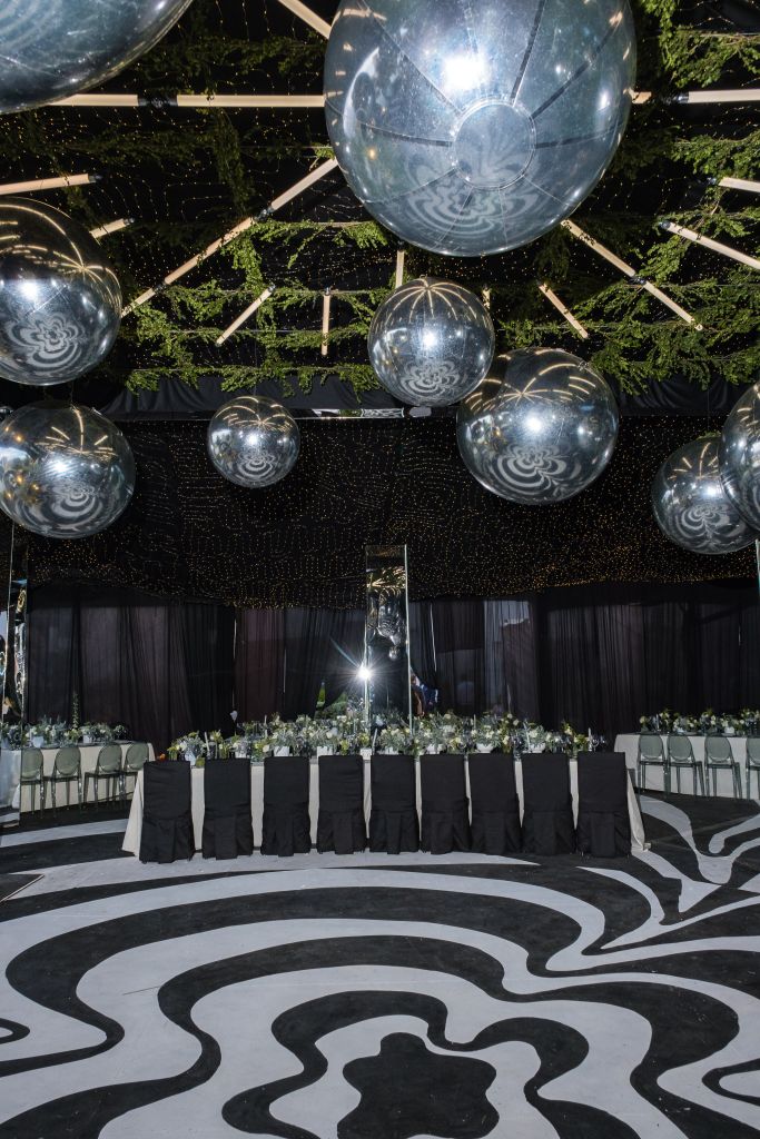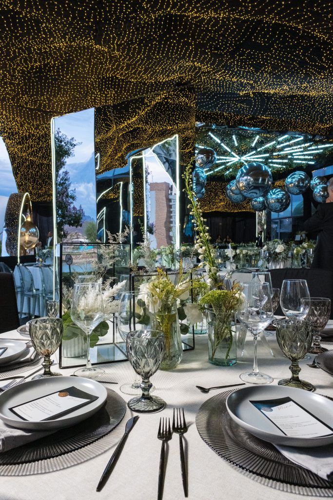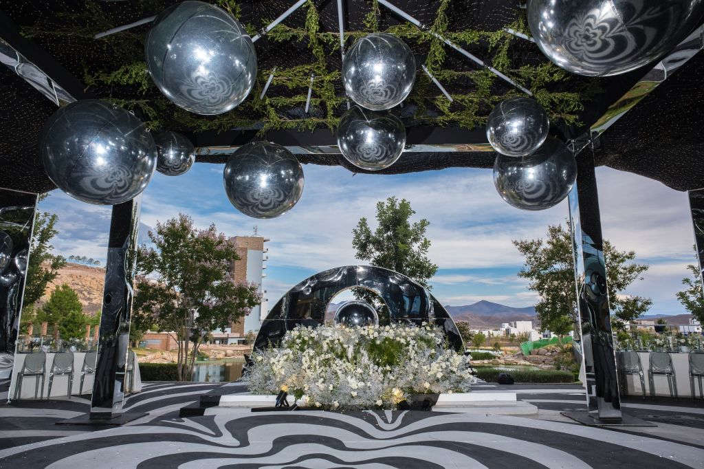 En un montaje circular decidimos incorporar elementos punk, eléctricos y futuristas: estructuras de espejos de diferentes formas y tamaños, una tarima pintada con detalles surrealistas que se extendía desde el centro de la pista de baile hasta el último rincón, luces de neón detrás de la mesa de novios, al centro y sobre las estructuras logrando que desde cualquier lugar cada invitado tuviera una imagen única.