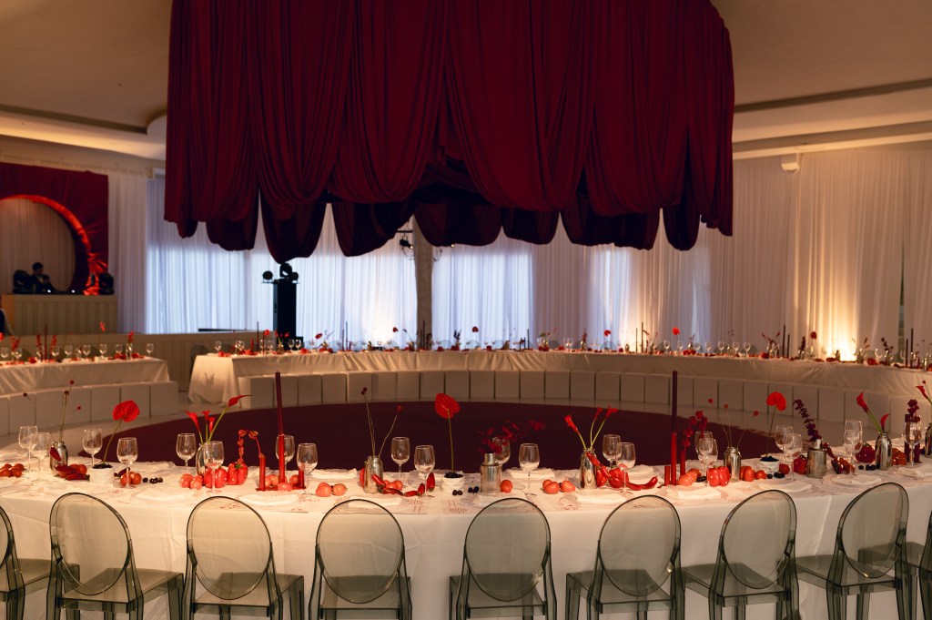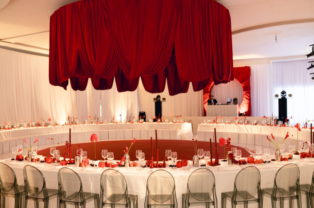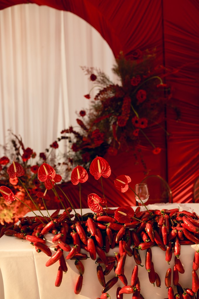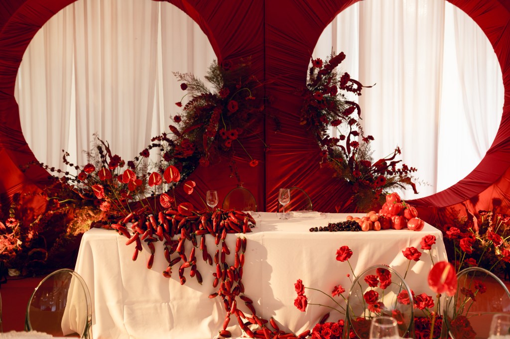 El rojo fue mucho más que un color; fue un manifiesto visual que apareció en cada detalle: flores escultóricas, pimientos, cerezas, tomates cherry y hasta el piso fue intervenido.