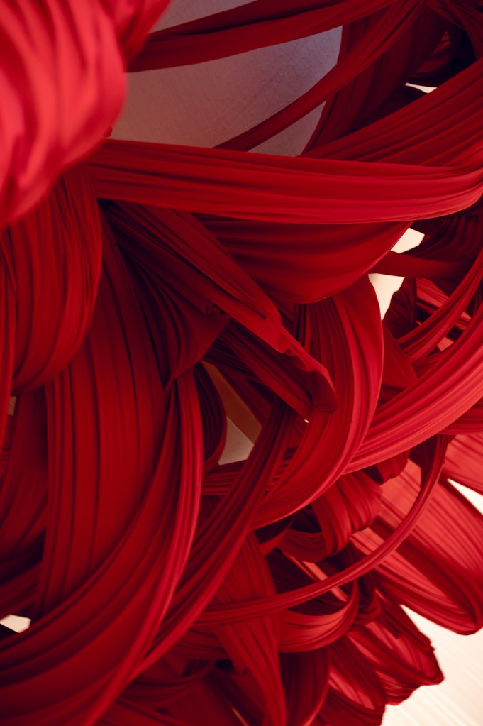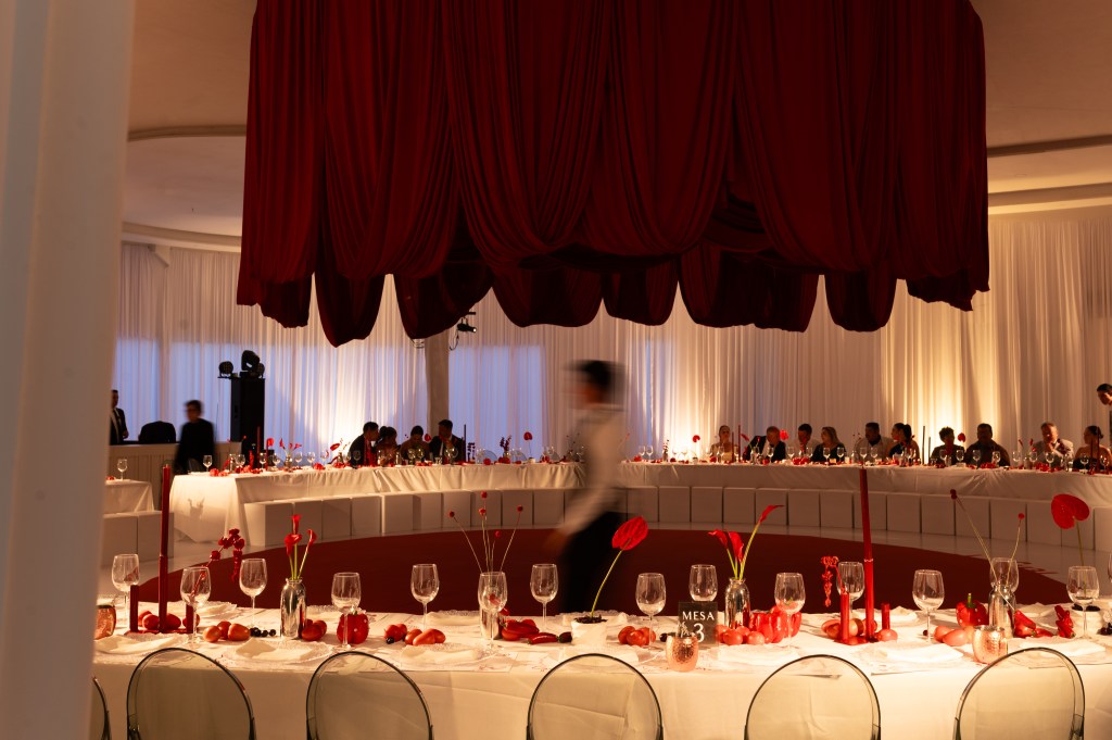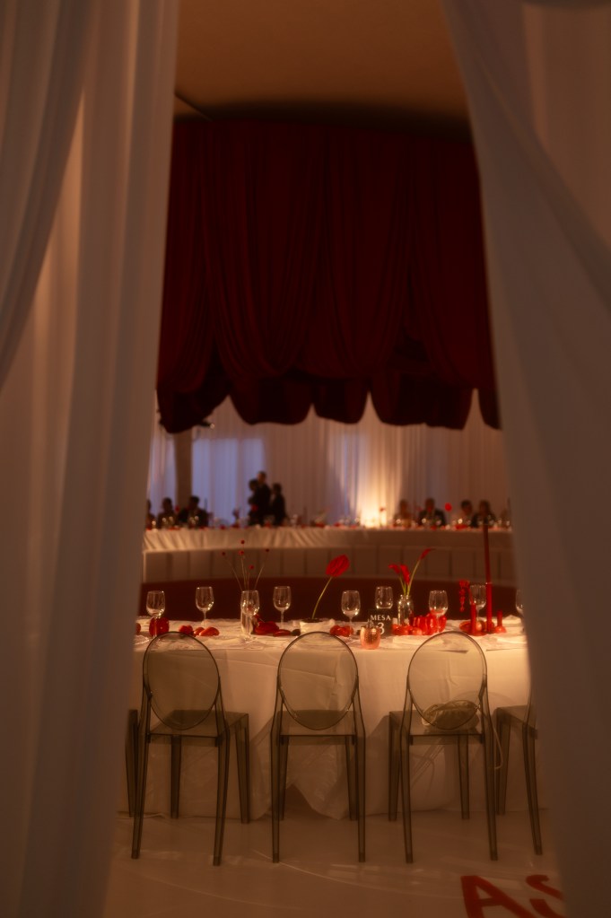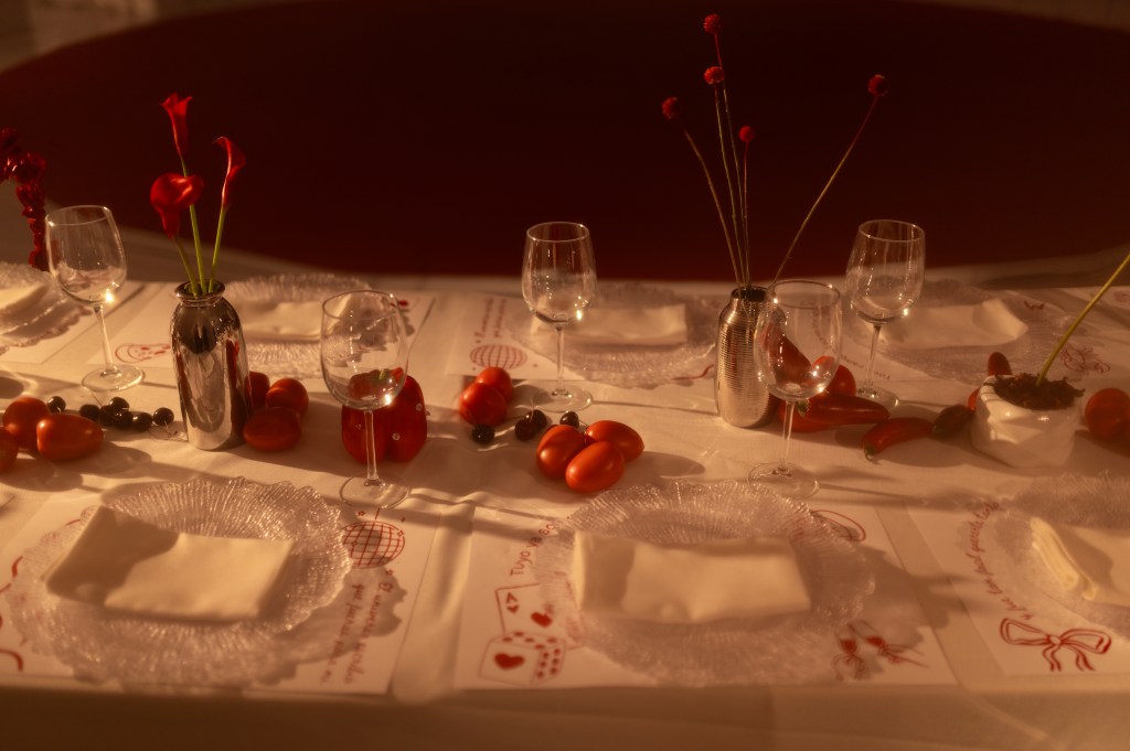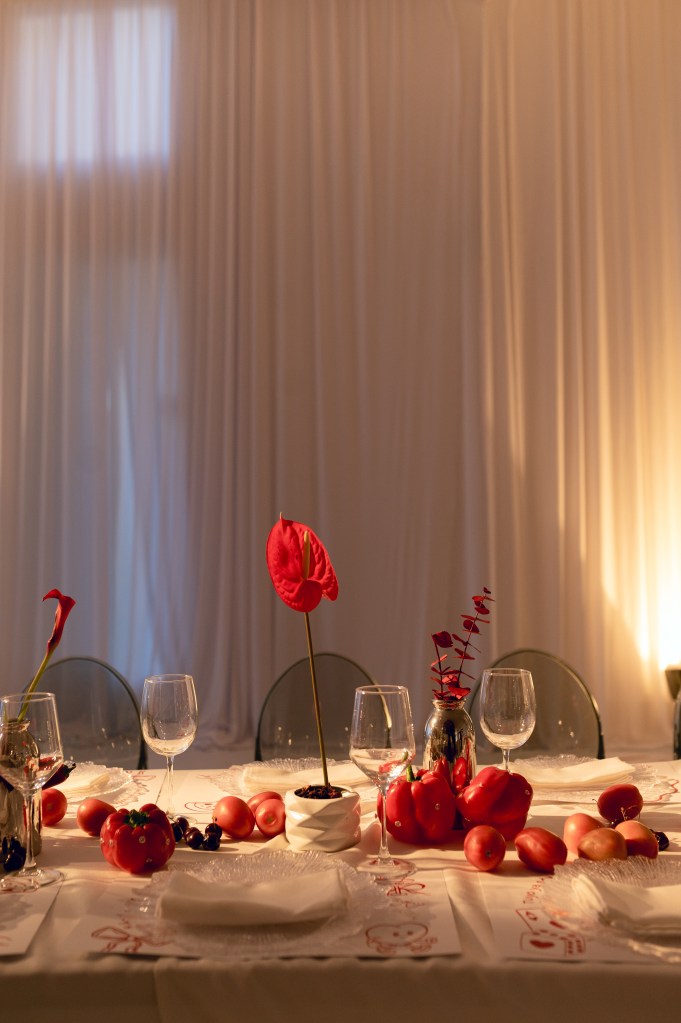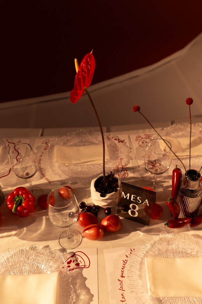 Sobre manteles blancos se dispusieron platos transparentes con textura de cristal, dibujos ilustrativos en las bases, frases personales y objetos cotidianos elevados a arte. Un gran dosel rojo colgante, en forma de corona textil, presidía el centro de la escena con dramatismo teatral, envolviendo a los presentes en un gesto de intimidad colectiva.