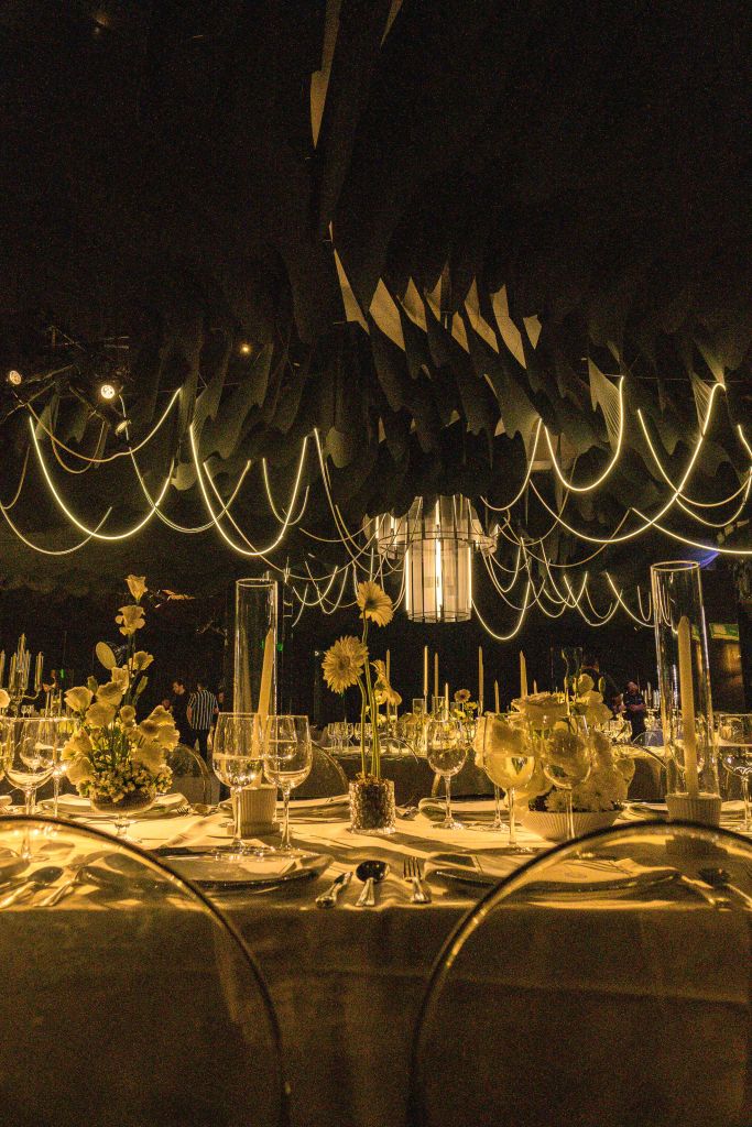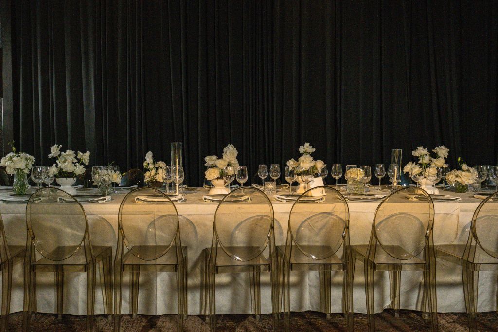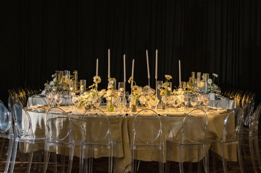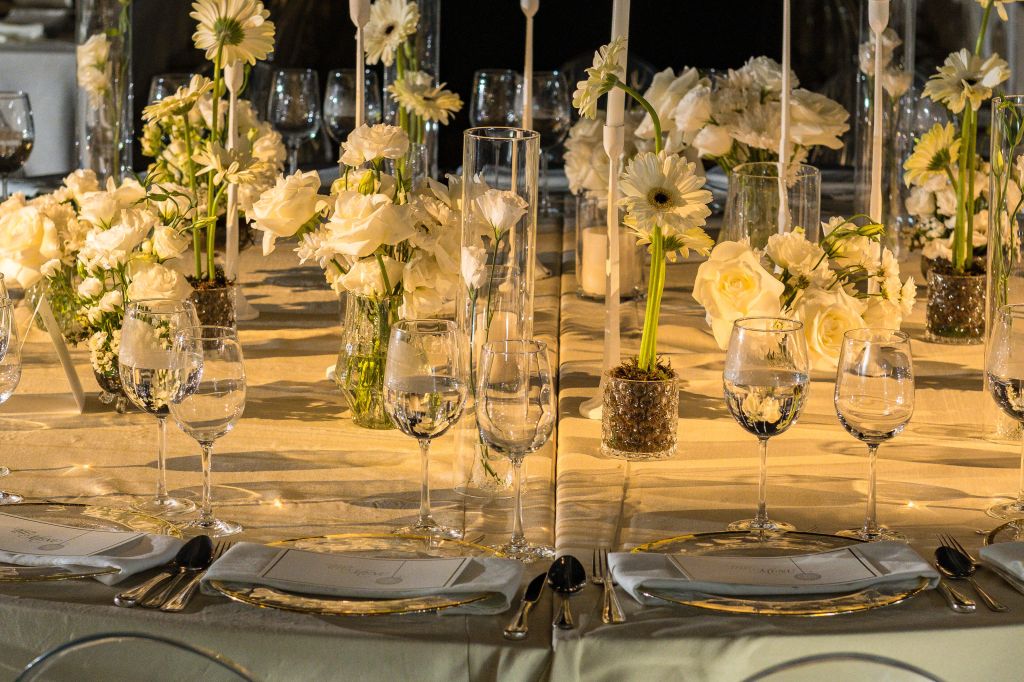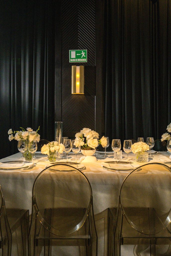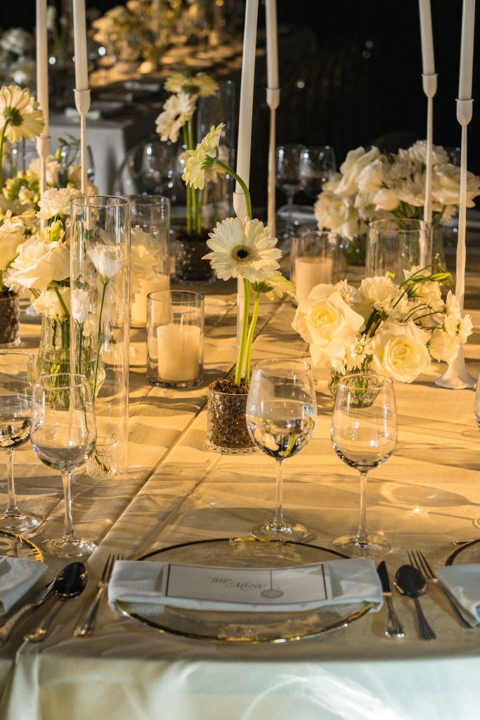 Las mesas, vestidas de marfil sobrio, se iluminan con el fulgor cálido de candelabros de cristal y centros de mesa de flores blancas que brotan de la sombra.