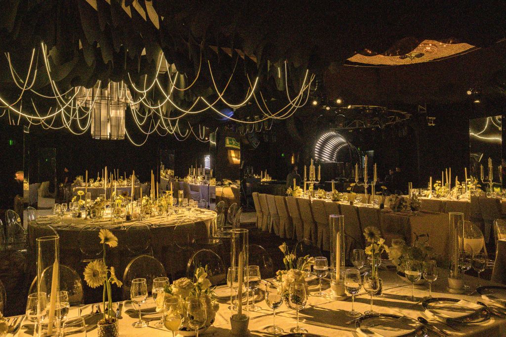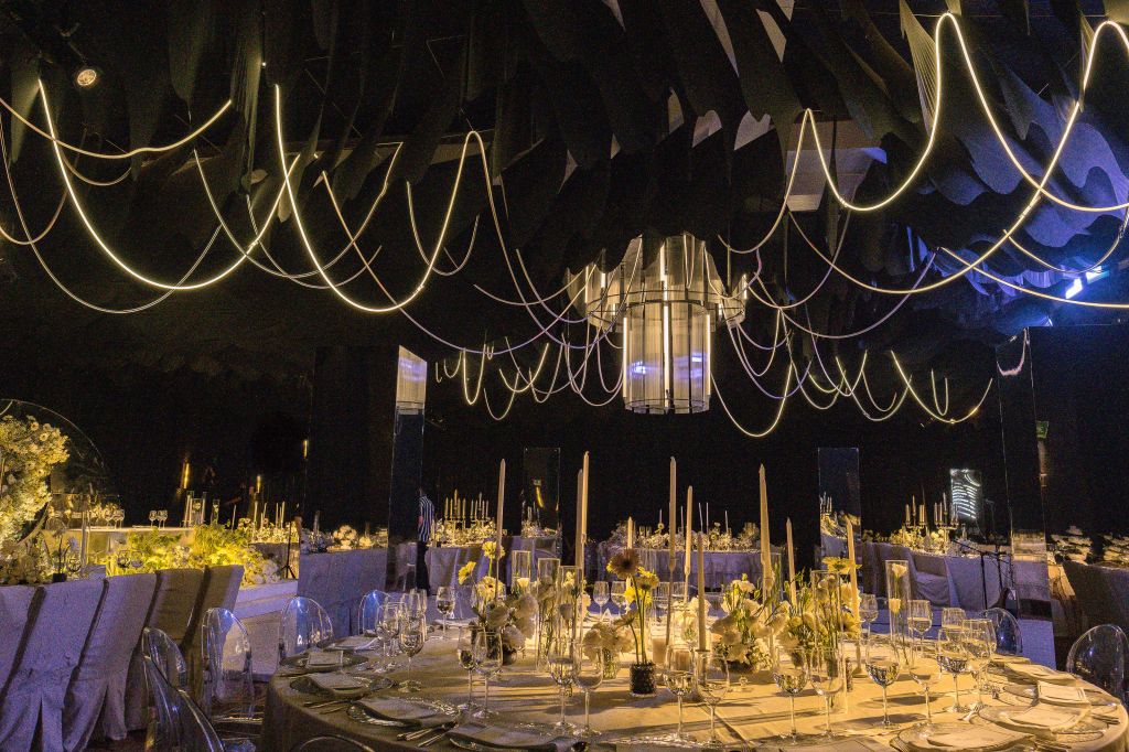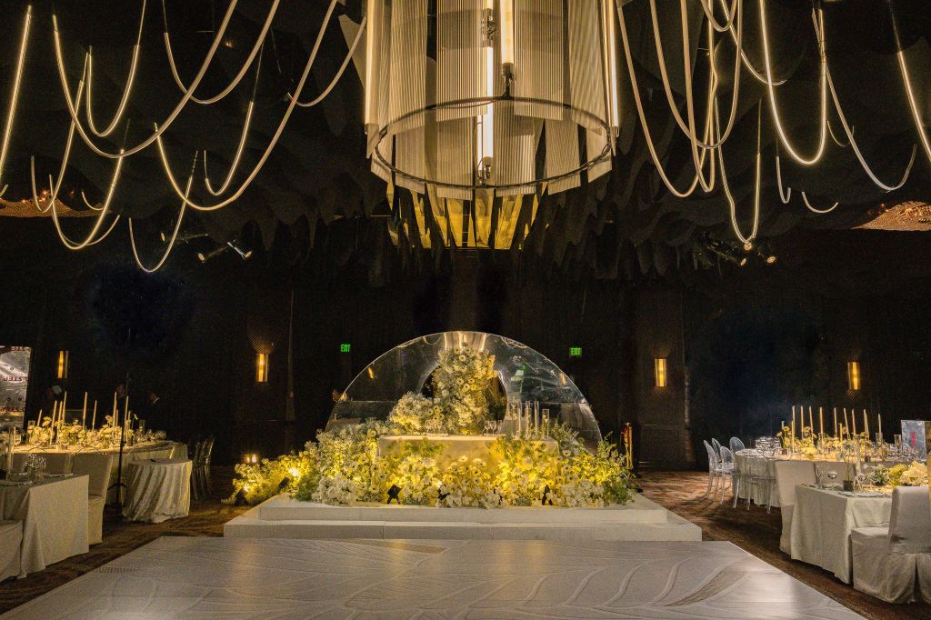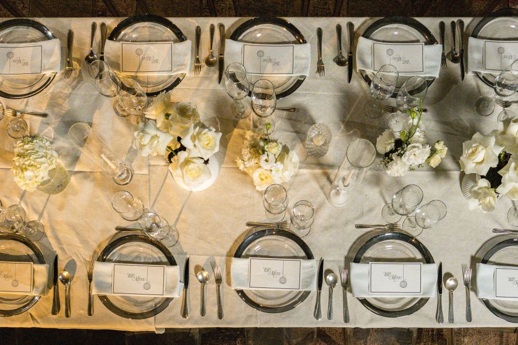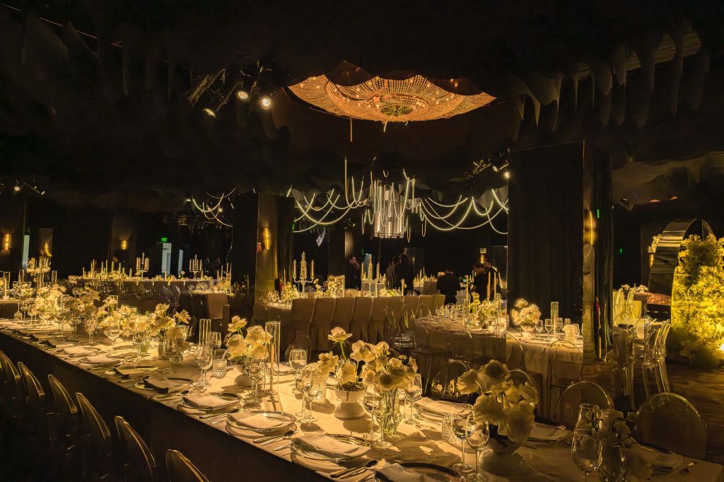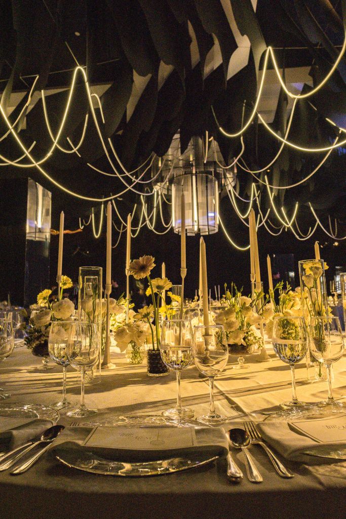 Las mesas, vestidas de marfil sobrio, se iluminan con el fulgor cálido de candelabros de cristal y centros de mesa de flores blancas que brotan de la sombra.