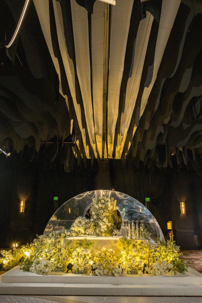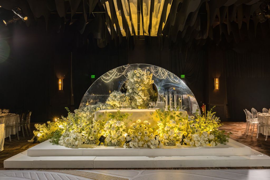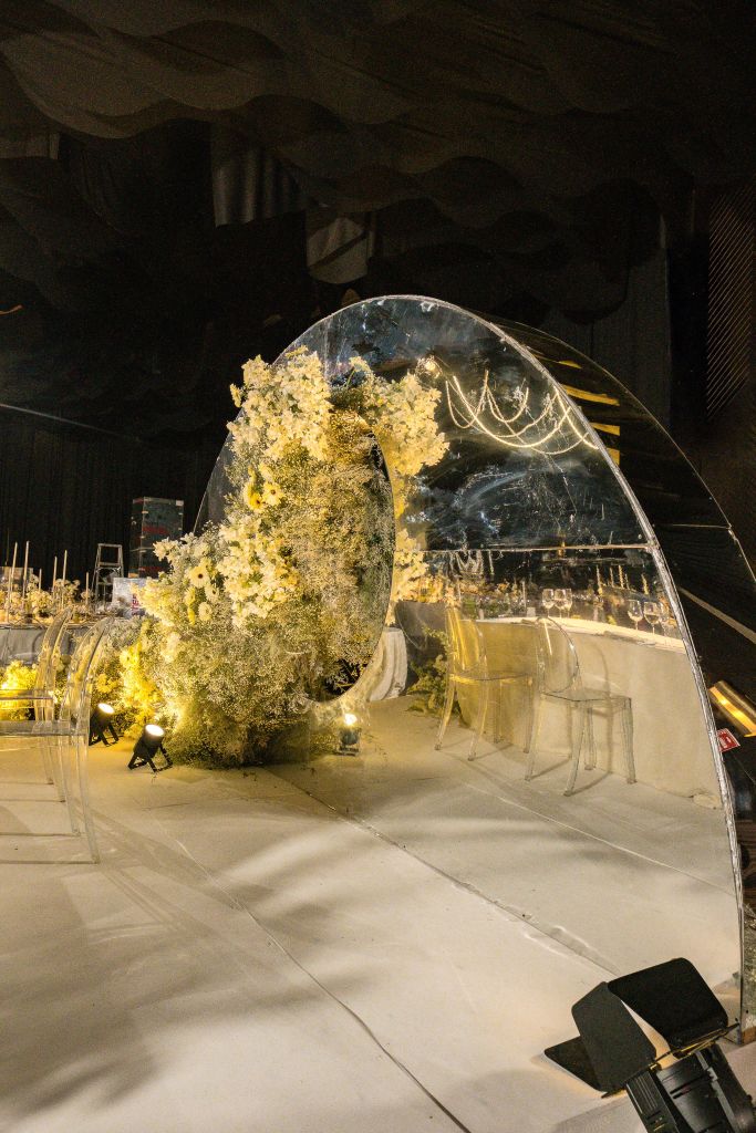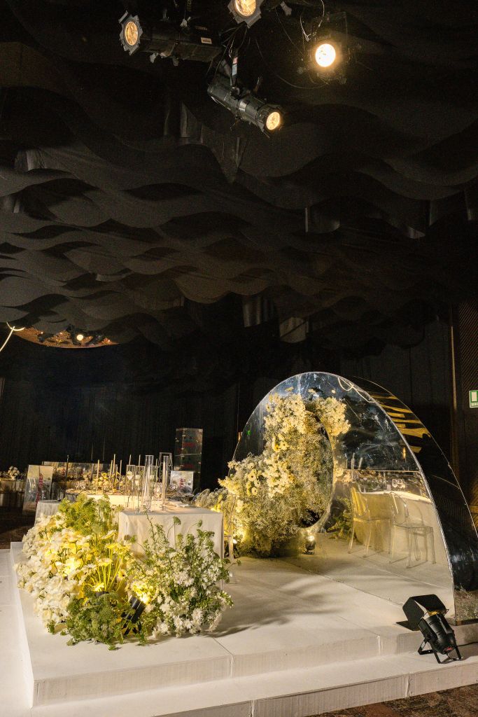 El altar, la mesa principal se erige como reflejo de todo, protegido por un majestuoso domo de espejo y rodeado de un exuberante jardín de flores transformandose en el color de la luz desde una claridad inicial hasta destellos de azul eléctrico para una fiesta interminable.