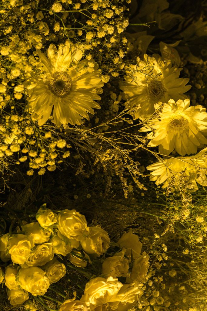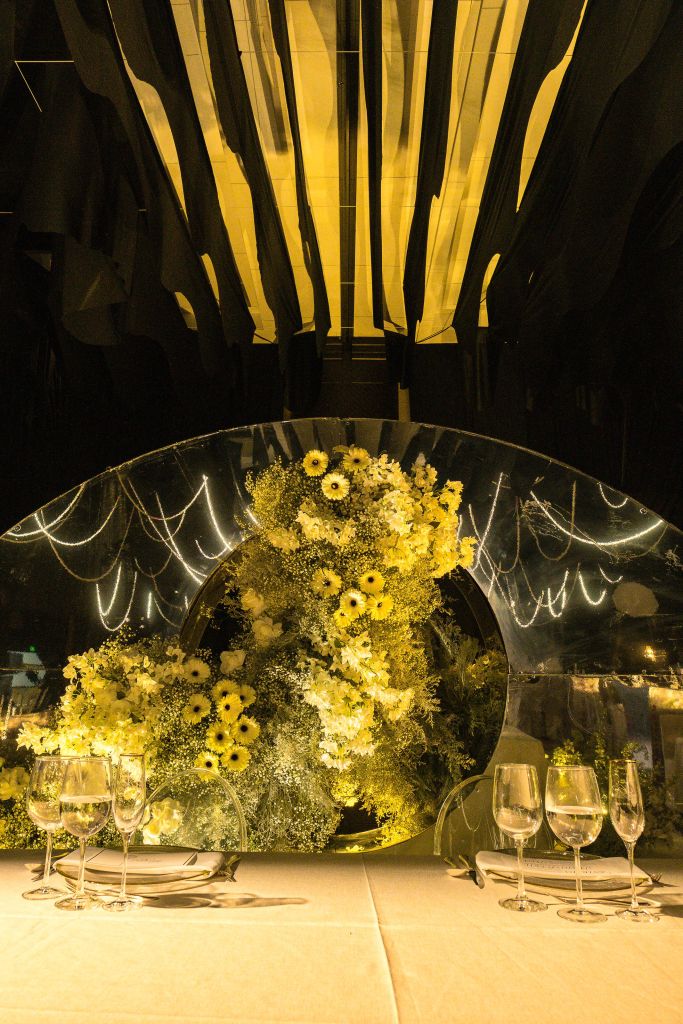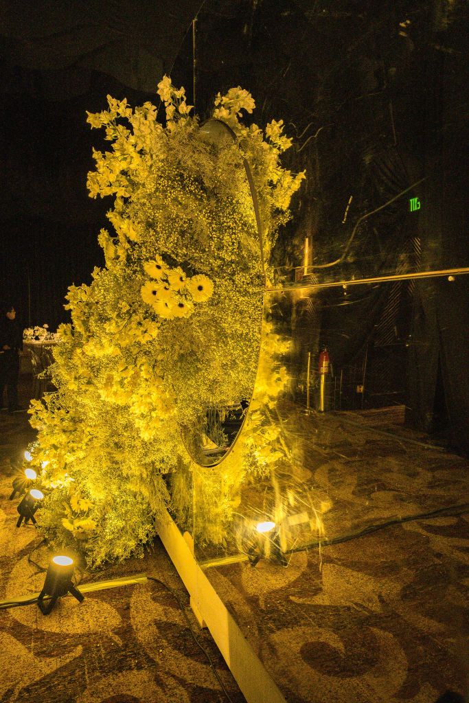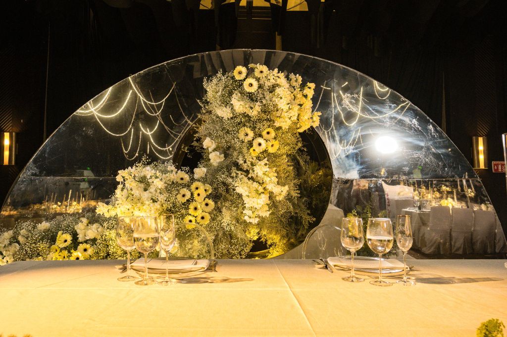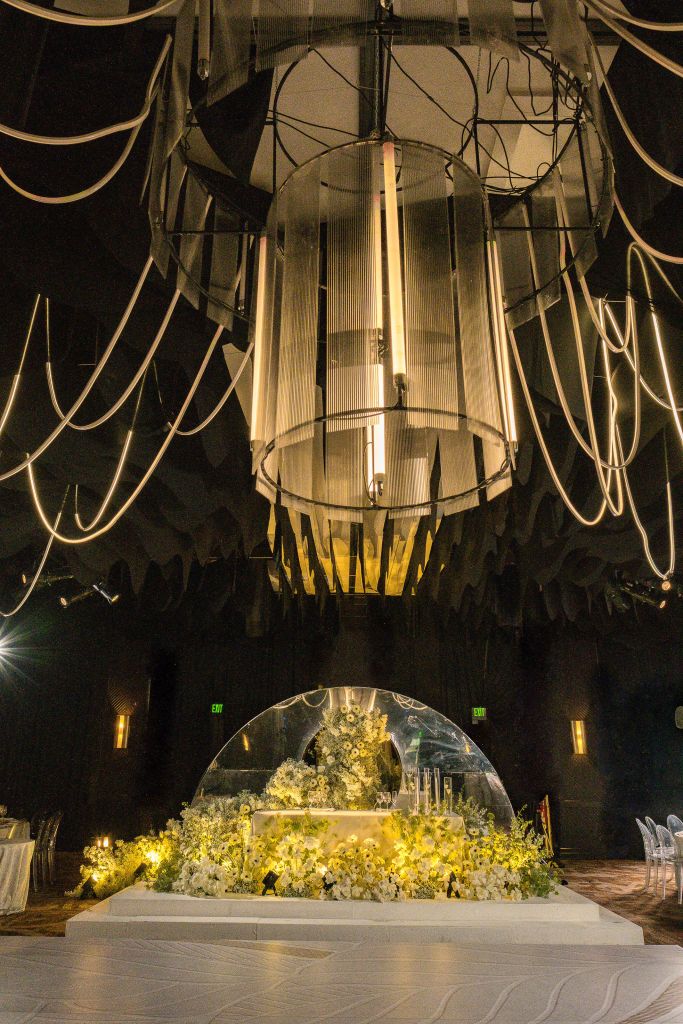 El altar, la mesa principal se erige como reflejo de todo, protegido por un majestuoso domo de espejo y rodeado de un exuberante jardín de flores transformandose en el color de la luz desde una claridad inicial hasta destellos de azul eléctrico para una fiesta interminable.