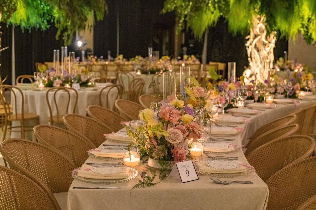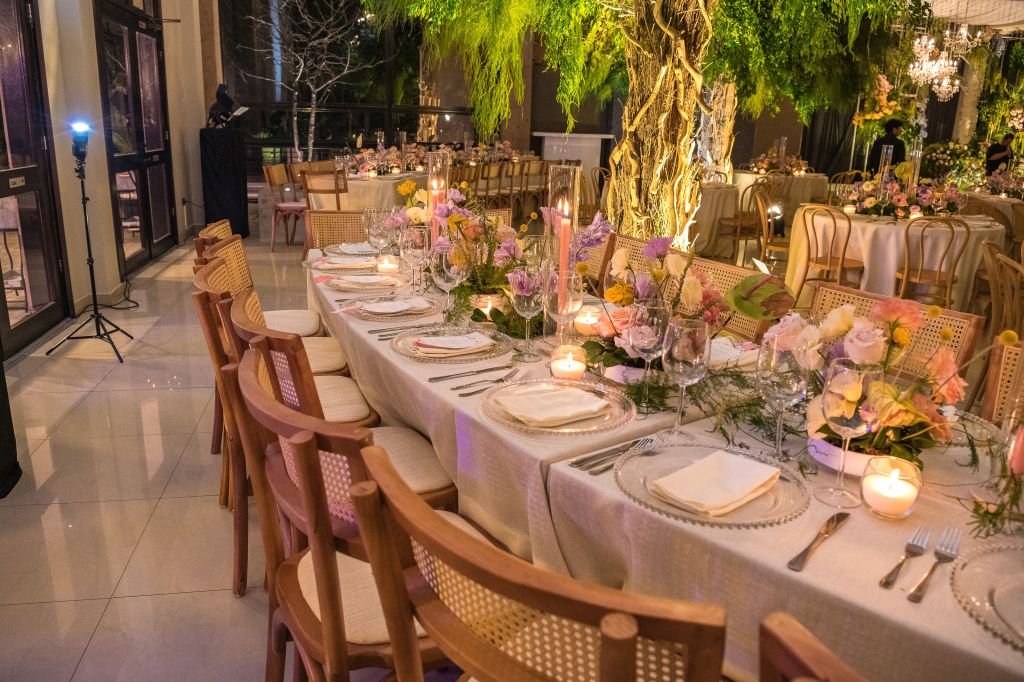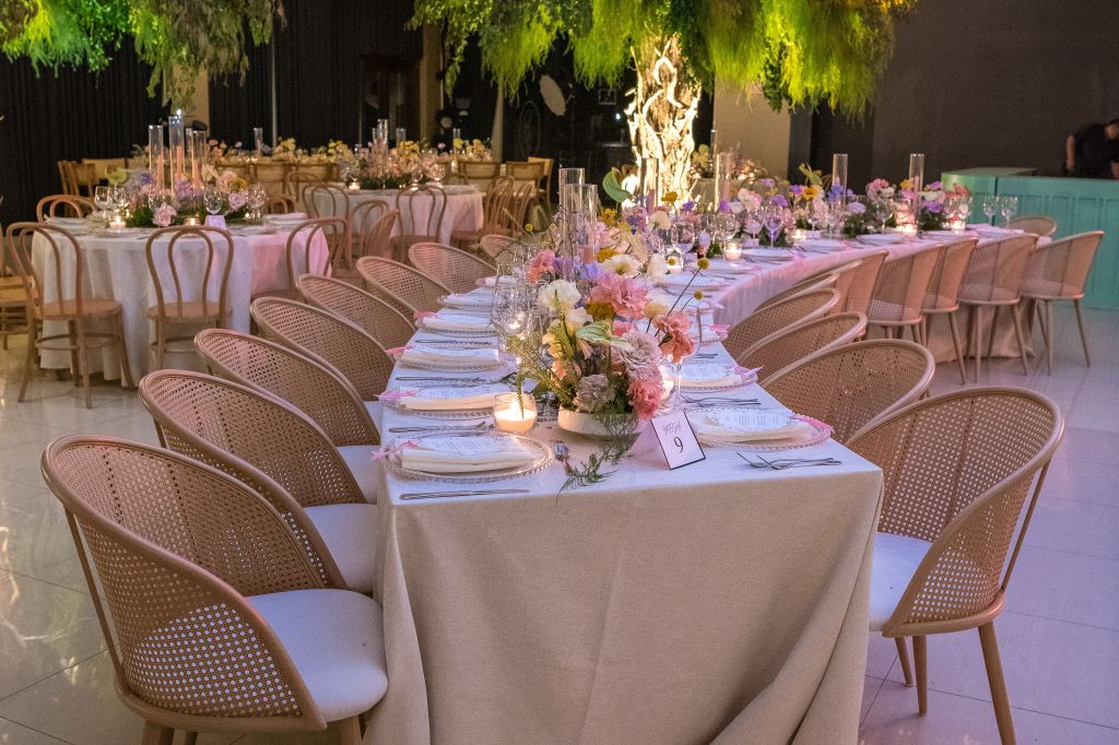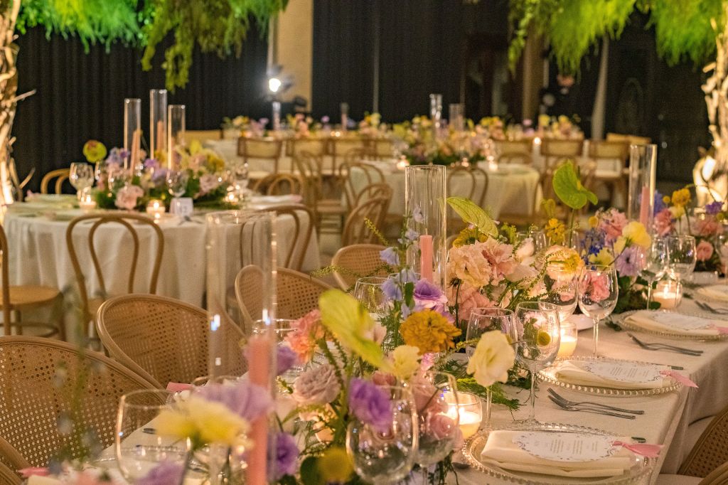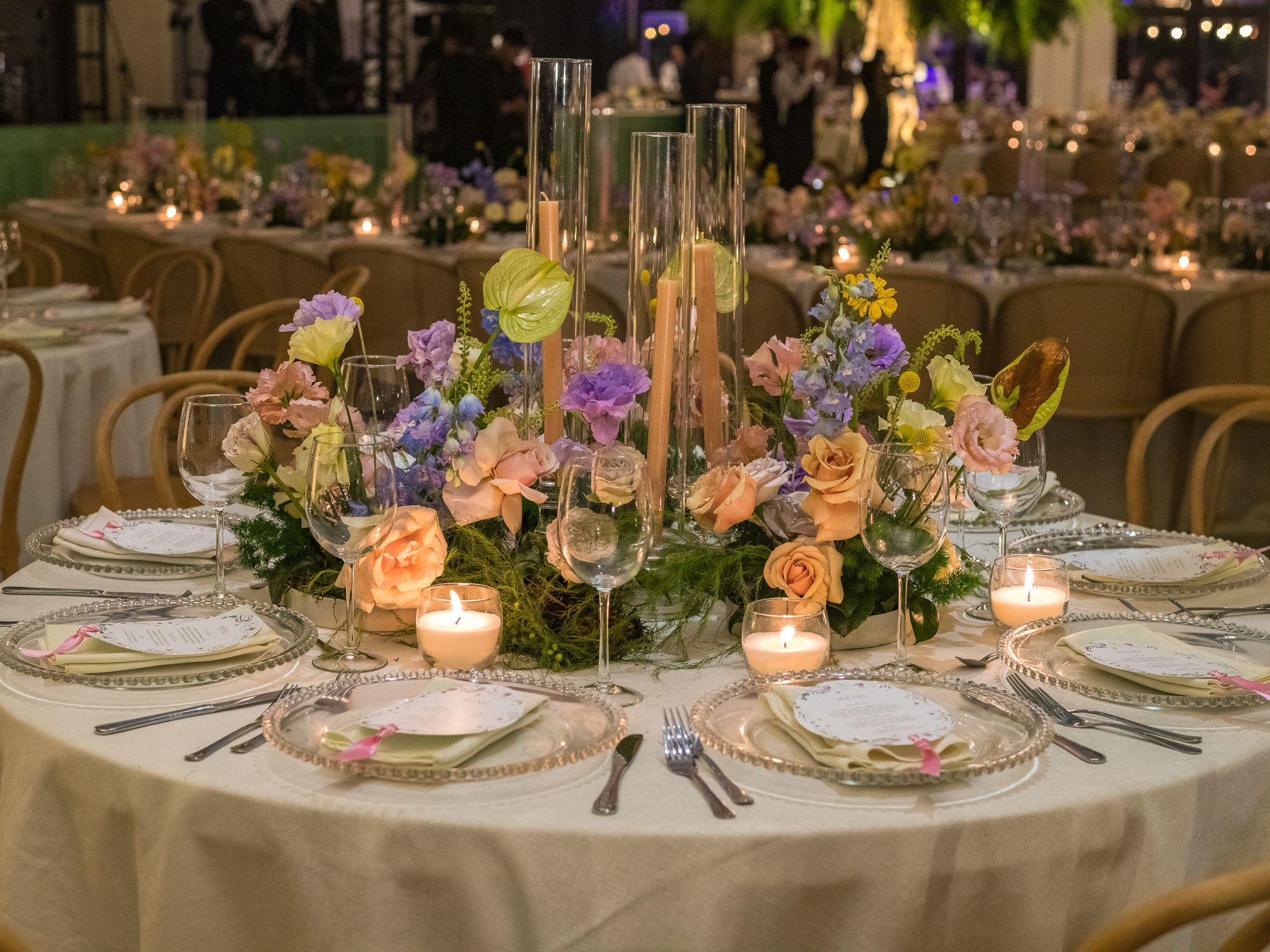Las mesas, dispuestas como un largo paseo floral, estaban adornadas con arreglos exuberantes de lisianthus, rosas y anthurium en tonos lavanda, durazno, rosa pálido y amarillo suave, acompañados por velas altas en cilindros de cristal que bañaban todo con una luz dorada y cálida.