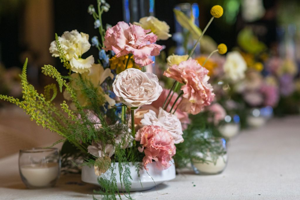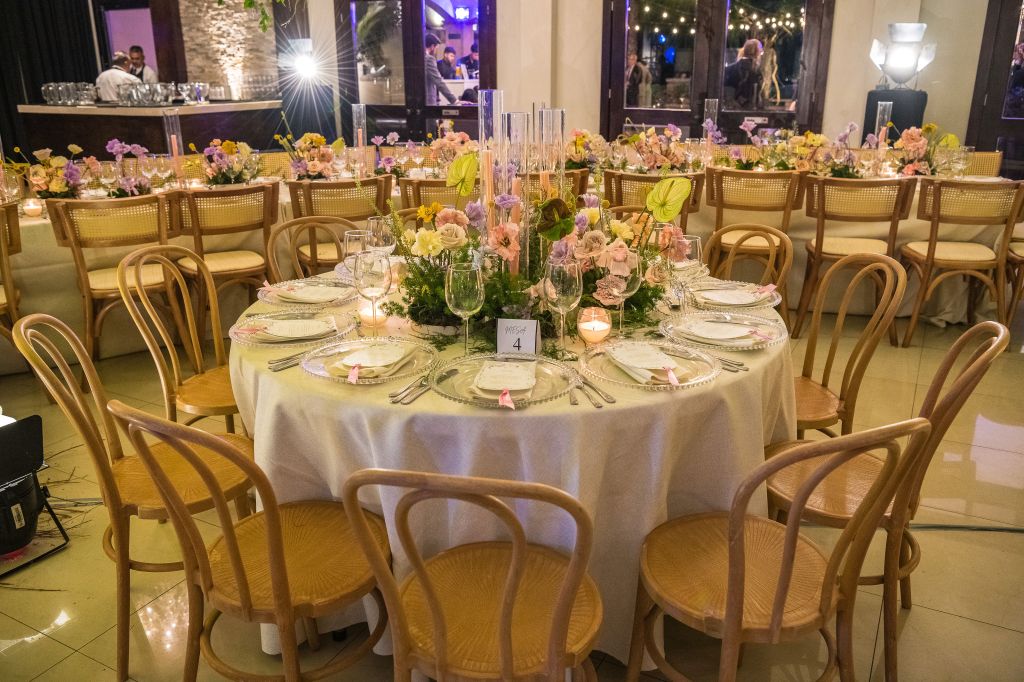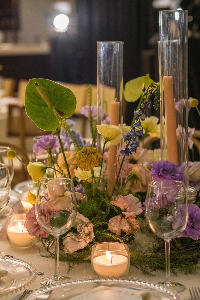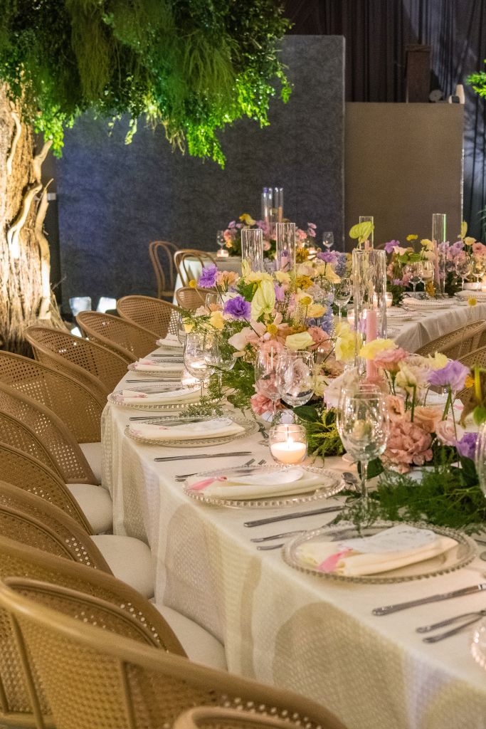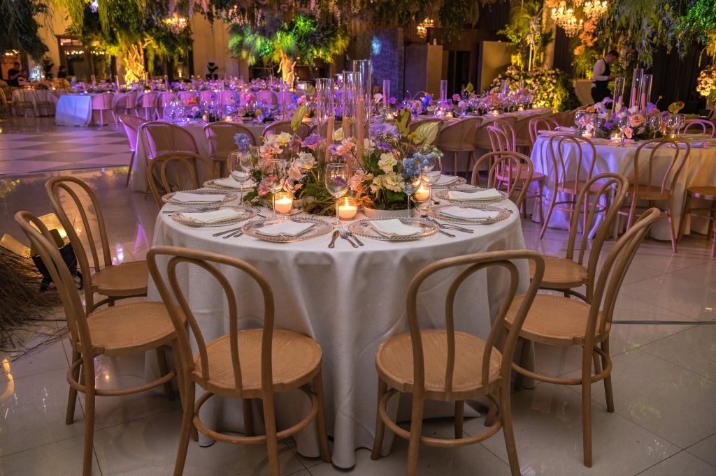 Las mesas, dispuestas como un largo paseo floral, estaban adornadas con arreglos exuberantes de lisianthus, rosas y anthurium en tonos lavanda, durazno, rosa pálido y amarillo suave, acompañados por velas altas en cilindros de cristal que bañaban todo con una luz dorada y cálida.