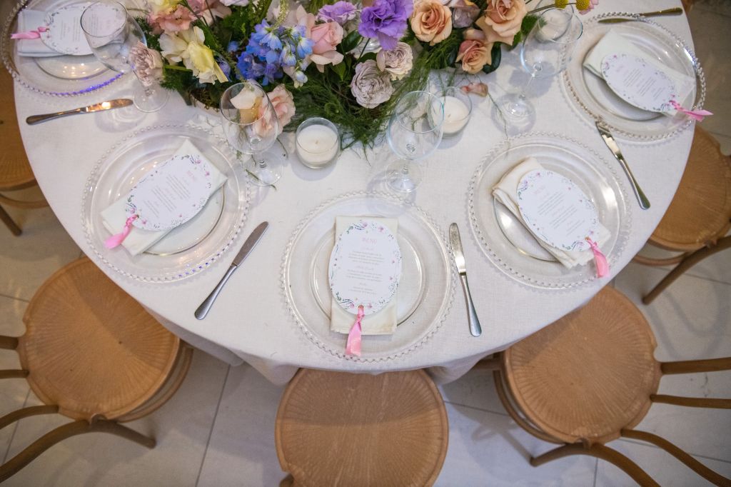 Cada elemento —desde los menús personalizados con lazos de seda hasta los detalles de cristal en la vajilla— reflejaba un estilo elegante, atemporal y profundamente romántico.