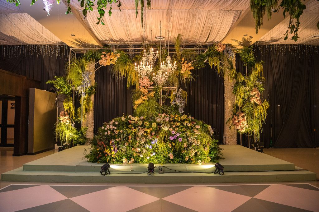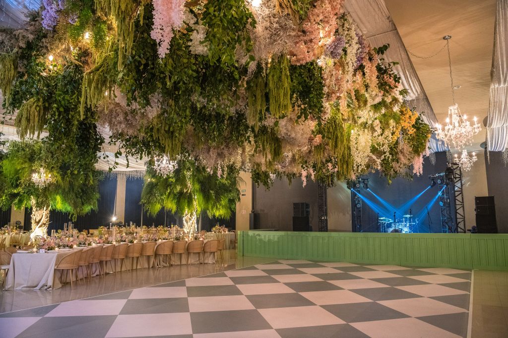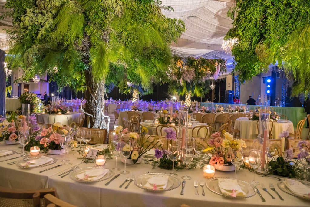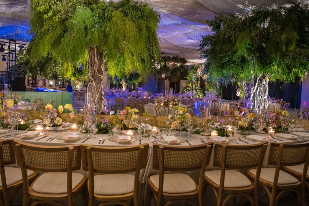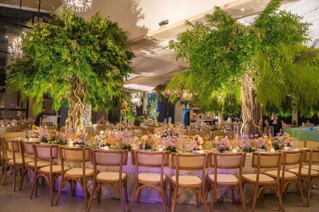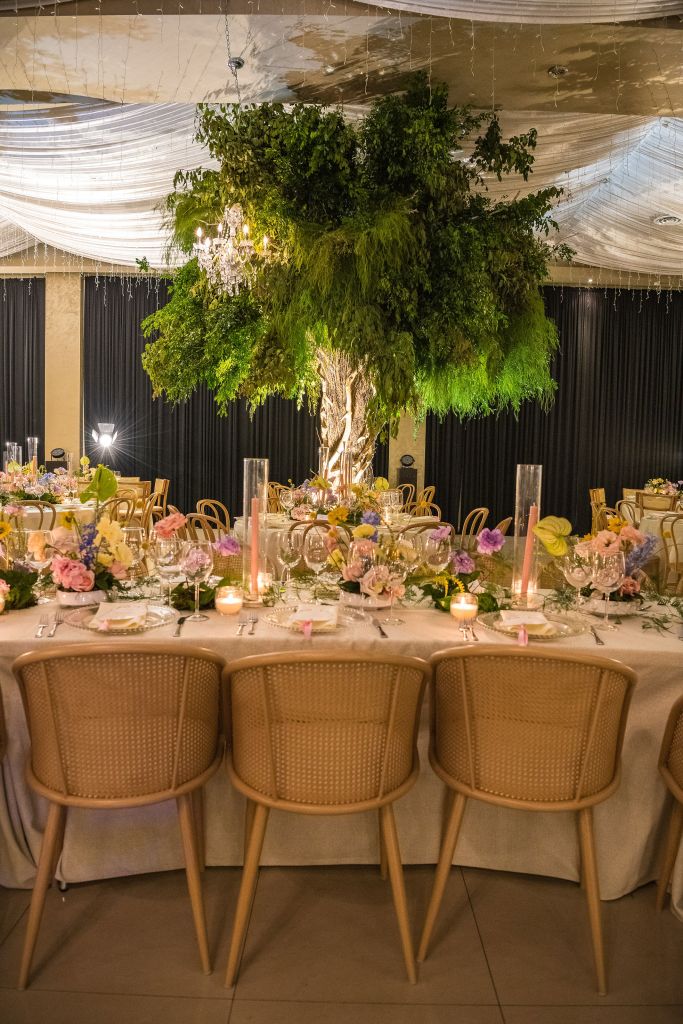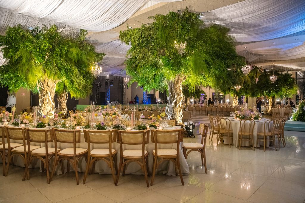 Cada detalle de esta boda fue pensado para contar una historia de romance clásico, envuelta en una atmósfera mágica que parecía sacada de un sueño. Bajo un techo cubierto de follaje y luces tenues, el salón se transformó en un jardín iluminado, donde las flores, las velas y los árboles creaban una armonía perfecta entre lo natural y lo sofisticado.